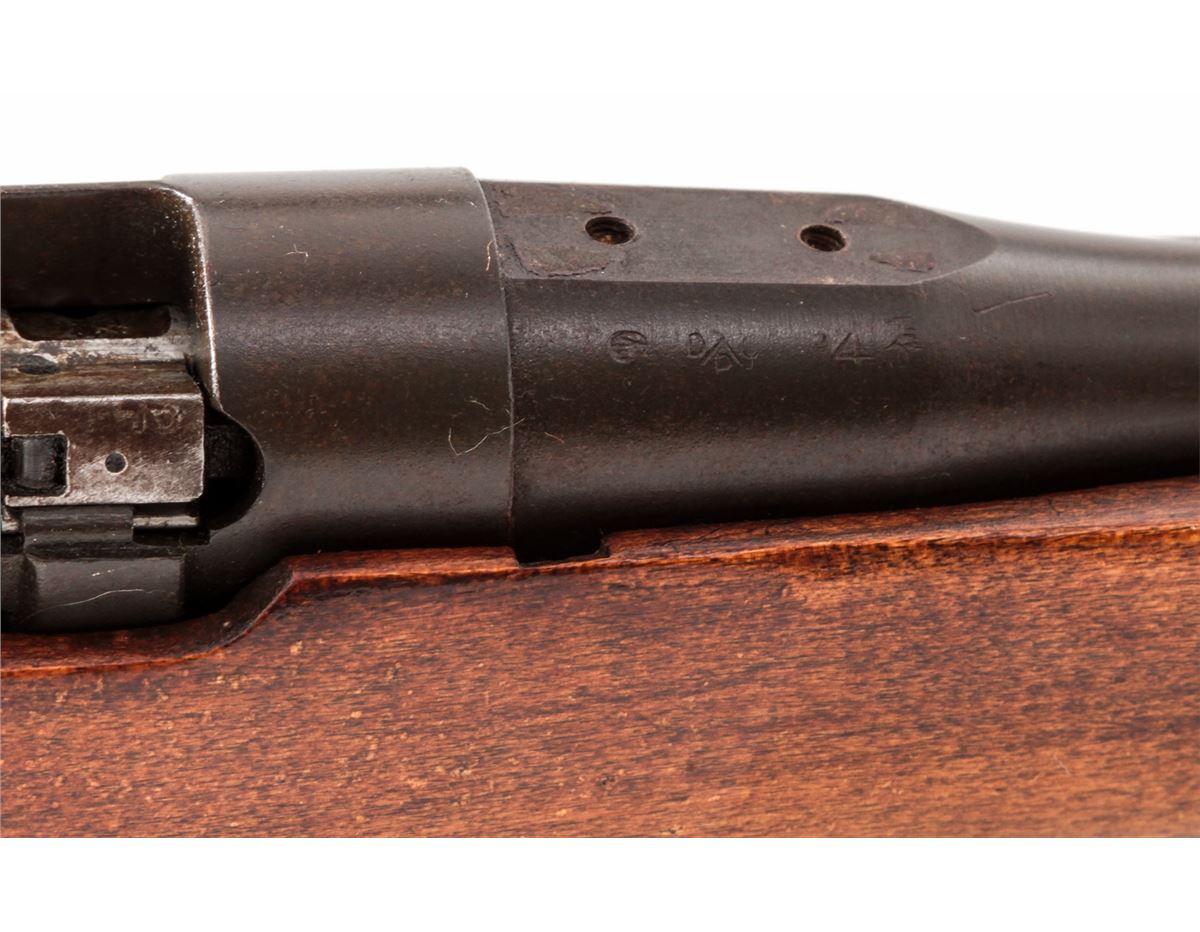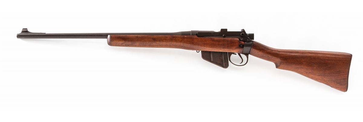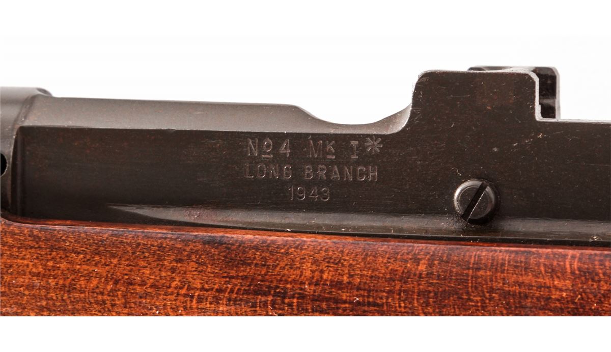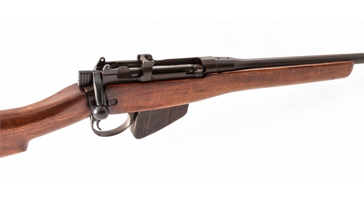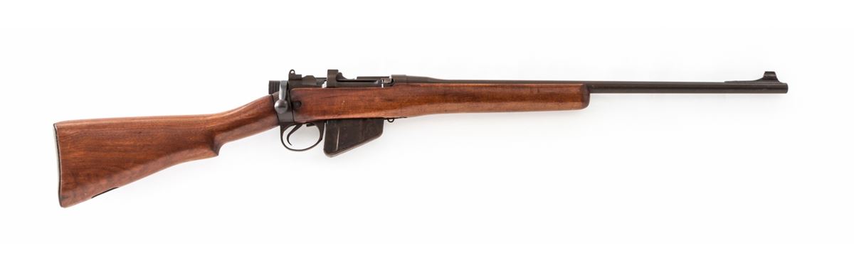 Sporterized No. 4 MK I* Bolt Action Rifle, by Long Branch (1943), #28L2998, .303 cal., barrel shortened to 22'', parkerized finish, sanded and varnished sporterized stock. Condition is fine as modified. Rear sight and sling swivels have been removed; front sight is now a hunter's style ramp. Good action and bore. Est.: $100-$200. (C&R)