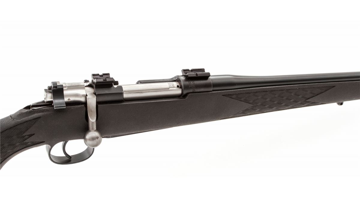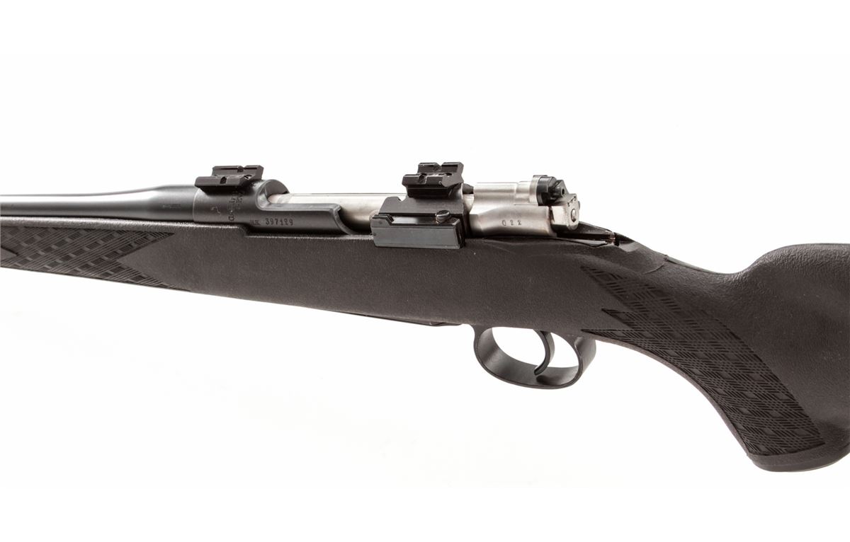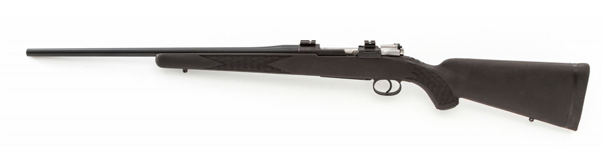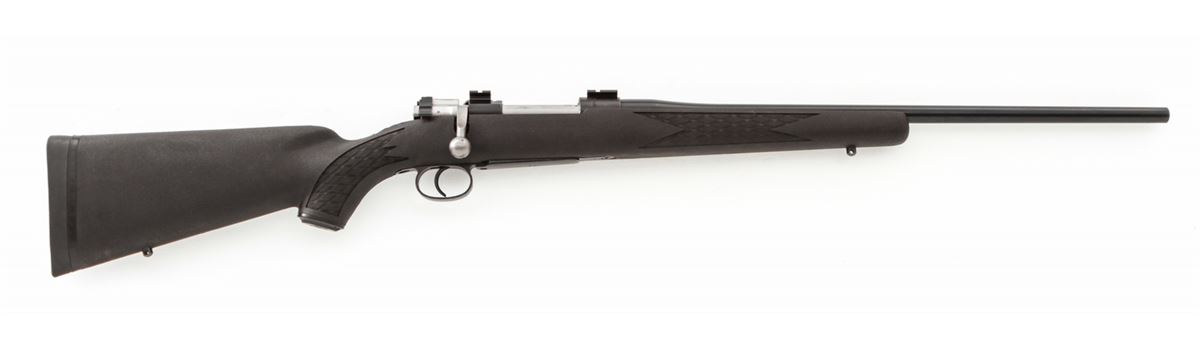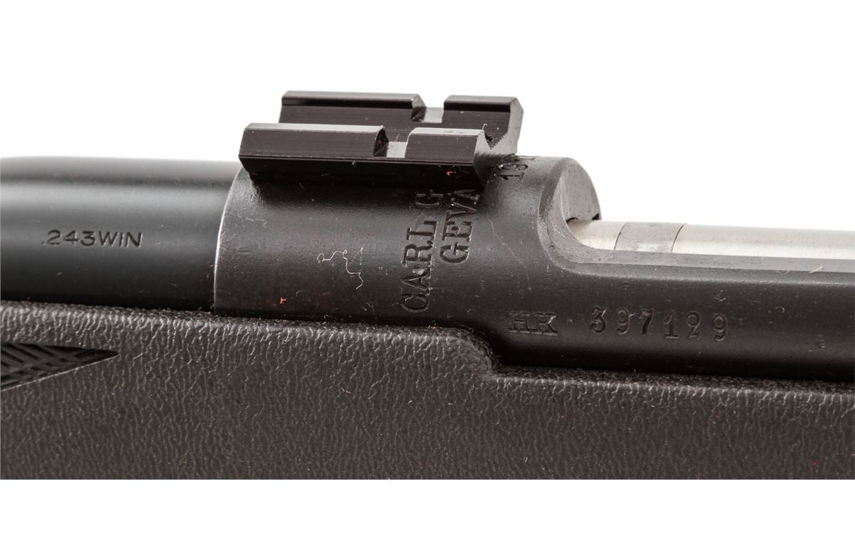 Sporterized Swedish Mauser Bolt Action Rifle, #397129, .243 cal., 22'' barrel, matte blue finish, synthetic black stock, with Weaver scope rings. Barrel is marked ''Kimber of America - M96 Sweden - Sporterized in USA''. Condition is excellent as modified, with good action and mirror bright bore. Est.: $450-$600. (C&R)