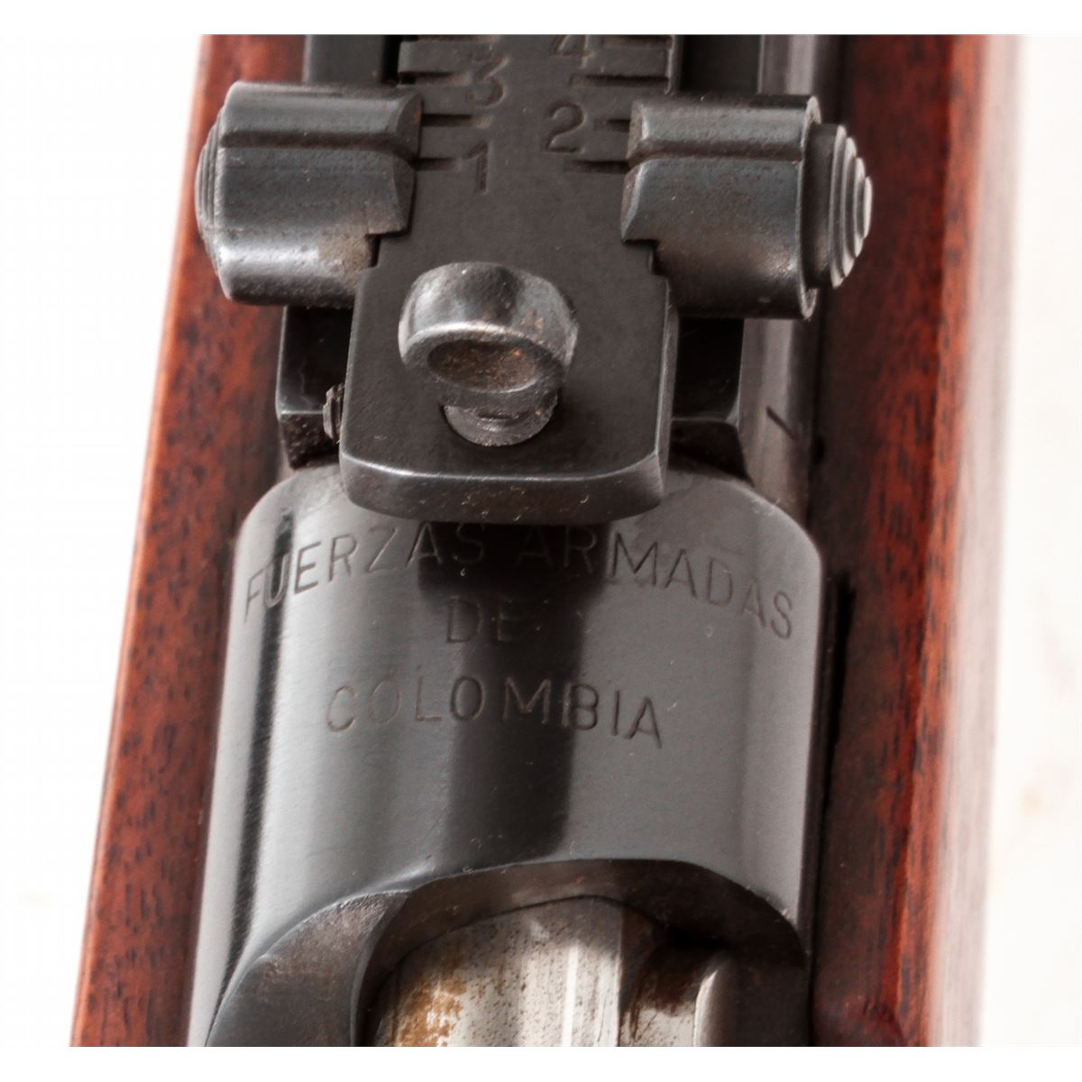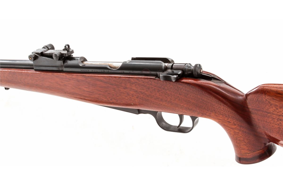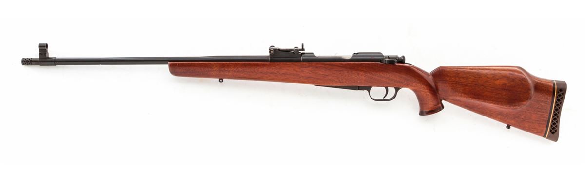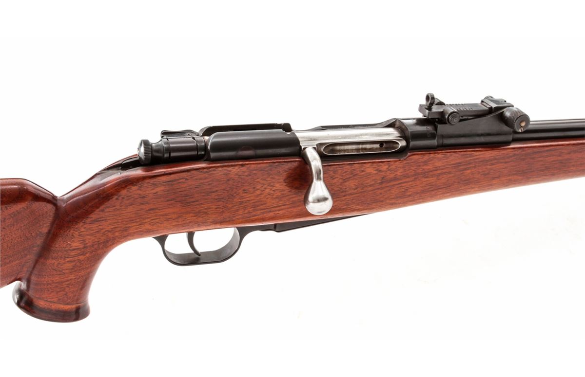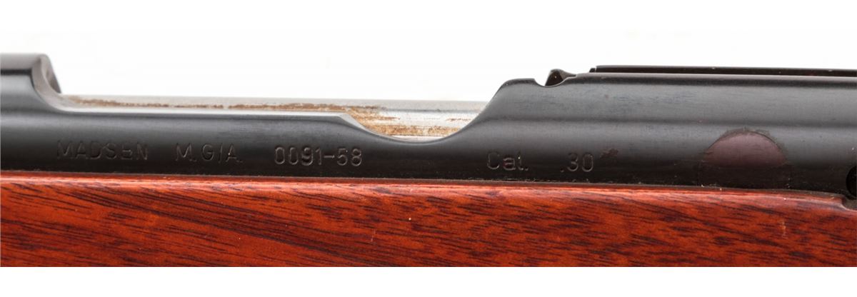 Sporterized Madsen M.G/A Bolt Action Rifle, #009158, .30-06 cal., 22'' compensated barrel, blue finish, bright bolt, custom cheekpiece mahogany stock. Condition is fine to excellent as modified, retaining approx. 96% blue. Stock shows marks from handling. Action is good, bore is mirror bright. Metal appears unaltered. Est.: $250-$450. (C&R)