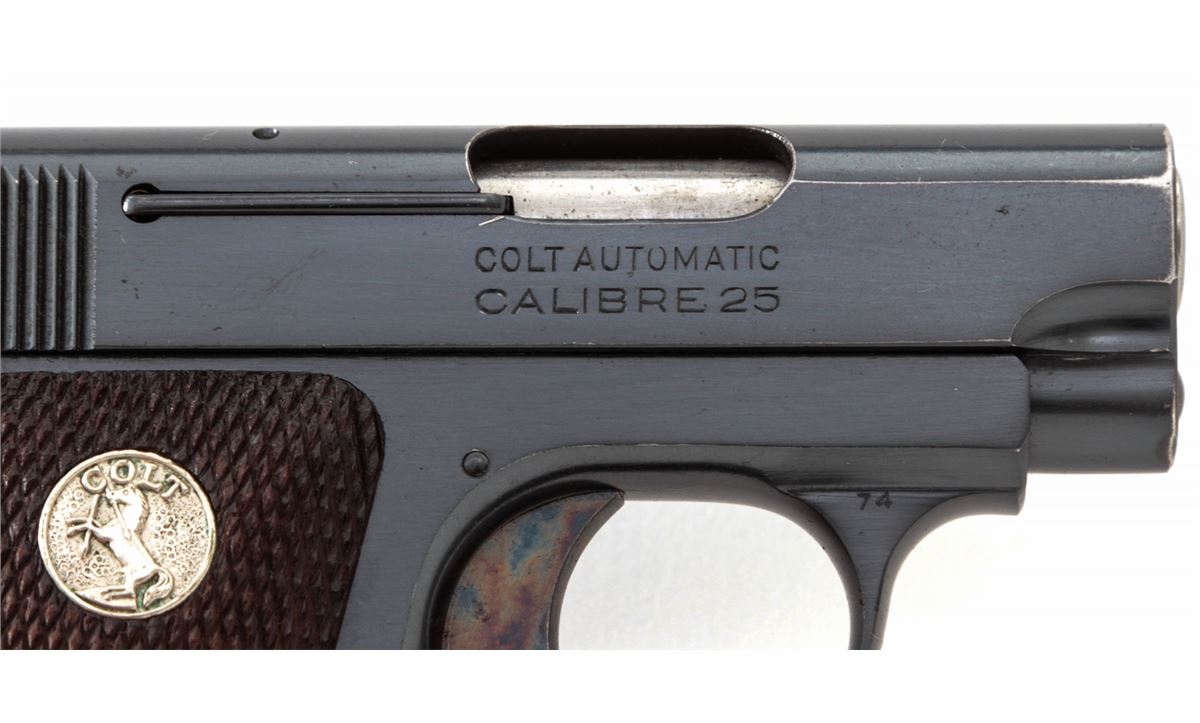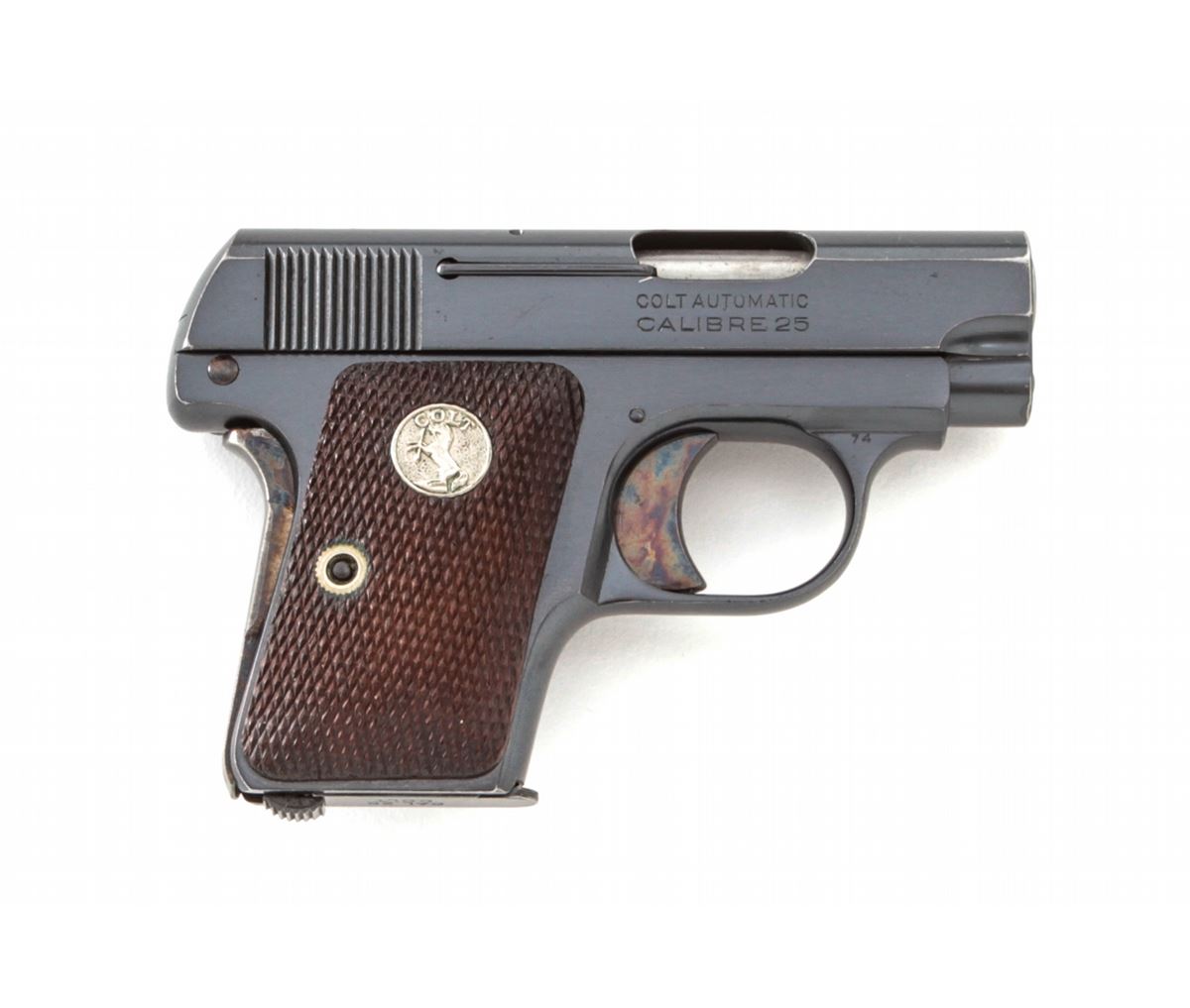 Colt Model 1908 Vest Pocket Semi-Automatic Pistol, #349832, .25 ACP cal., 2'' barrel, blue finish, factory checkered walnut grips, with one magazine. Mfg'd 1925. Condition is excellent retaining approx. 95% blue with light general thinning. Case colored thumb safety, grip safety and trigger retain approx. 92% vibrant hues. Grips with mild flattening. Good action and bore. Est.: $450-$600. (C&R/PPT)