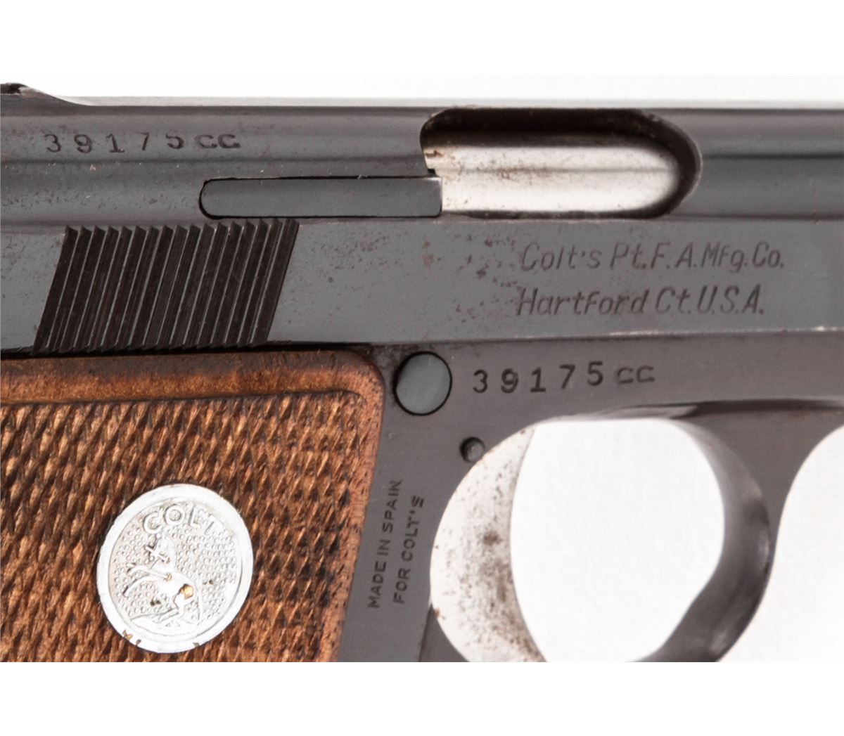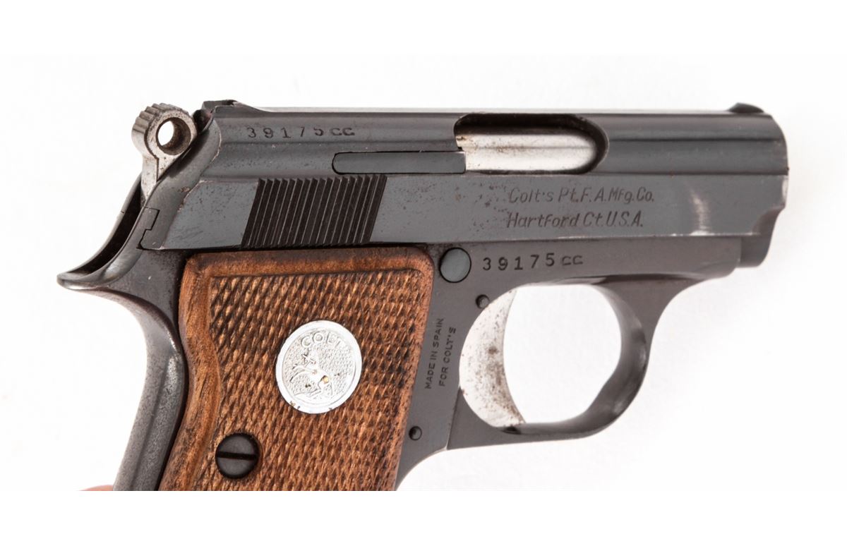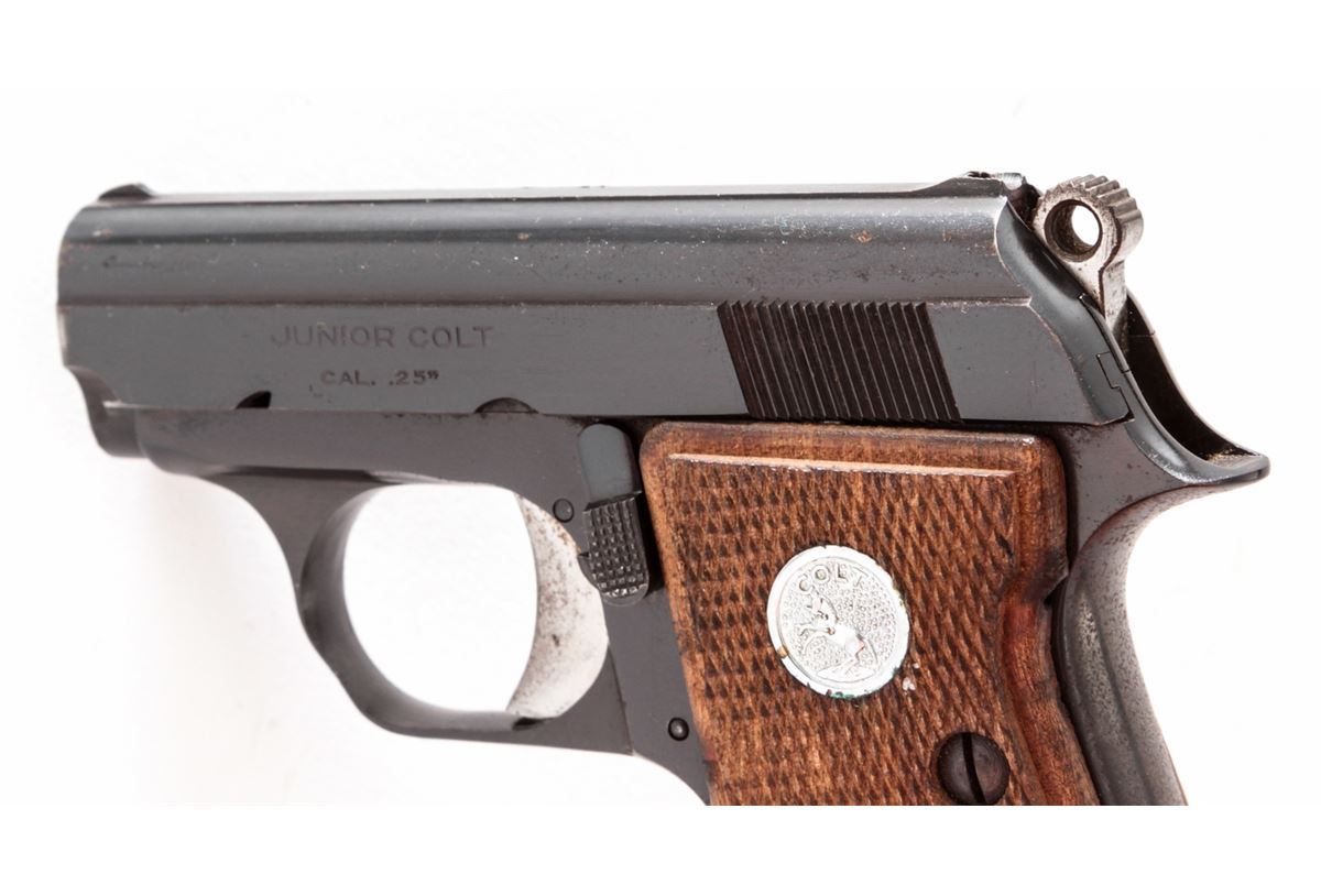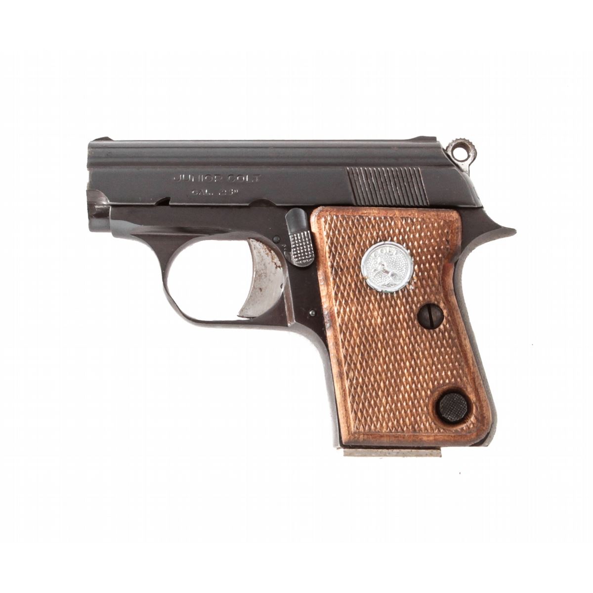 Colt Junior Semi-Automatic Pistol, #39175CC, .25 Auto cal., 2-1/4'' barrel, blue finish, checkered walnut grips with Colt medallions, and one bright magazine. Condition is fine to near excellent with light thinning at muzzle and toning to backstrap. Good grips, action and bore. Est.: $200-$400. (C&R/PPT)