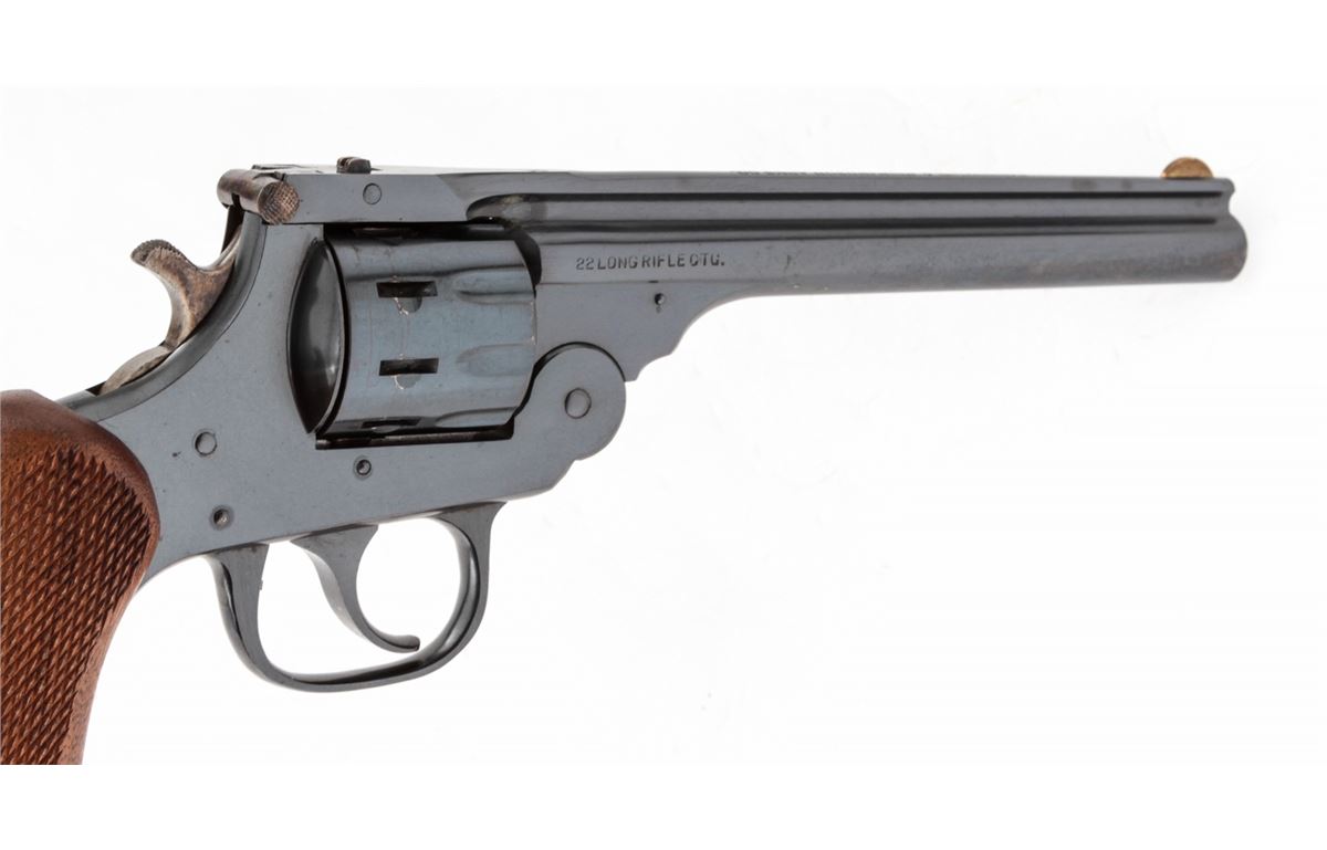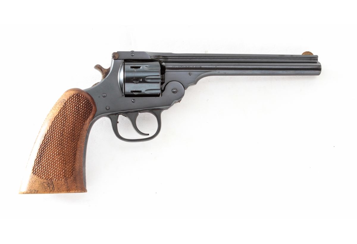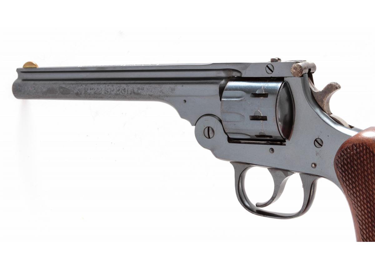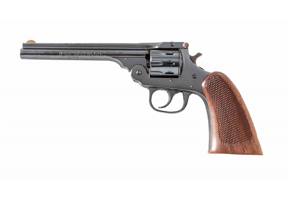 H&R .22 Special Double Action Revolver, #597223, .22 LR cal., 9-shot, 6'' barrel, blue finish, oversized factory checkered walnut grips, with brass front sight. Condition is excellent showing little use, with light scuffs and scratches from handling. Est.: $250-$450. (C&R/PPT)