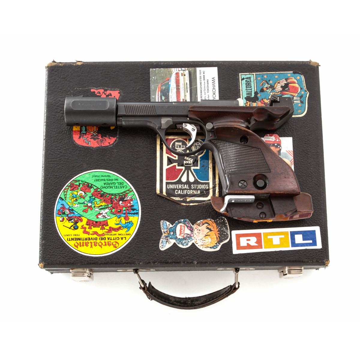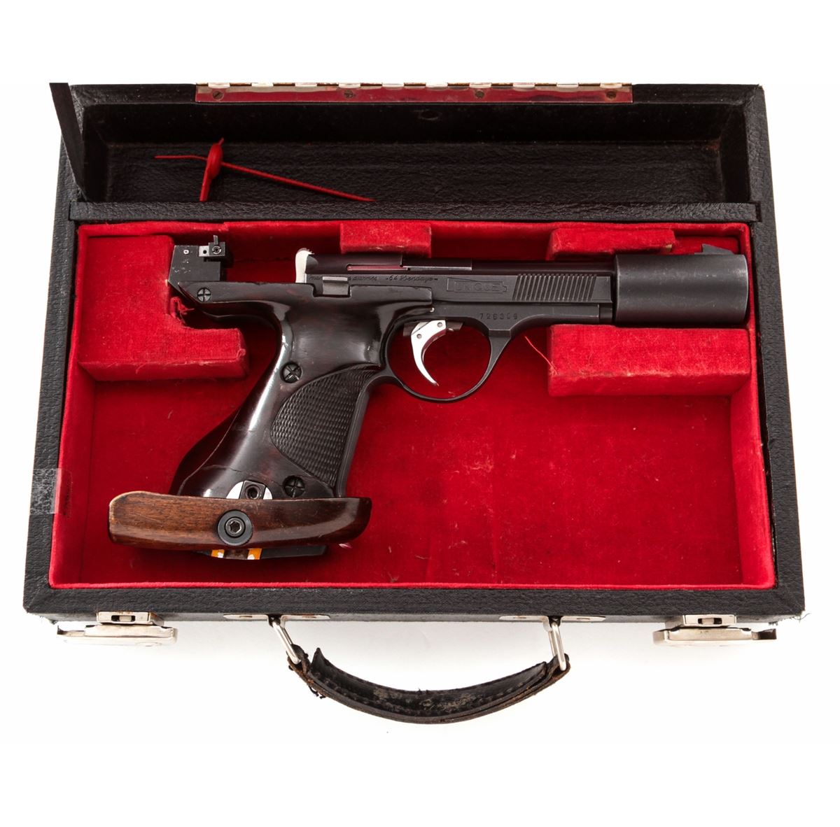 French Unique DES/69 Semi-Automatic Target Pistol, #726309, .22 LR cal., 5-3/4'' barrel, matte finish, adjustable checkered factory target grips, with removable factory barrel weight. In original French case with instructions, test target and associated paperwork. Condition is near excellent retaining approx. 95% generally thinning blue. Grips with light wear and several repairs. Exterior of case with stickers. Trigger is light, action is crisp, bore is bright. Est.: $300-$500. (C&R)