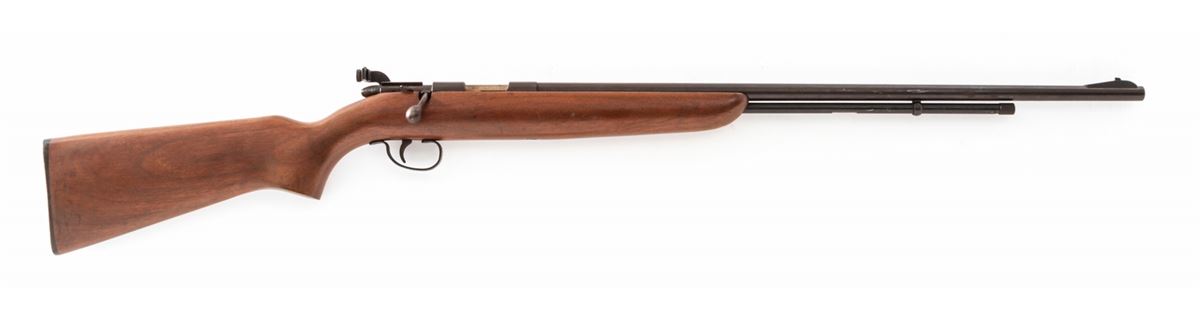 Remington Sportmaster Model 512-P Tube-Fed Bolt Action Rifle, NVSN, .22 S,L or LR cal., 25'' barrel, blue finish, factory peep sight, and walnut stock. Condition is about fine retaining approx. 90% toning blue with some scratches to side of barrel. Stock with minor scuffs. Good action and fine bore. Should clean nicely. Est.: $150-$300. (C&R)