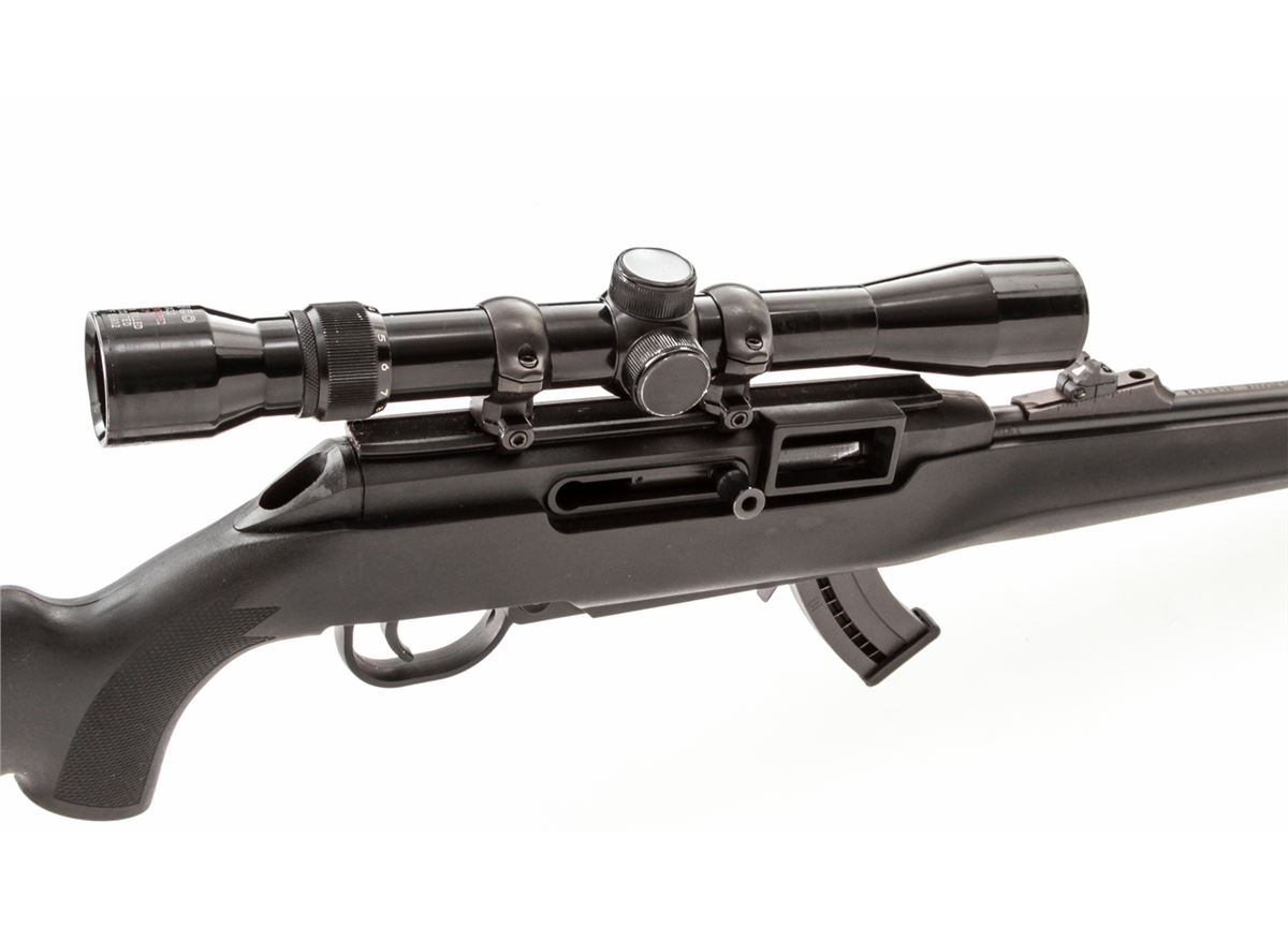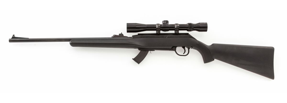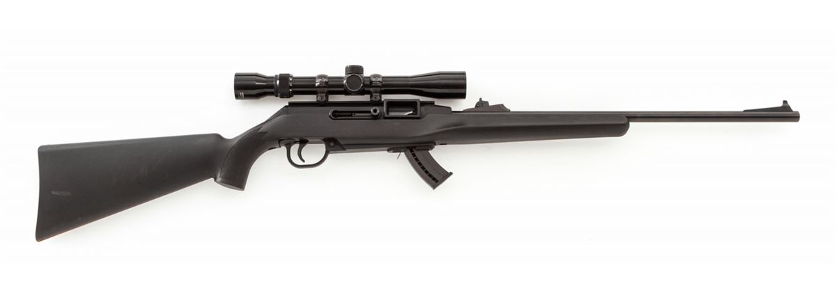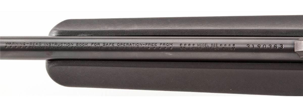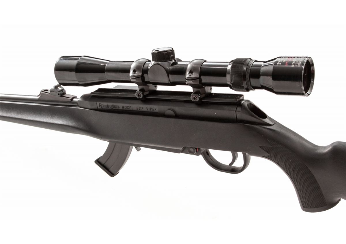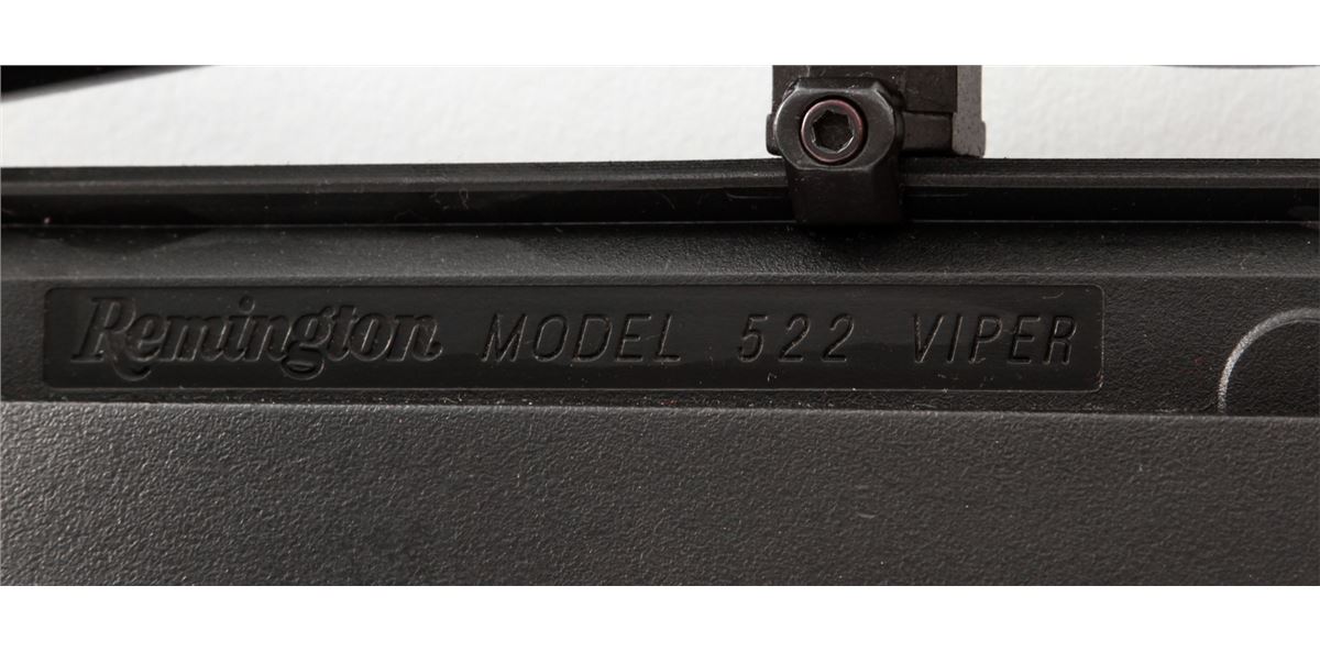 Remington Model 522 Viper Semi-Automatic Rifle, #3190363, .22 LR cal., 20'' barrel, blue finish, black synthetic stock, with Tasco 3-9x32 scope and one magazine. Condition is excellent with just light marks from handling, in original box. Est.: $200-$400. (Modern)