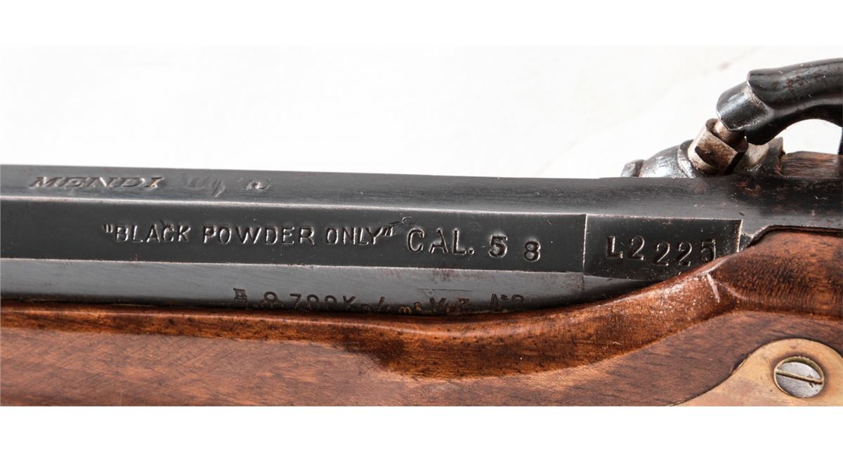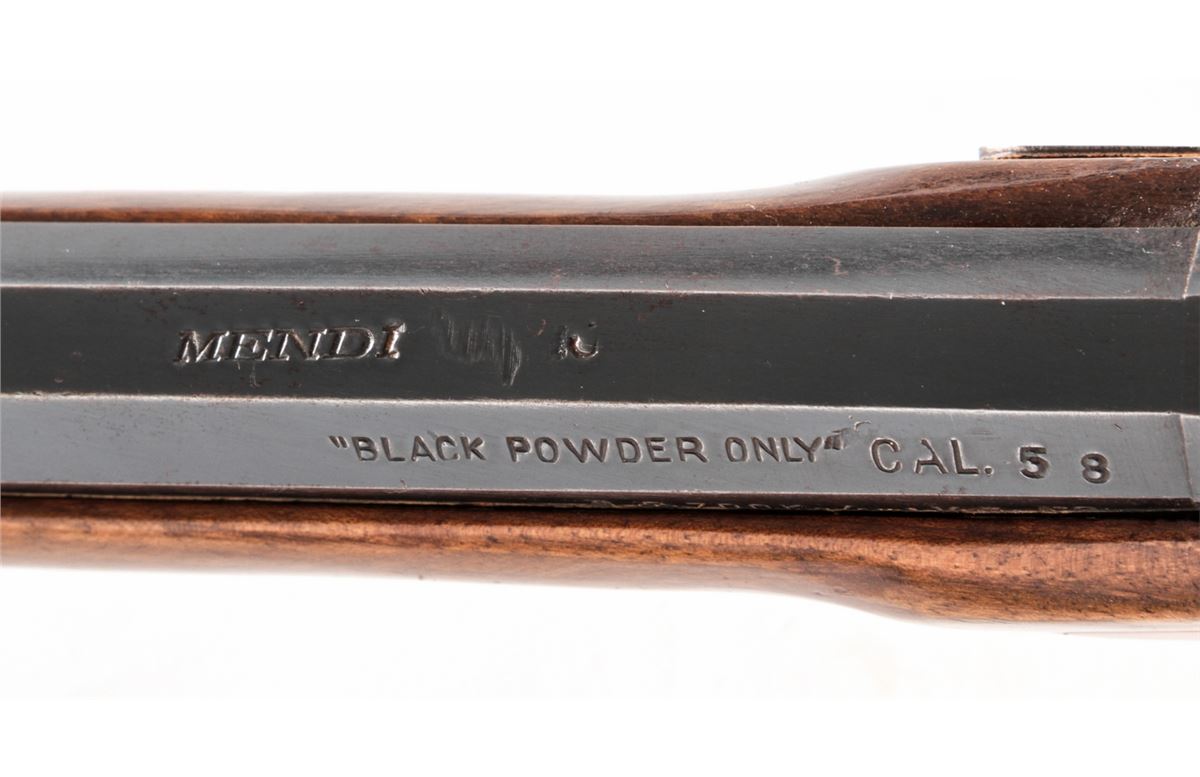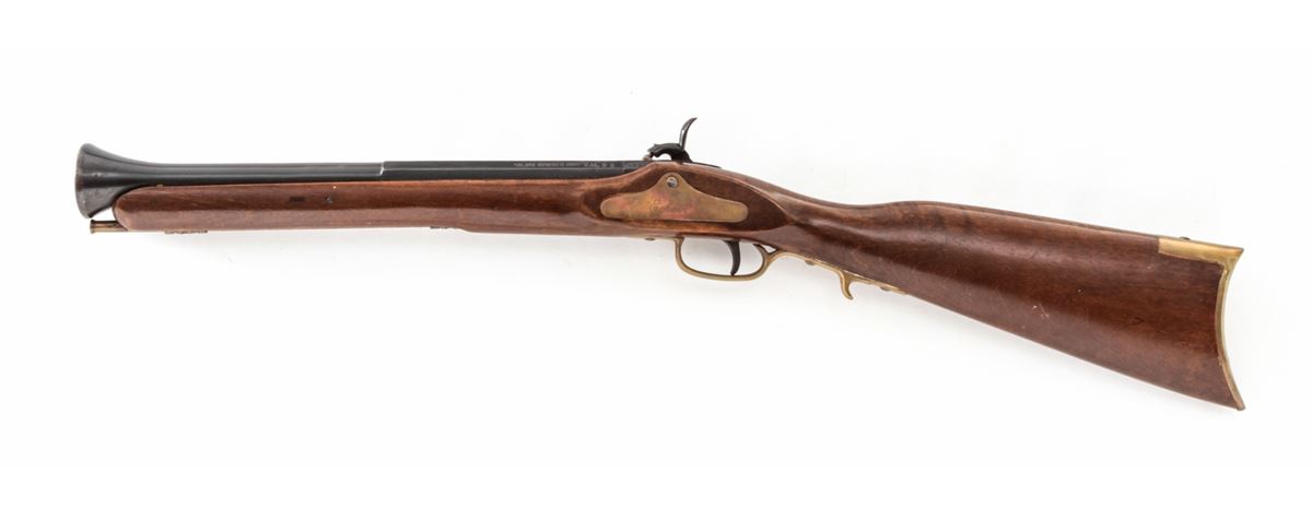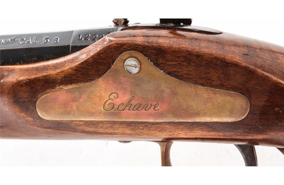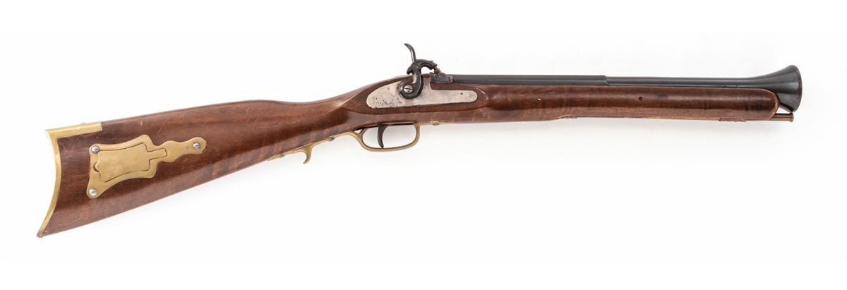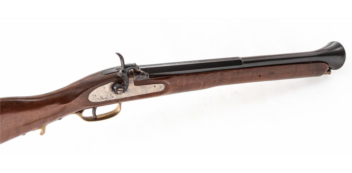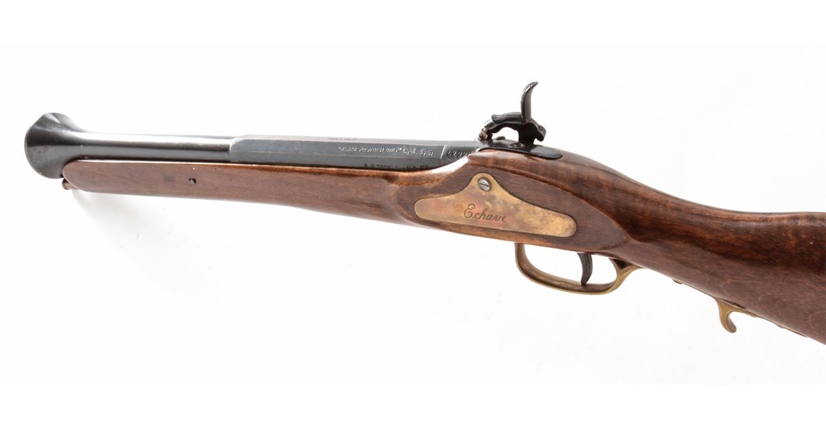 Spanish Copy of a Blunderbuss, by Mendi, #L2225, .58 cal., 14-1/2'' part-round blue steel barrel, case hardened lock, brass furniture and patchbox, dark stained beechwood stock, with sideplate marked ''Echave''. Condition is about fine showing light marks from handling. Hammer does not stay at full cock and needs minor work. Est.: $200-$400. (Antique)