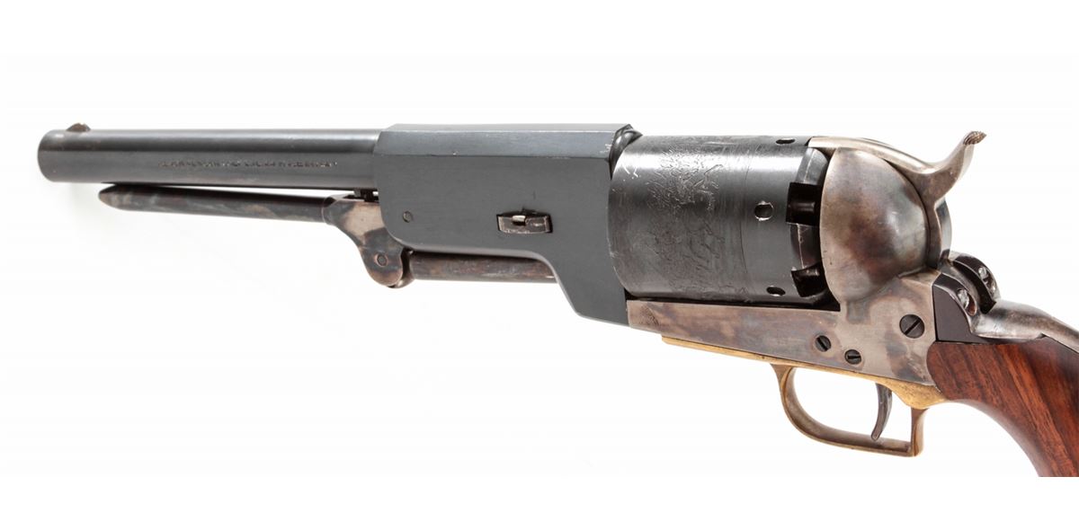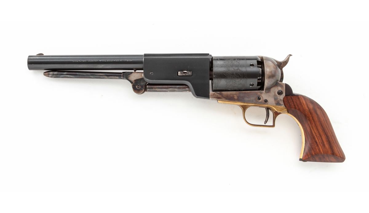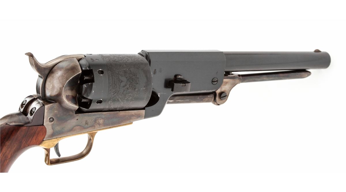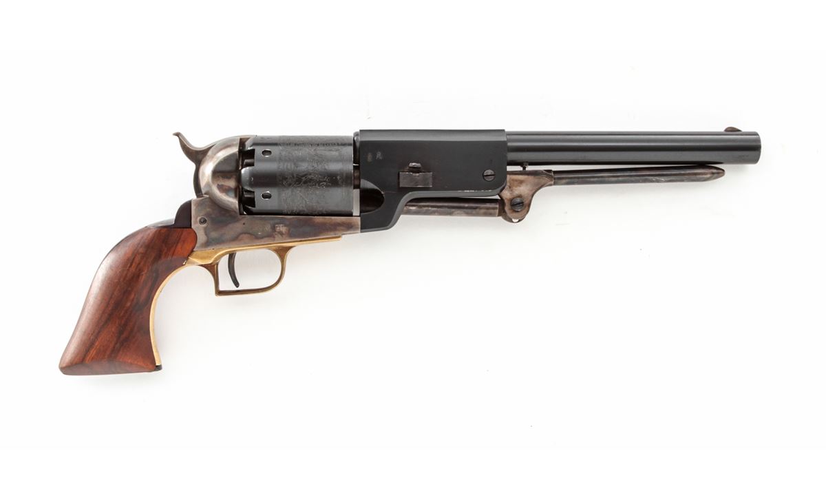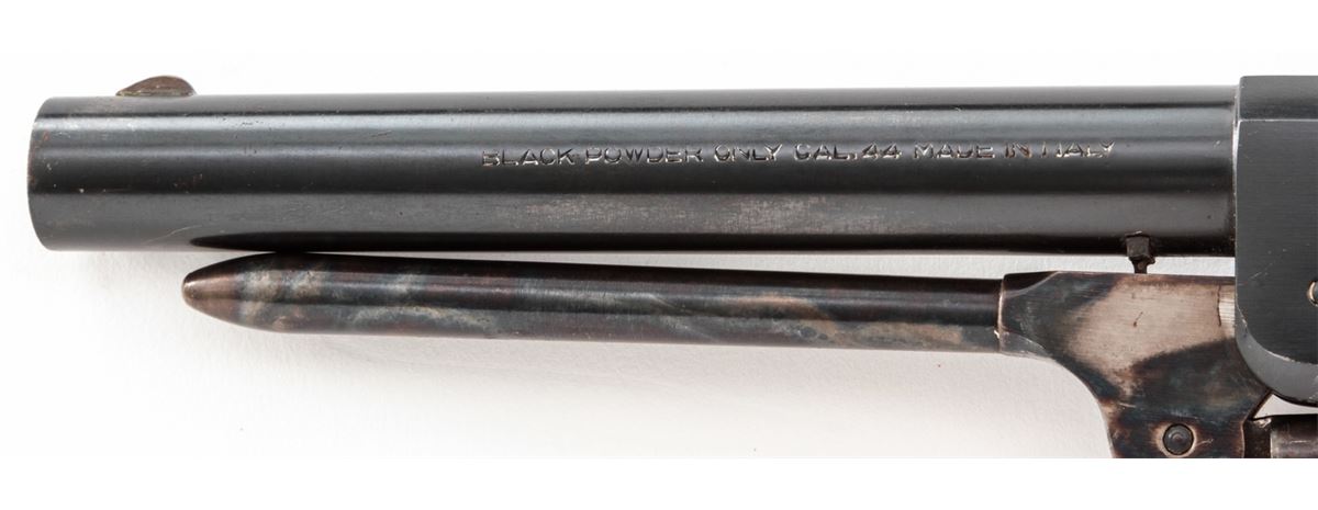 Italian Copy of Colt Walker, #24564, .44 cal., 9'' barrel, blue and case colored finish, with one-piece walnut grips and brass triggerguard. Left side of barrel marked ''Black Powder Only, Cal. 44, Made in Italy''. Condition is about fine showing light use as thinning to high edges and minor scuffs and scratches. Grips and action are good, bore is bright. Est.: $225-$450. (Antique)
