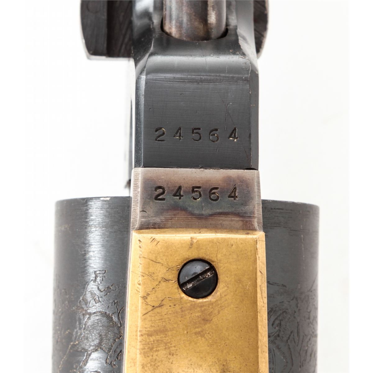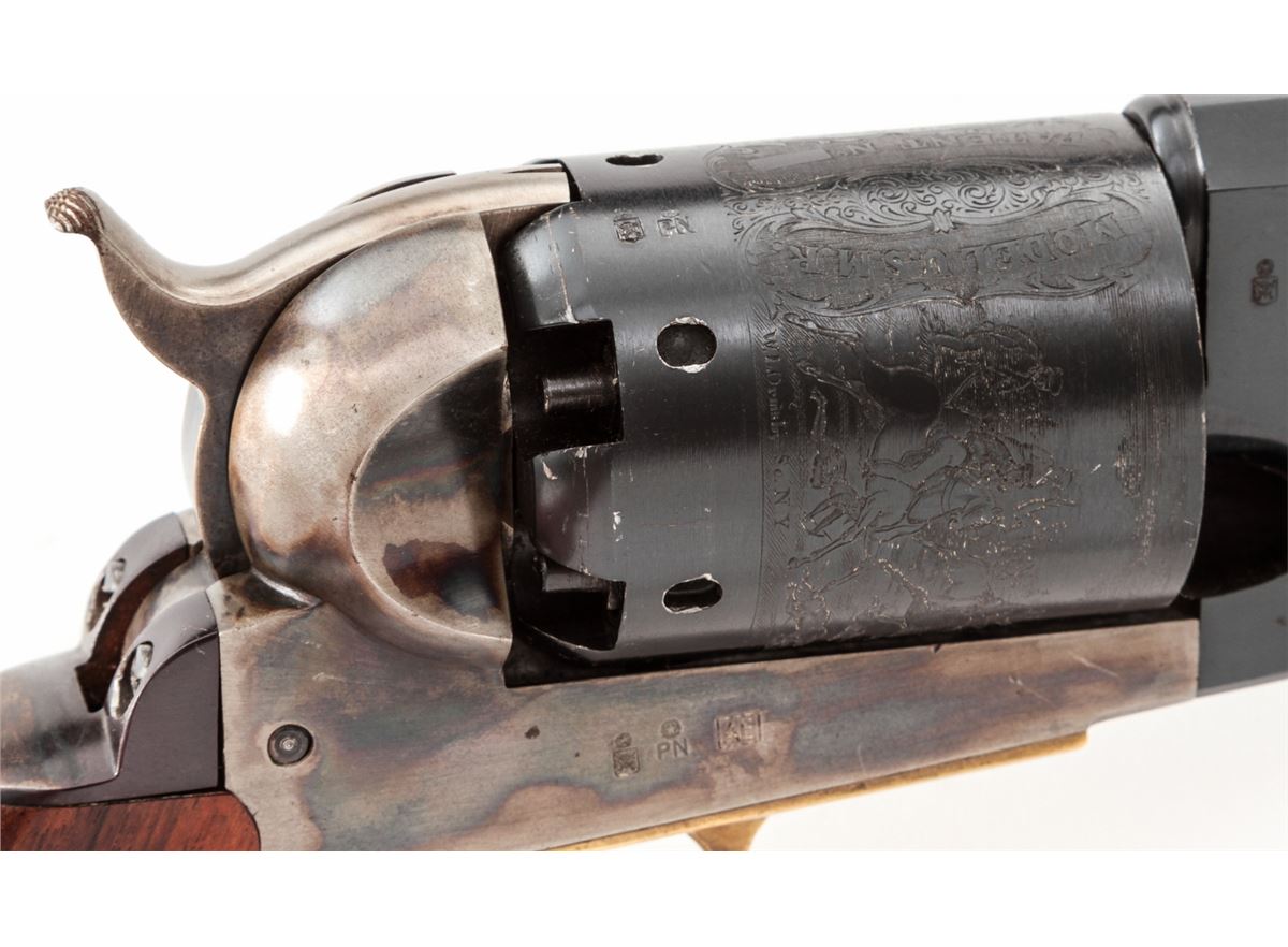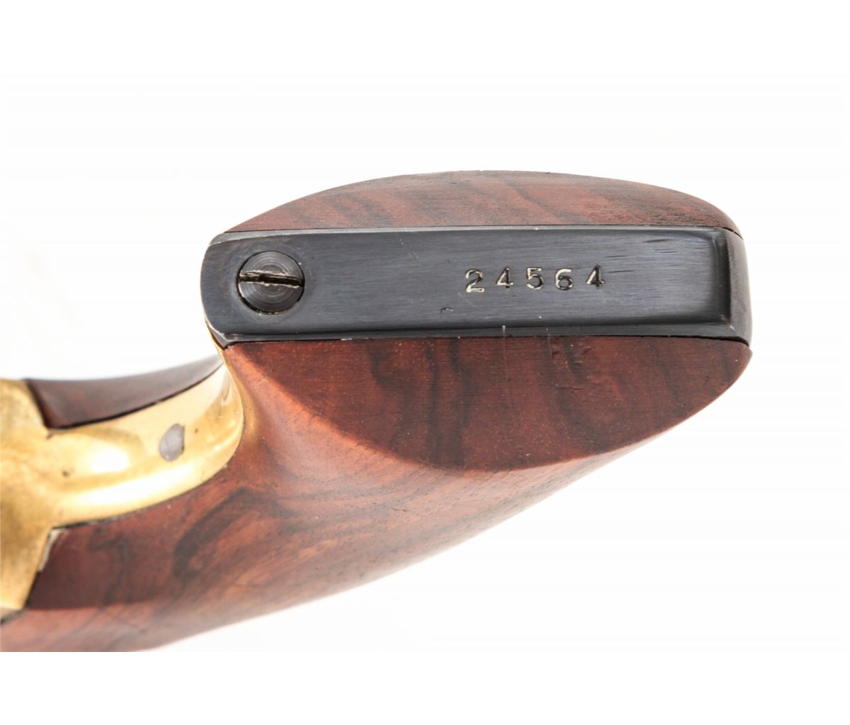 Italian Copy of Colt Walker, #24564, .44 cal., 9'' barrel, blue and case colored finish, with one-piece walnut grips and brass triggerguard. Left side of barrel marked ''Black Powder Only, Cal. 44, Made in Italy''. Condition is about fine showing light use as thinning to high edges and minor scuffs and scratches. Grips and action are good, bore is bright. Est.: $225-$450. (Antique)