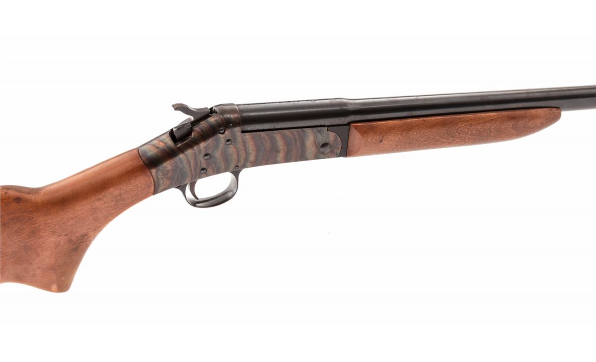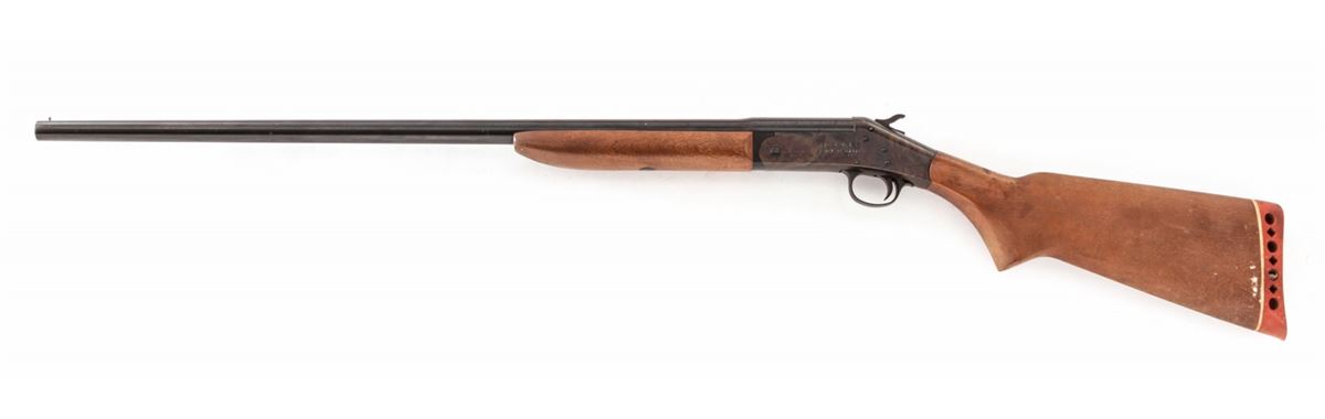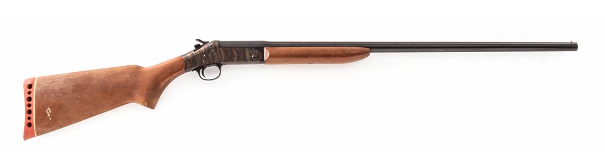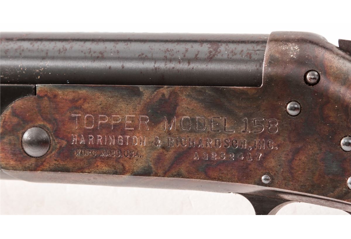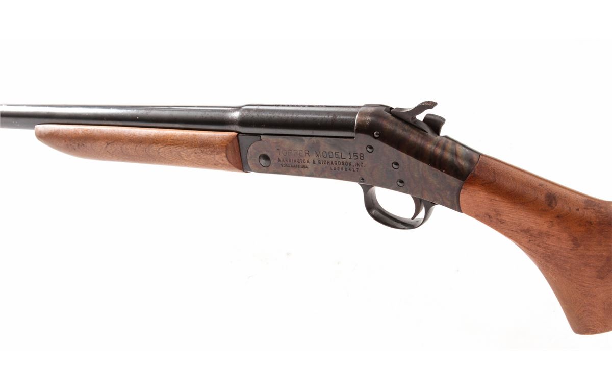 H&R Topper Model 158 Single Shot Shotgun, #AG262417, 20 ga., 28'' barrel with 3'' chs. choked Mod., blue finish, case hardened frame, birch stock and forend. Condition is near fine retaining approx. 92% blue with mild areas of corrosion near chamber. Stock needs light cleaning. Action and bore are good. Est.: $75-$150. (Modern)
