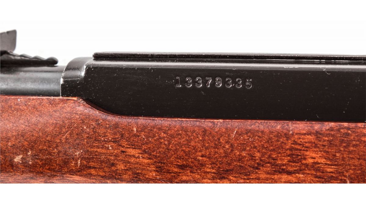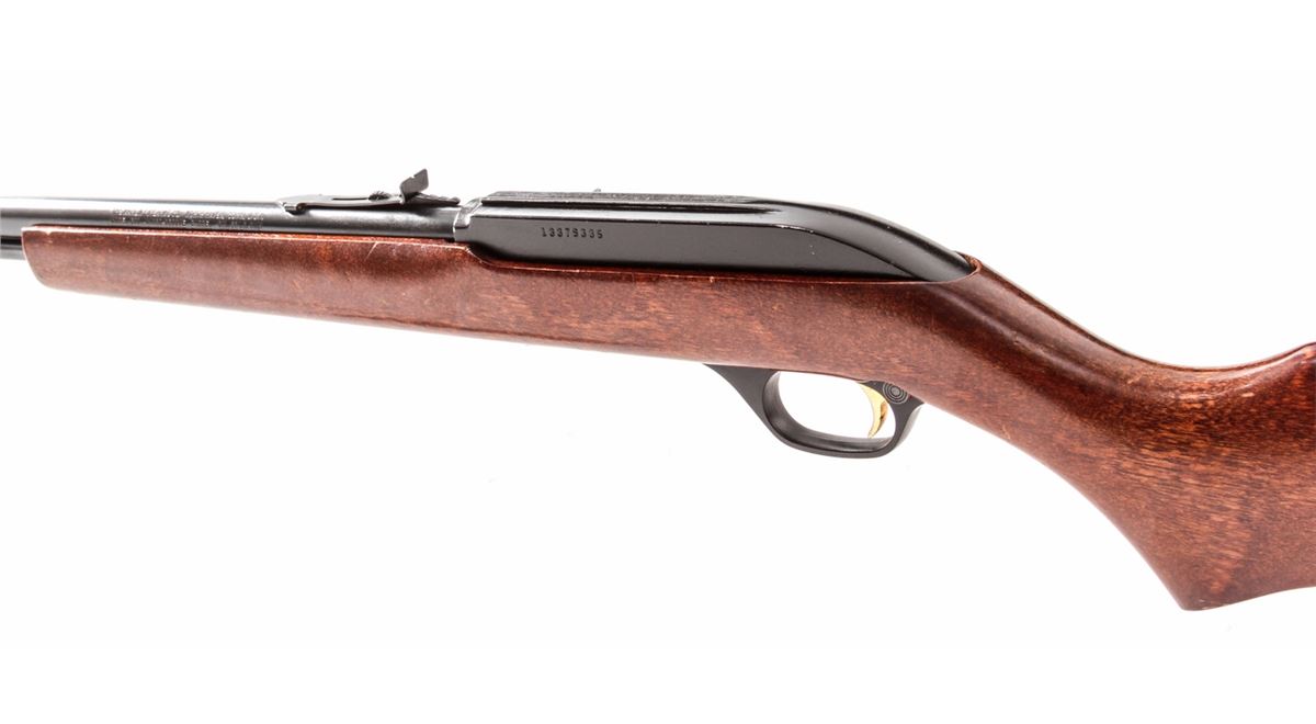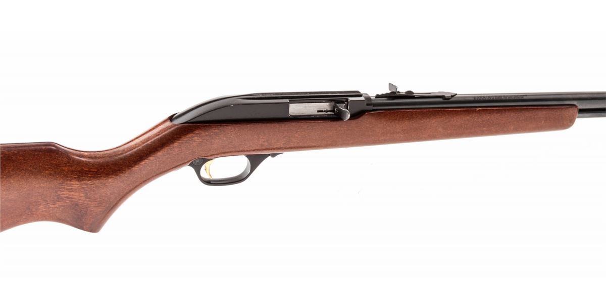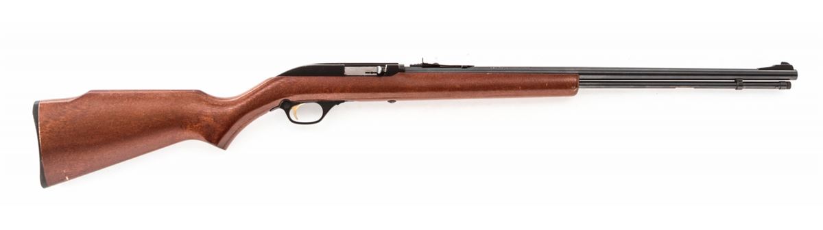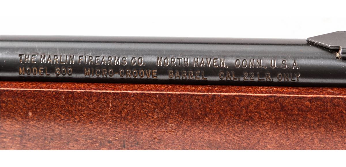 Marlin Model 600 Semi-Automatic Rifle, #13379335, .22 LR cal., 22'' barrel, blue finish, birch stock. Condition is very good showing just light to moderate field use, with minor scuffs and scratches overall to stock. Good action and bore. Est.: $75-$150. (Modern)