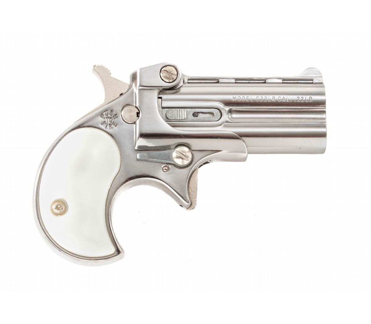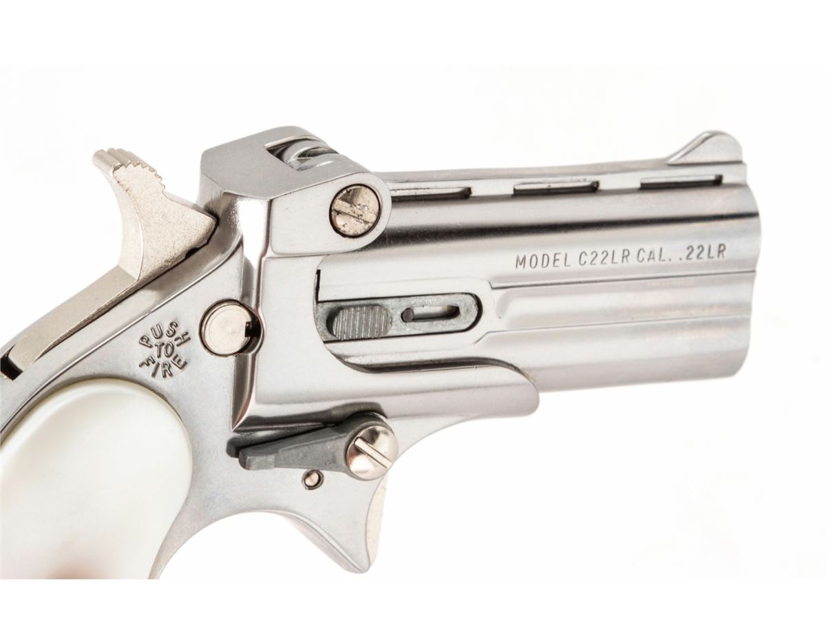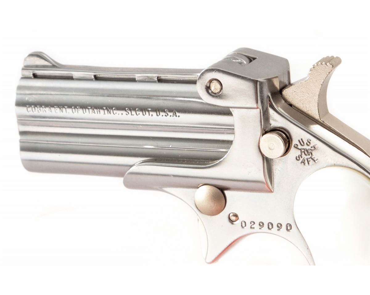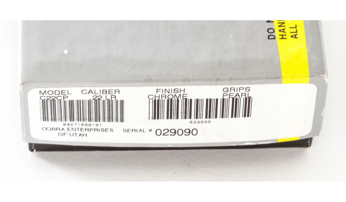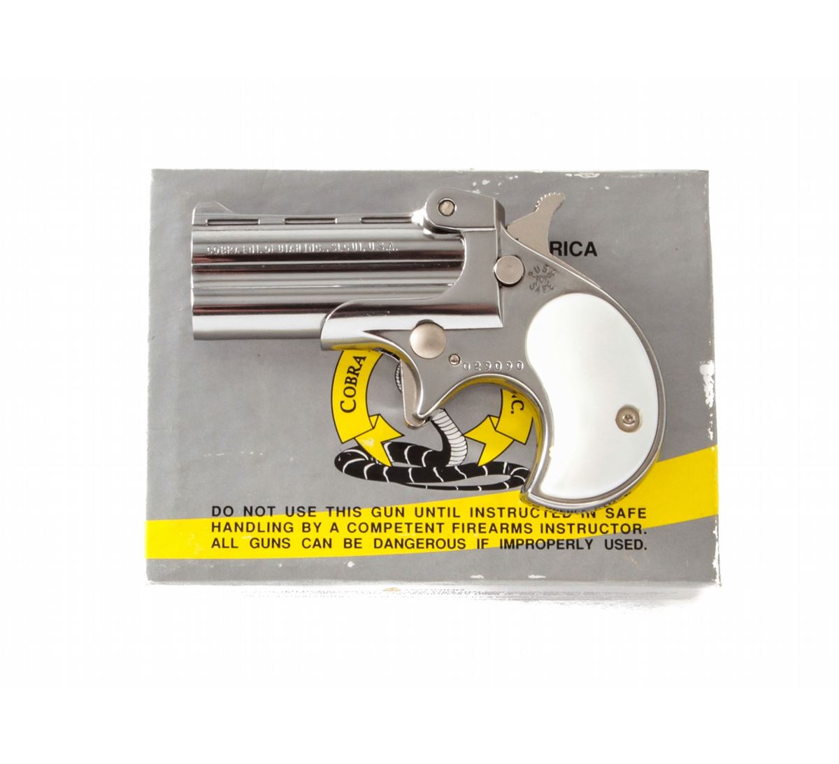 Cobra Model C22LR Over/Under Pistol, #029090, .22 LR cal., 2-1/2'' barrel, chrome finish, faux pearl grips, in original box with instructions. Condition is excellent, appearing as new. Est.: $75-$150. (Modern)