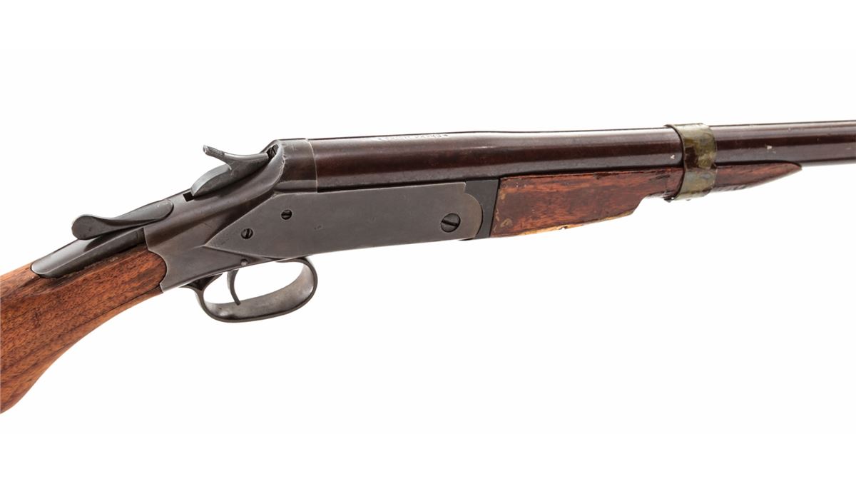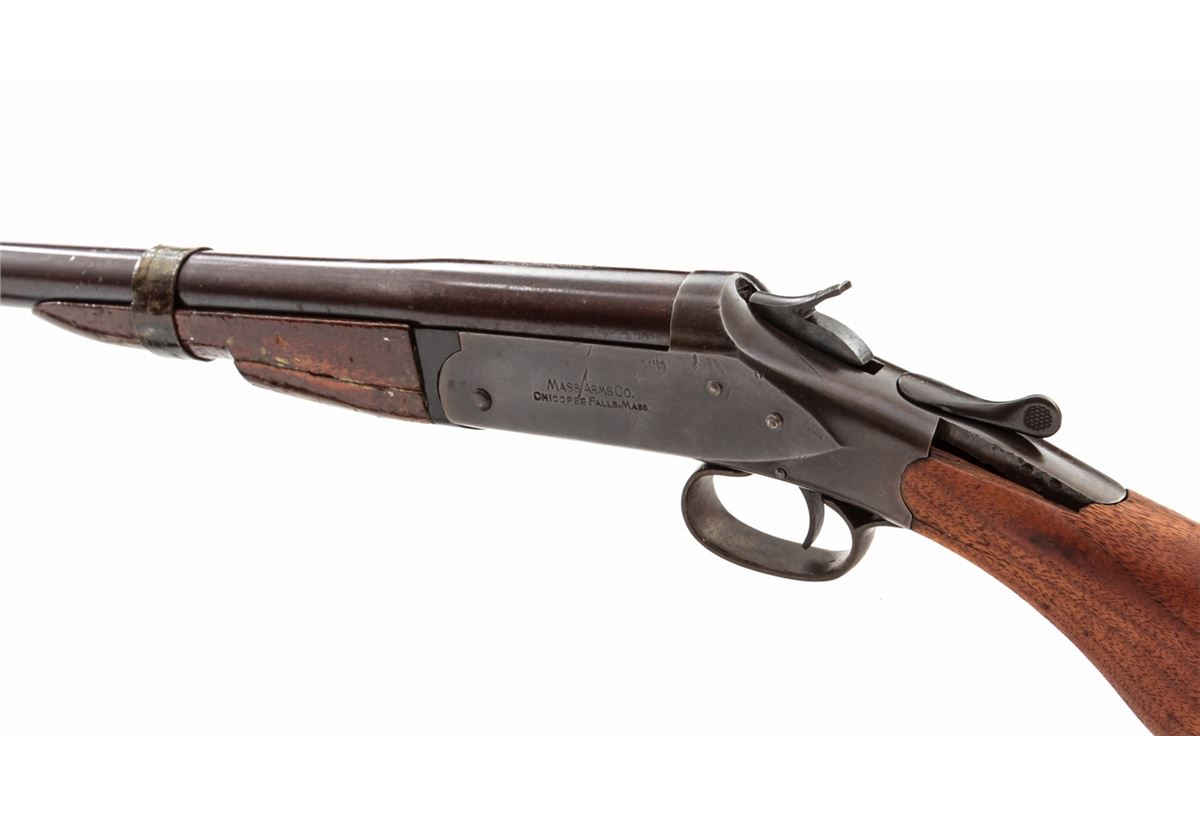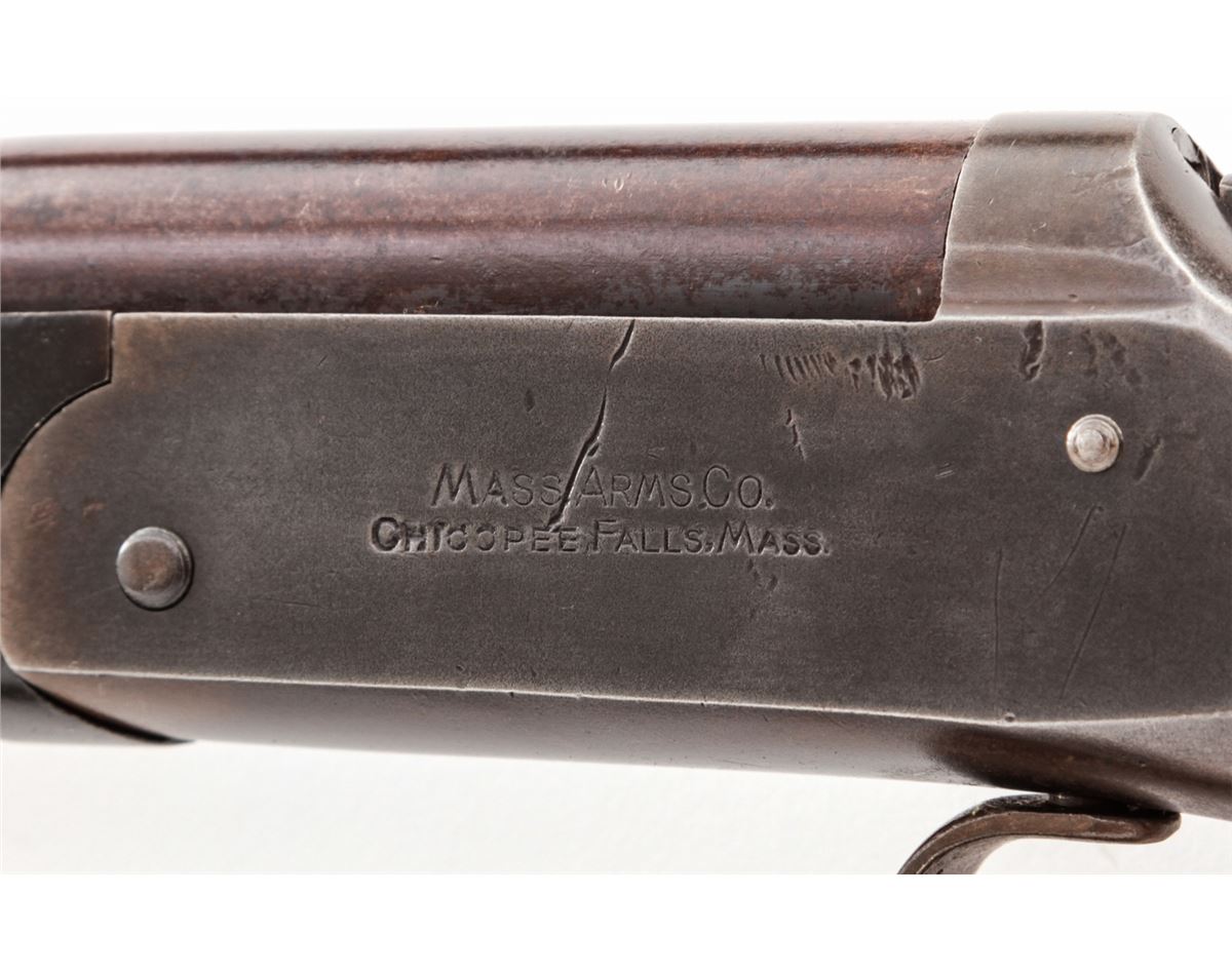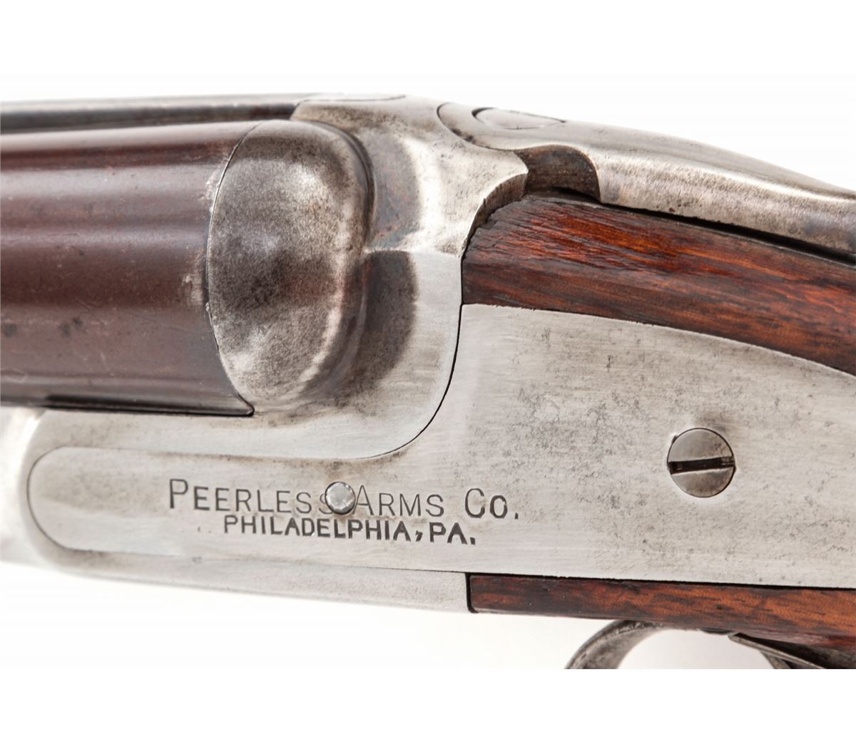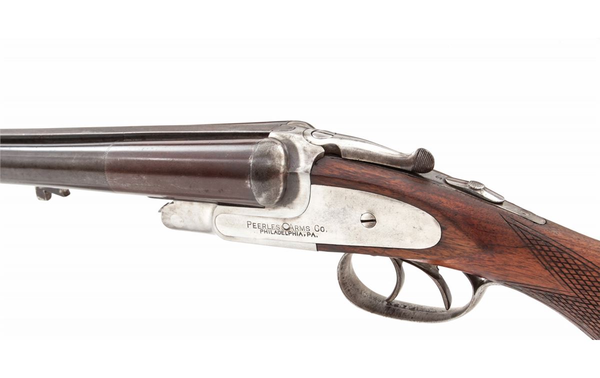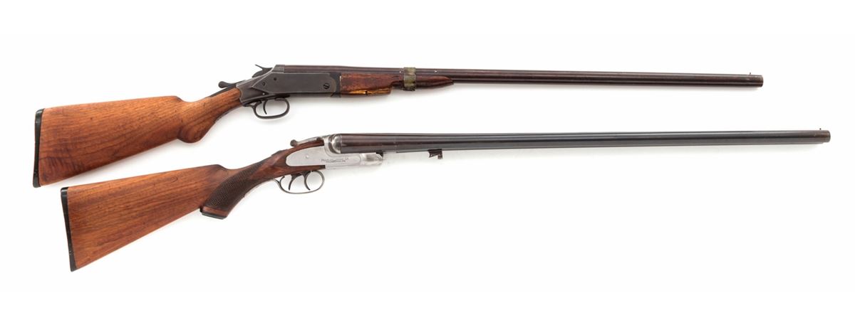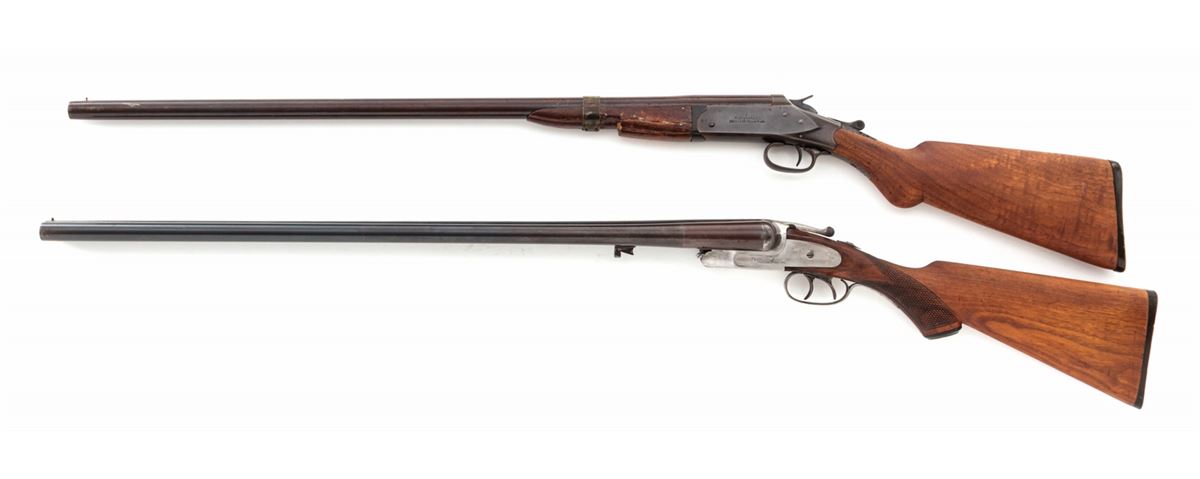 Lot of Two (2) Shotguns: (1) Mass. Arms Single Shot, #FF428, 12 ga., 30'' barrel choked Full, blue finish, walnut stock. Condition is fair with replaced forend, cracks and losses to stock, good action and bore. (2) Peerless Arms, Phila. SxS, #5614, 12 ga., 30'' bright barrels choked Mod./Mod., bright receiver, pistol-grip checkered walnut stock, missing forend. Condition is very good. Est.: $125-$250/lot. (C&R)