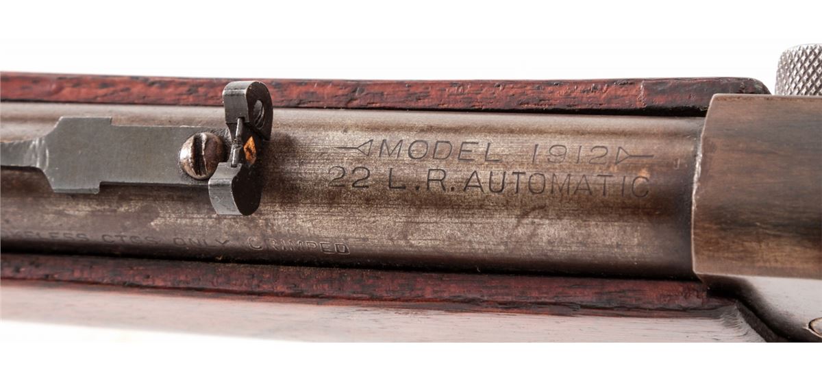 Savage Model 1912 Semi-Automatic Rifle, #3165, .22 LR cal., 20'' barrel, blue finish, walnut stock and handguard, with one original magazine. Condition is very good retaining approx. 85% original finish. Stock with light scuffs and scratches, some slightly more pronounced to left side, with additional coat of varnish. Good action, very good bore. Est.: $150-$300. (C&R)