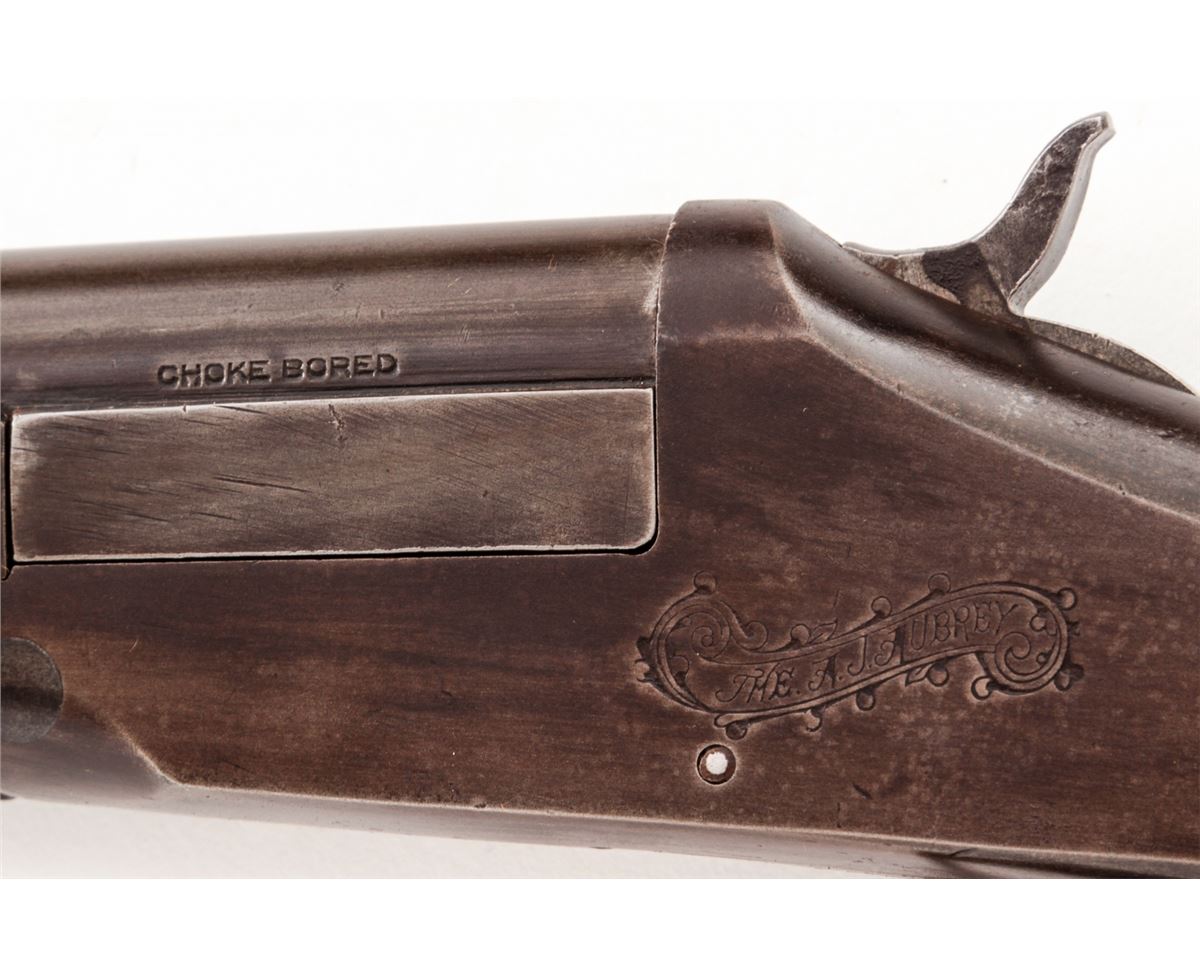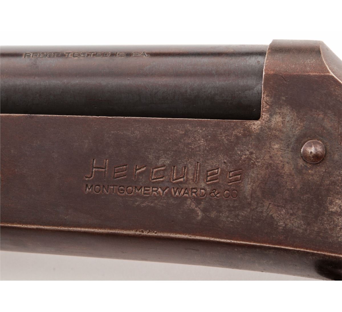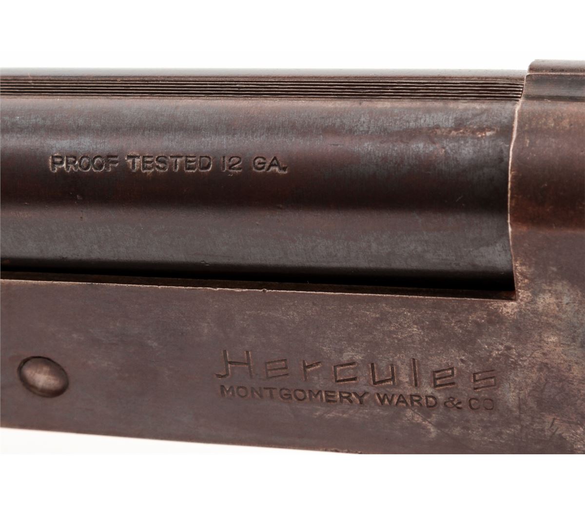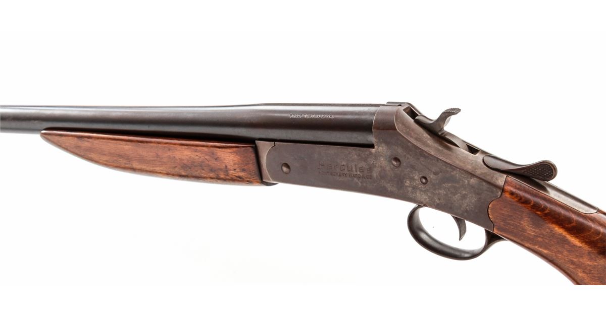 Lot of Two (2) American Single Shot Shotguns: (1) Montgomery Wards Hercules, NVSN, 12 ga., 30'' barrel, Full choked, blue finish, birch stock. Condition is fine with light toning to finish. Stock shows light sanding and satin finish. Good action and bore. (2) Meriden Aubrey, NVSN, 16 ga., 30'' barrel, Full choked, blue finish, checkered walnut stock. Condition is good to very good retaining approx. 75% blue. Stock has been sanded and refinished. Good action and bore. Est.: $150-$300/lot. (C&R)
