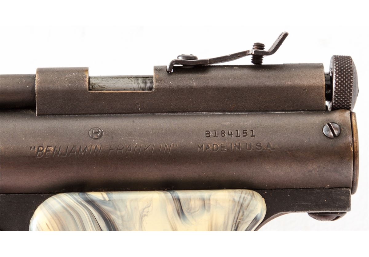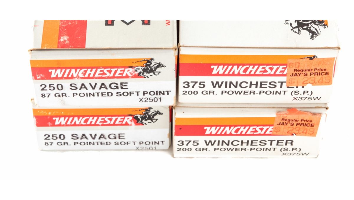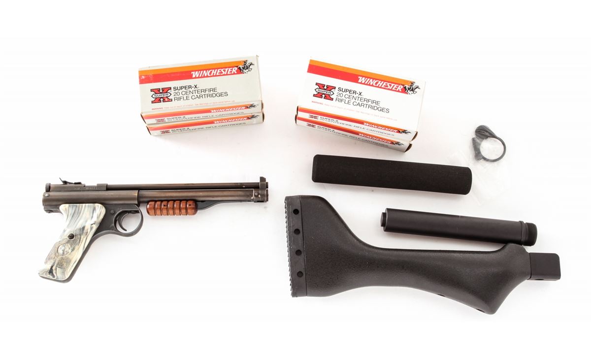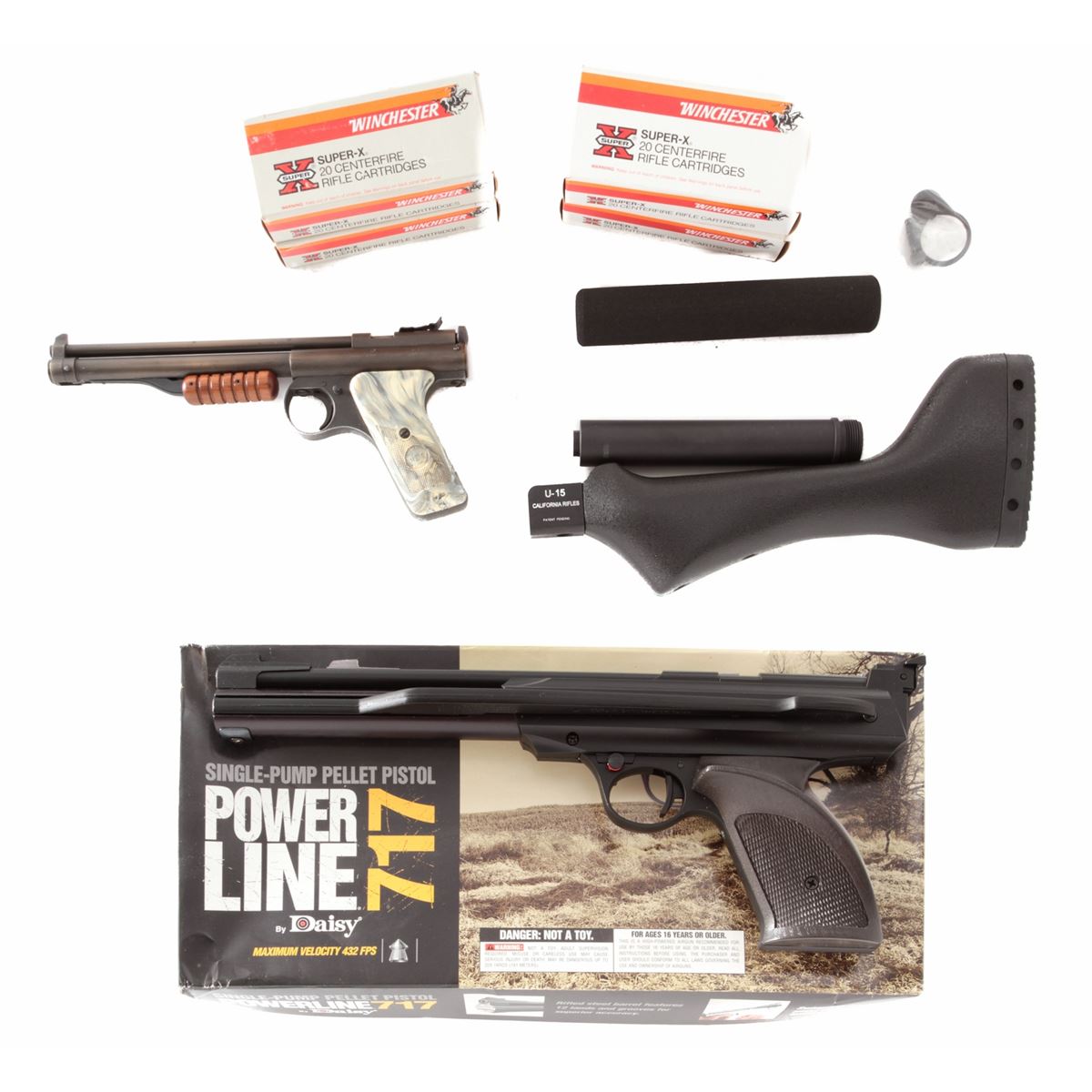 Misc. Lot consisting of two (2) pellet guns, one a Benjamin Franklin Model 132 in .22 cal., and one a modern Powerline single shot .177 cal. air pistol by Daisy, as new in original box; special AR-15 stock that replaces pistol grip and marked ''U-15''; two (2) boxes of Win. .250 Sav. ammo with 87GR pointed softpoint bullets; and two (2) boxes of .375 Win. ammo with 200 grain power-point (s.p.). Est.: $100-$200/lot.