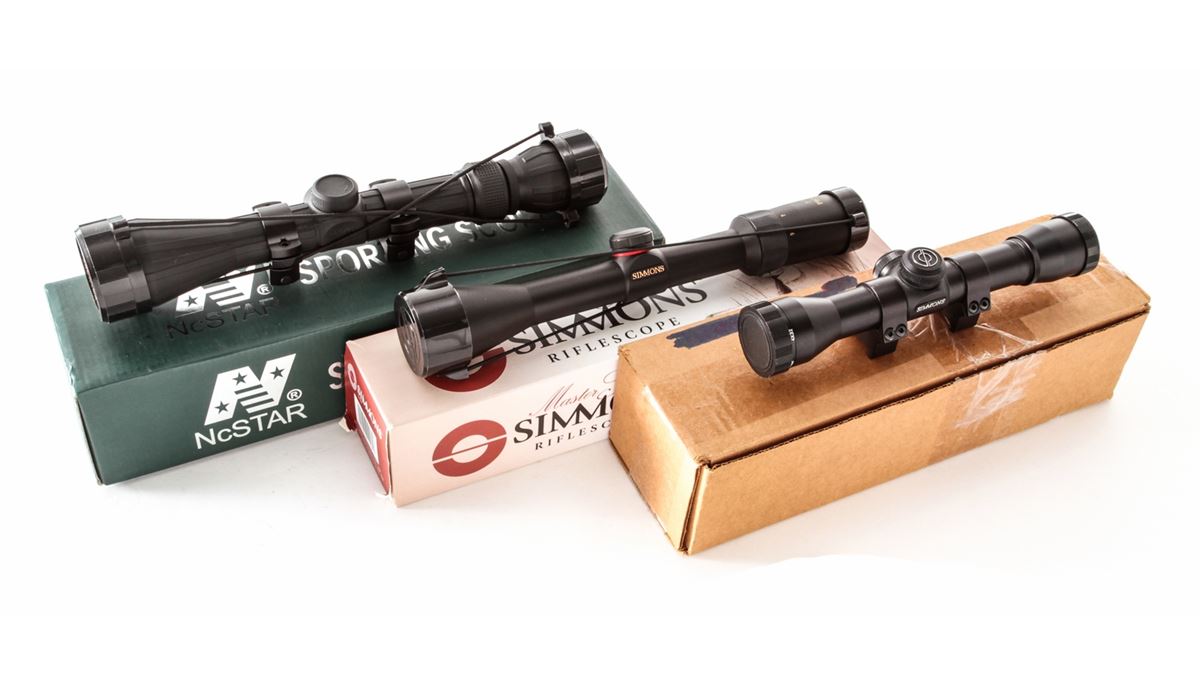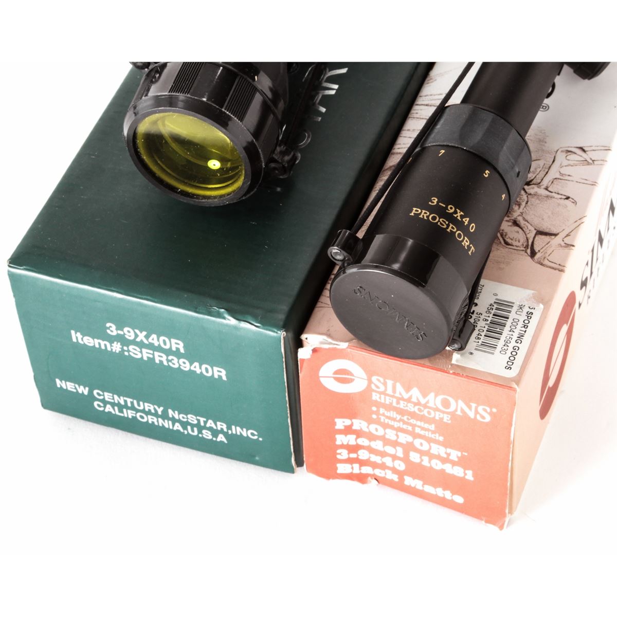 Lot of Three (3) Rifle Scopes: (1) Simmons Master Series 3-9x40 scope, with duplex reticles, as new in original box. (2) Simmons 4x32 Compact extended eye-relief scope, with duplex reticules, in excellent condition showing little use, with rings for Weaver rails. (3) Norinco ZJ 3-9x40 rubberized scope, with rangefinder duplex reticules, as new in original box, with rings for Picatinny mount. Est.: $125-$250/lot.