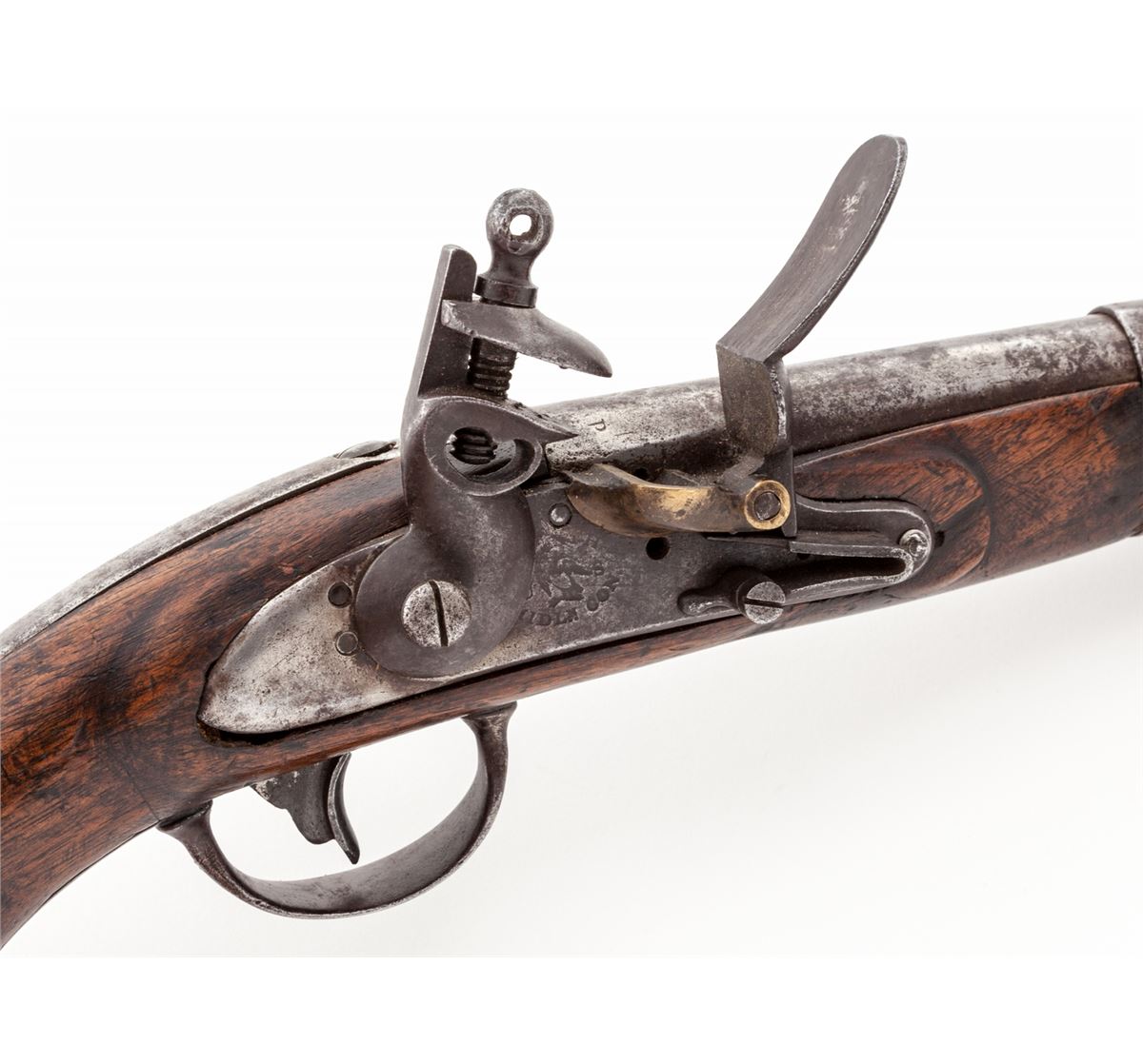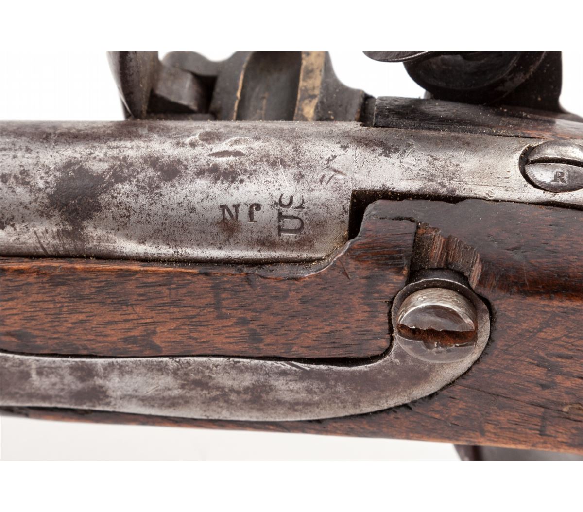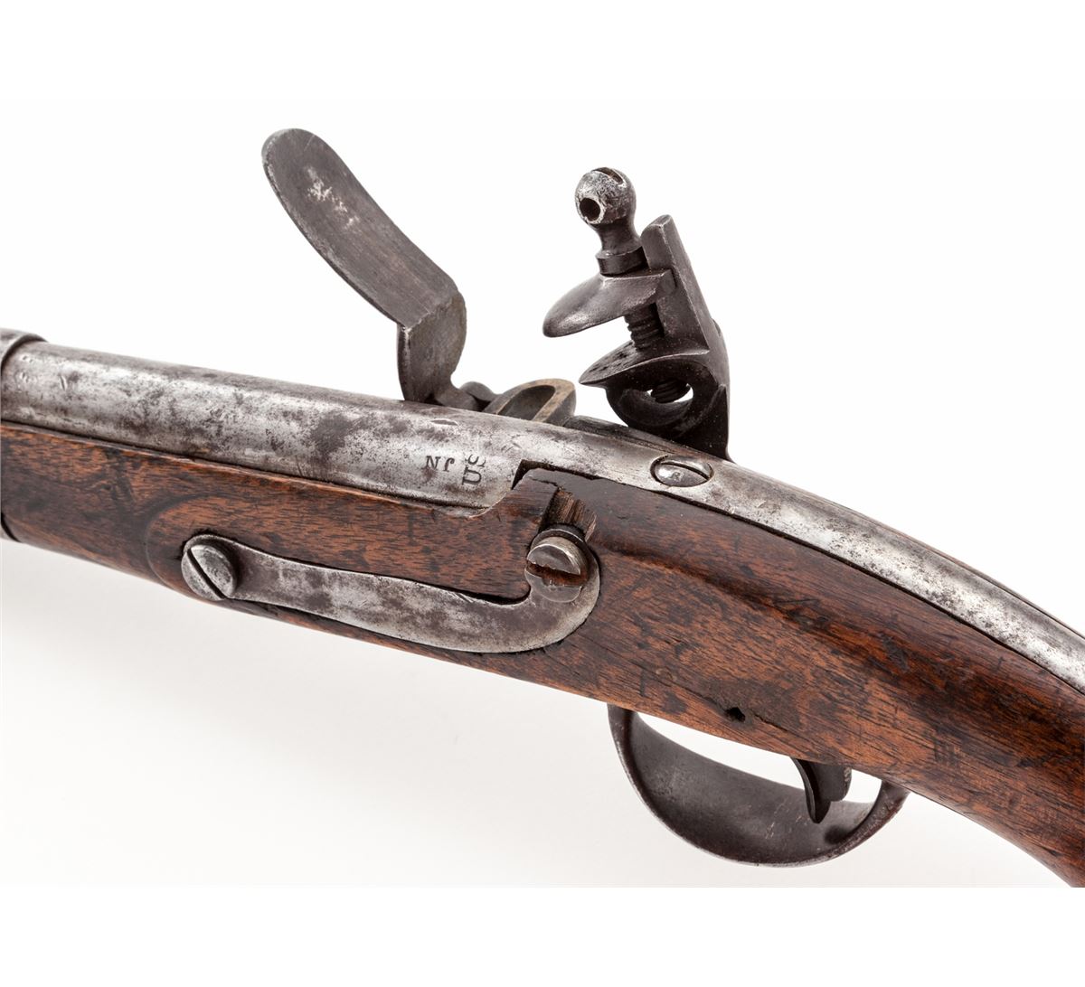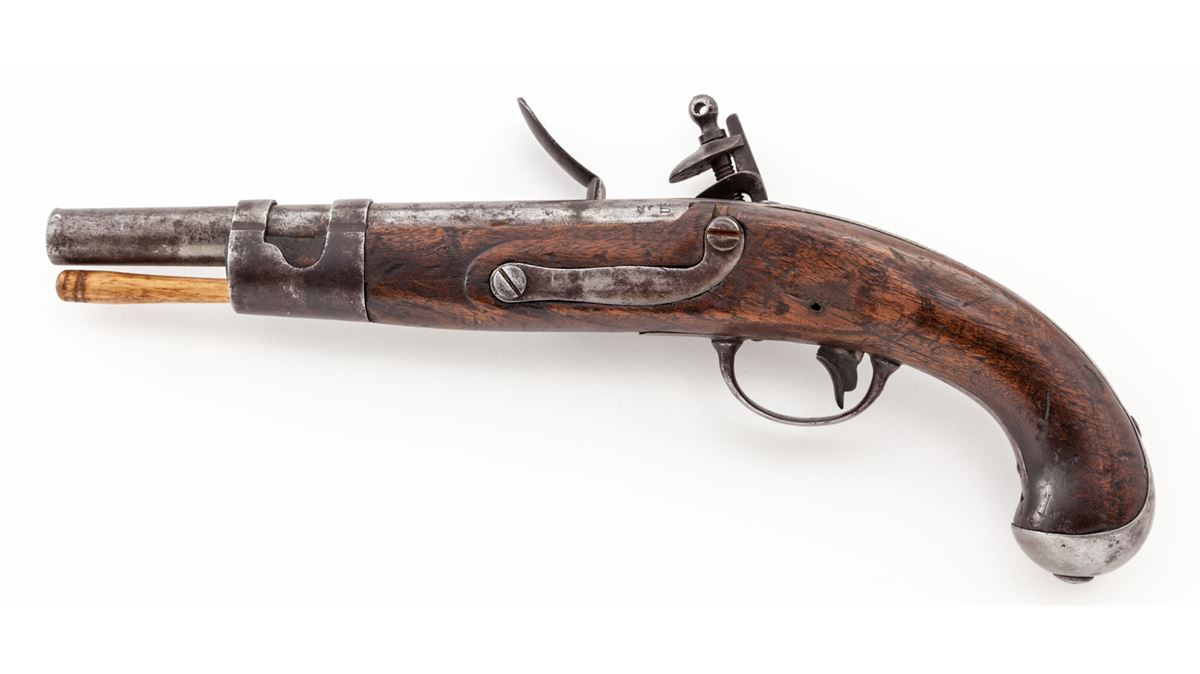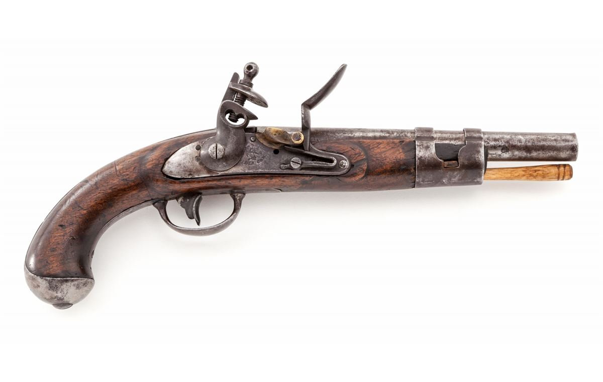 U.S. Model 1816 Flintlock Pistol, by S. North, .54 cal., 8-1/2'' barrel, walnut stock, ''JN'' inspector's marks, with iron bands. Condition is about good with moderate patination and light corrosion to bright metal surfaces. Stock shows moderate use with scuffs, scratches and oil darkening, and one loss just in front of pan, with later replaced ramrod. Front sight blade is missing. Est.: $500-$750. (Antique)