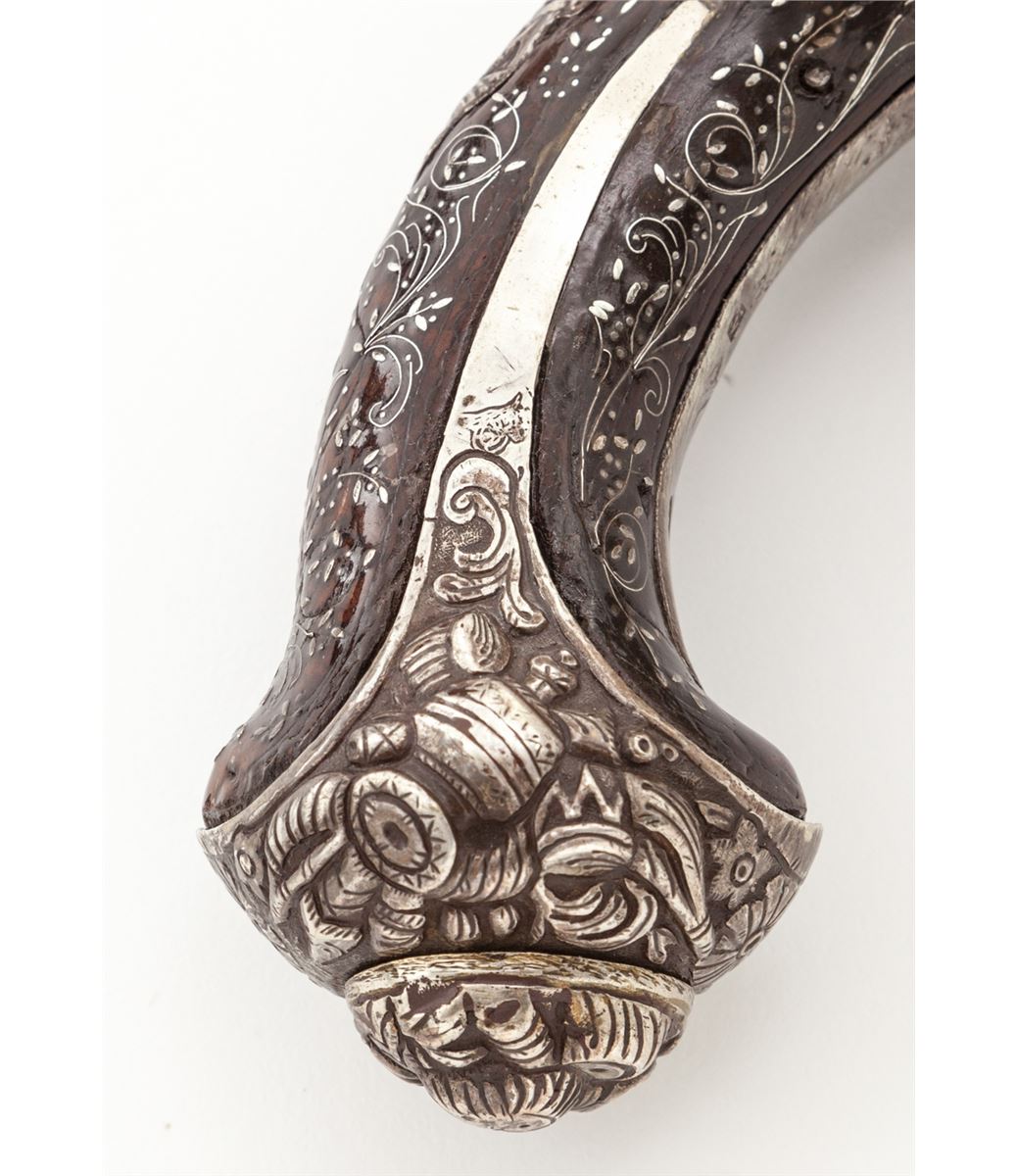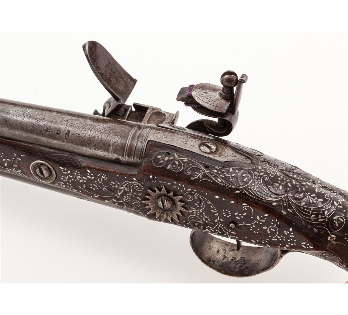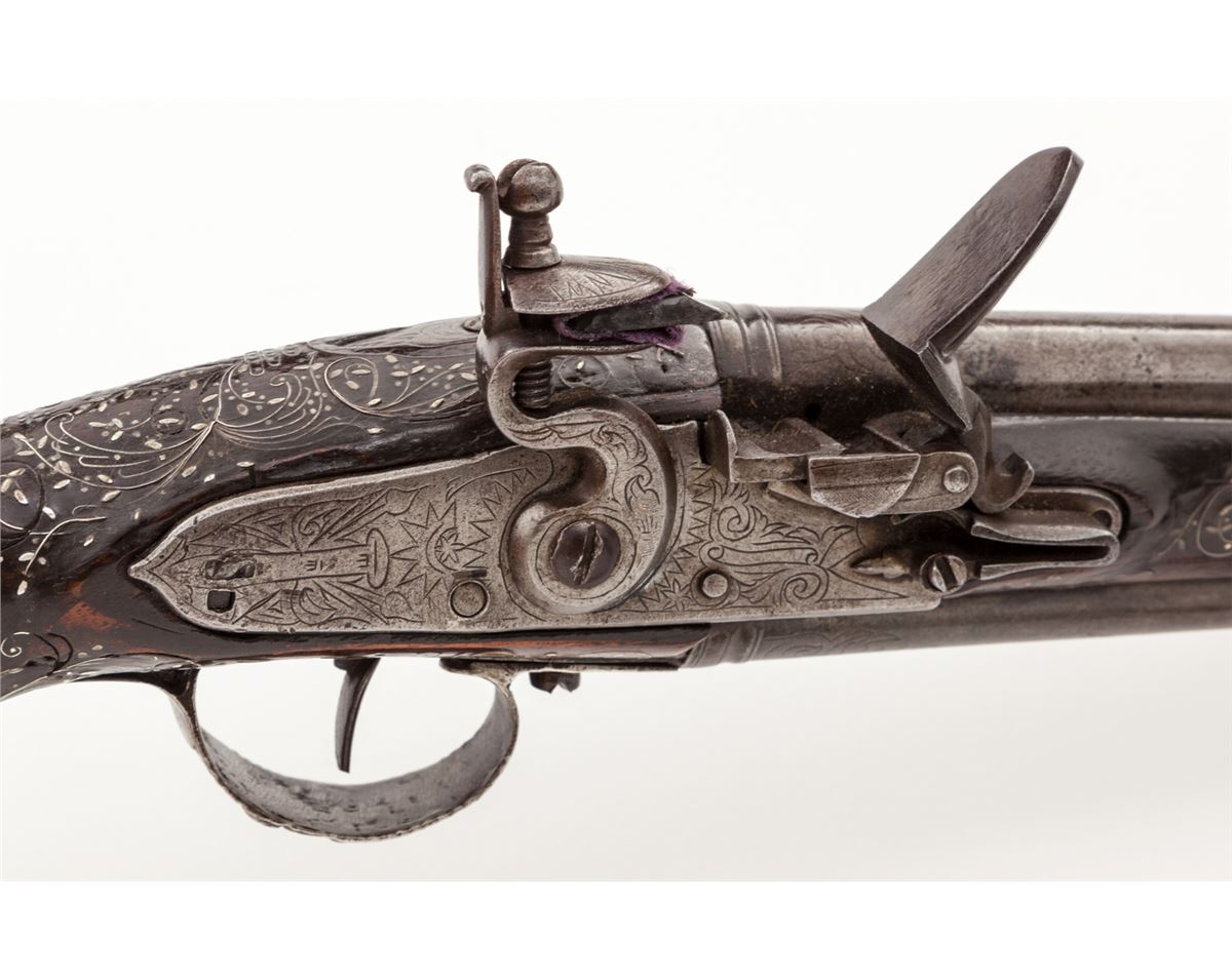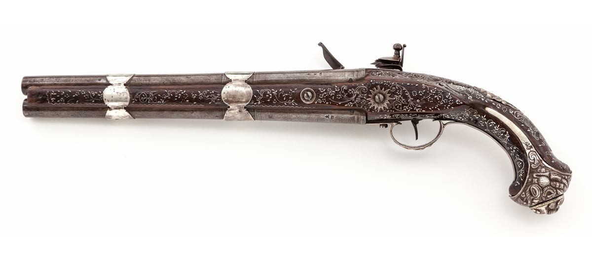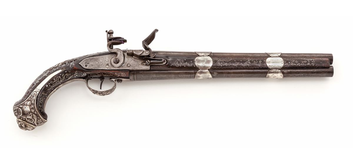 Double Barrel Sliding Pan Over/Under Flintlock Pistol, .58 cal., 11-1/2'' barrel, twin silver bands, relief cast decorative butt cap and triggerguard, with finely wire inlaid Mediterranean walnut stock. Top of barrels with light decoration and Continental proofmarks to both barrels at breaches and hallmarks to silver butt cap. Condition is excellent showing light corrosion to forward portion of barrels. Stock show minor nicks and scuffs, with nearly all of the inlay remaining intact. Est.: $3,000-$5,000. (Antique)