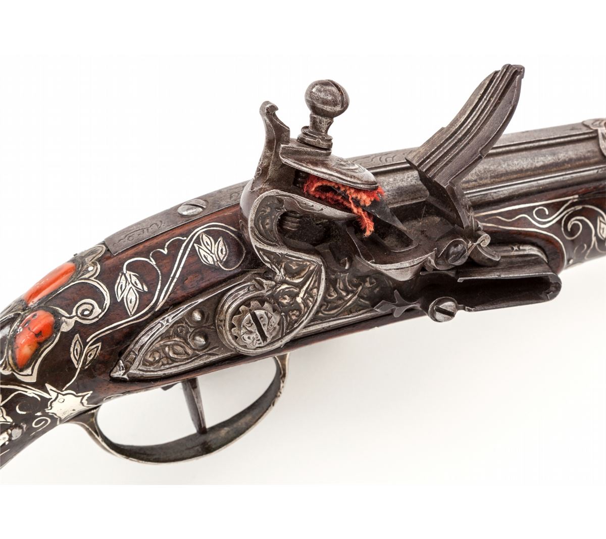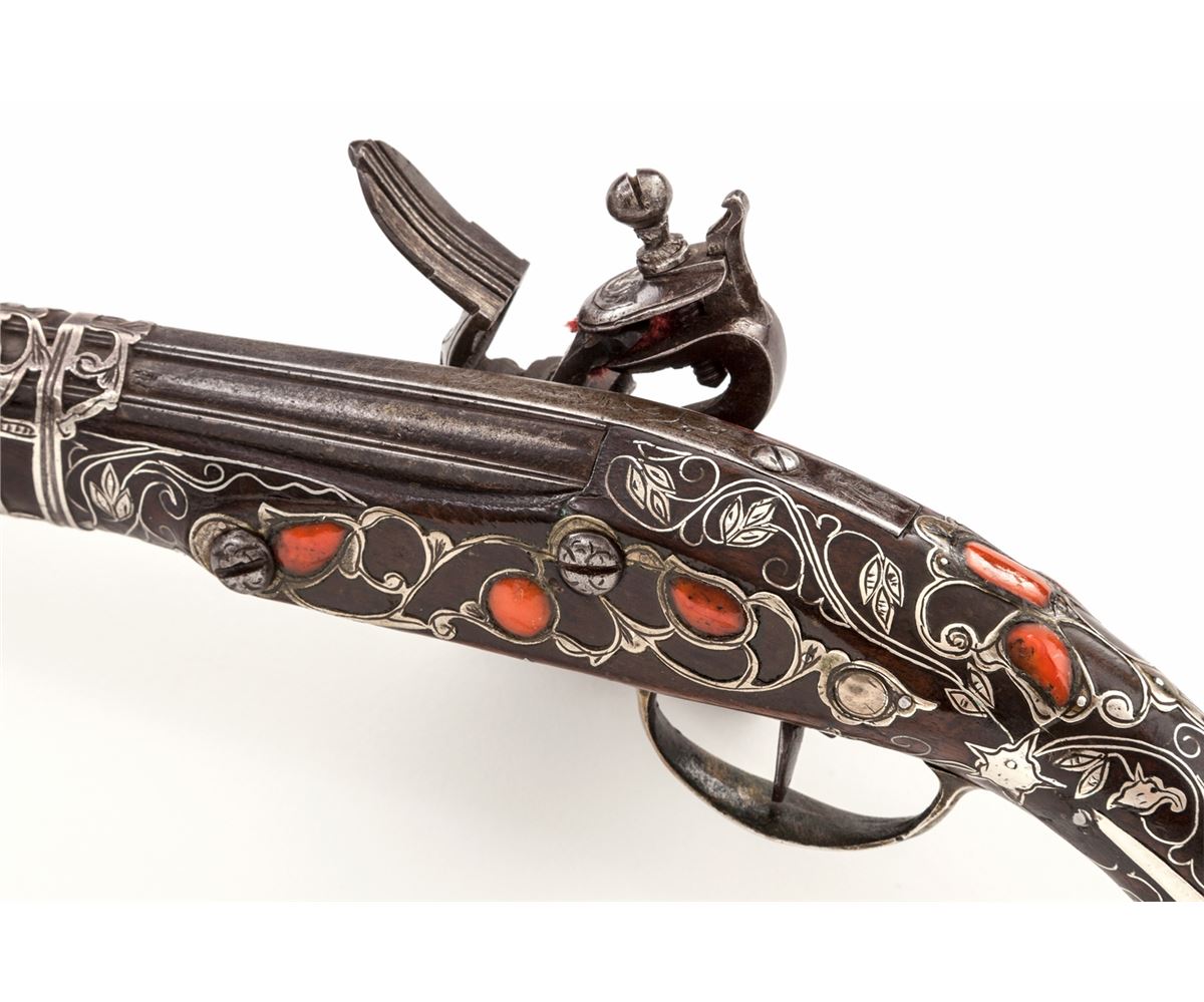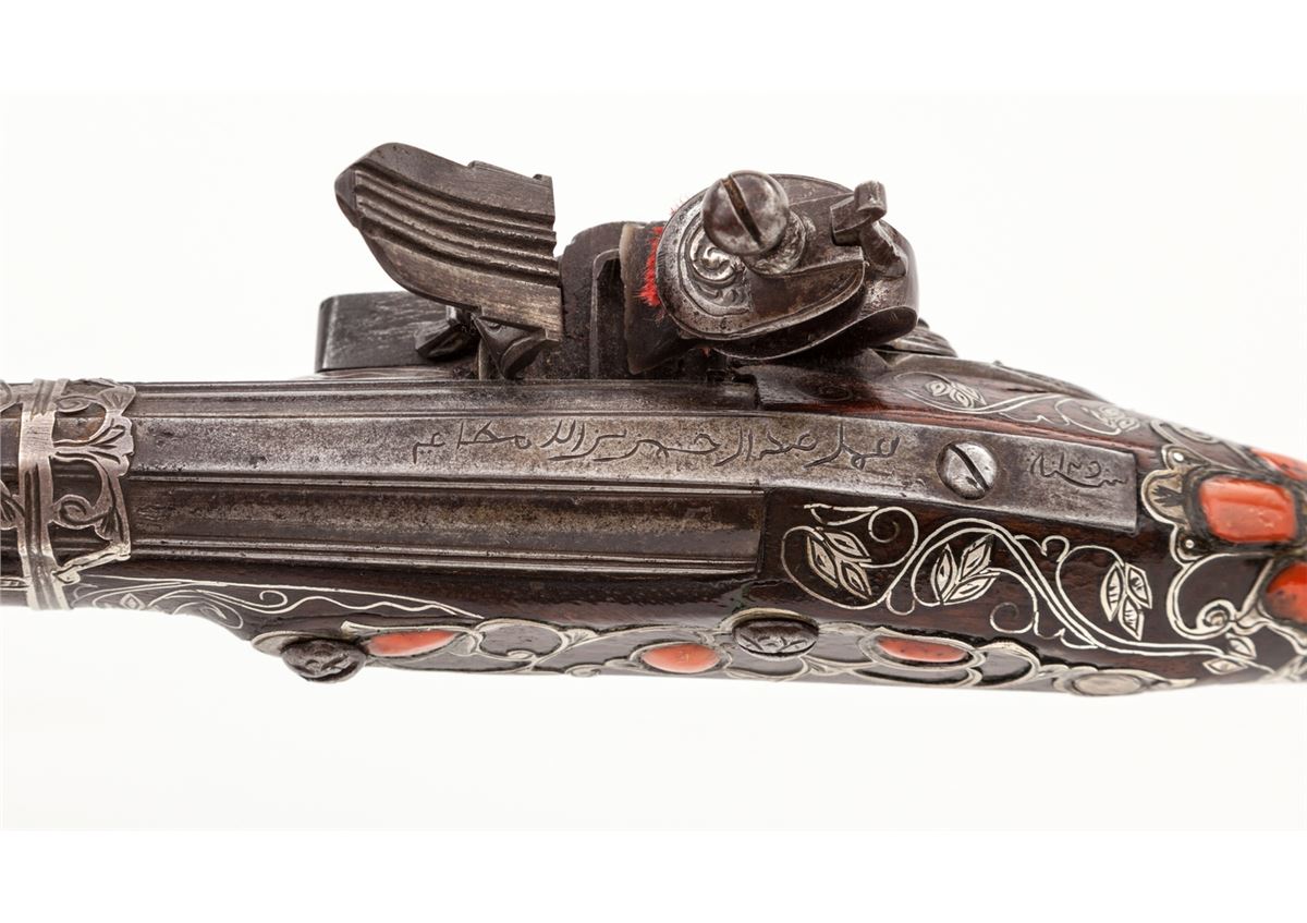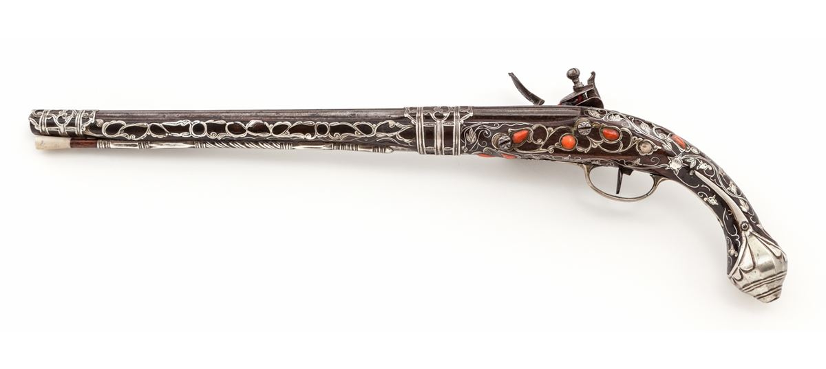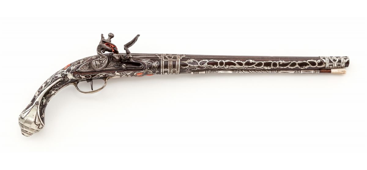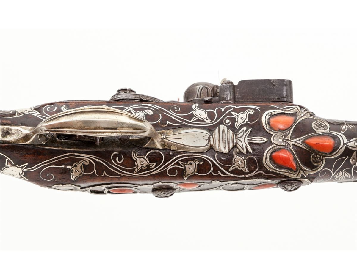 Middle Eastern Coral Inlaid and Silver Decorated Flintlock Pistol, approx. .50 cal., 15'' silver ensconced barrel, open scroll motif chiseled metal inlay to full-length wooden stock, with approx. eleven (11) red coral inlays to rear third of stock, and relief sculpted onion-shaped butt. Probably dating from the late 18th Century. Condition is excellent. Exposed portion of barrel with some discoloration and minor corrosion. Chamber area with Arabic writing. Removable wooden ramrod with bone tip. Good functioning action. Est.: $2,500-$3,500. (Antique)