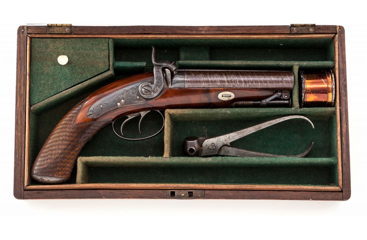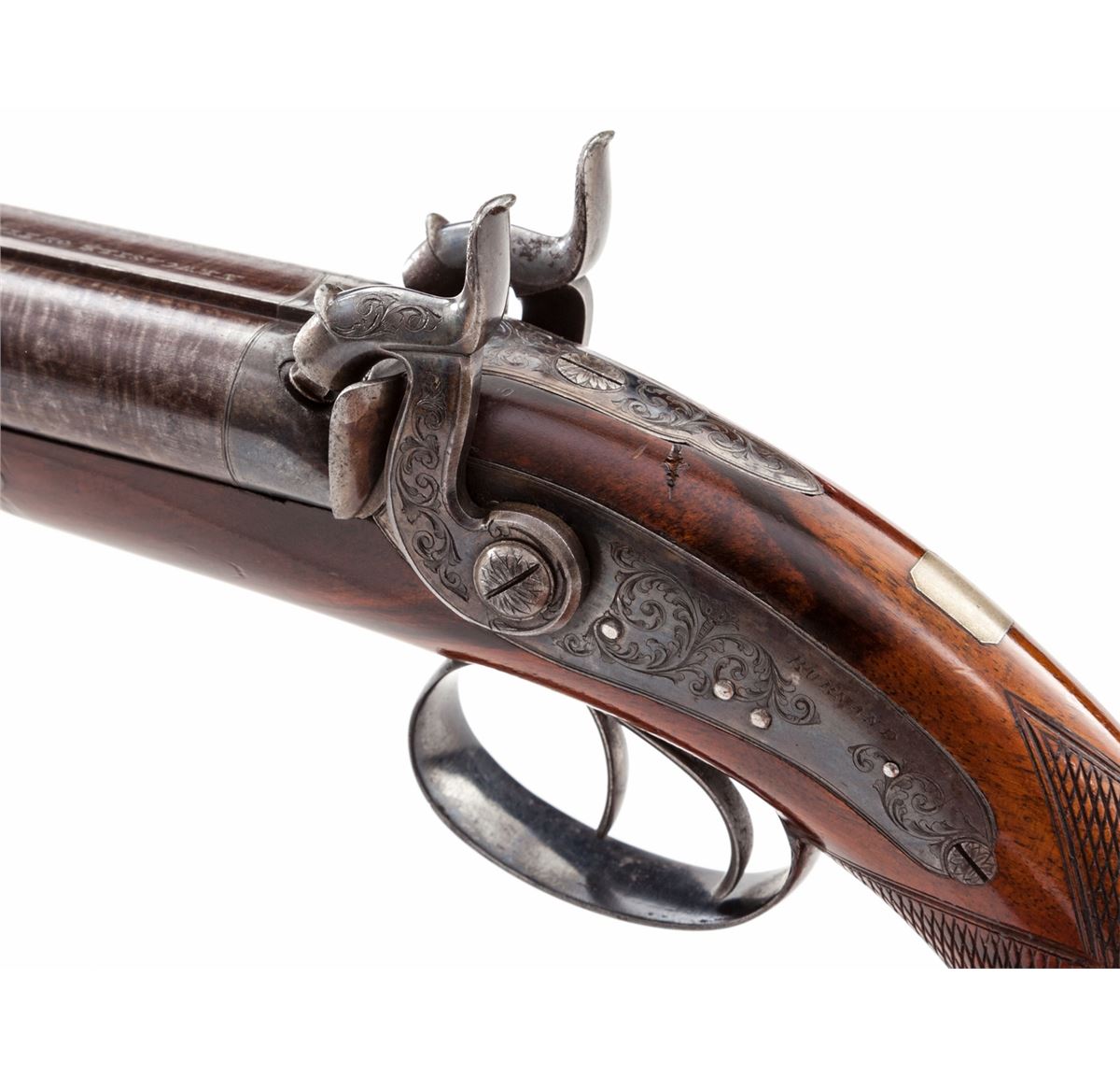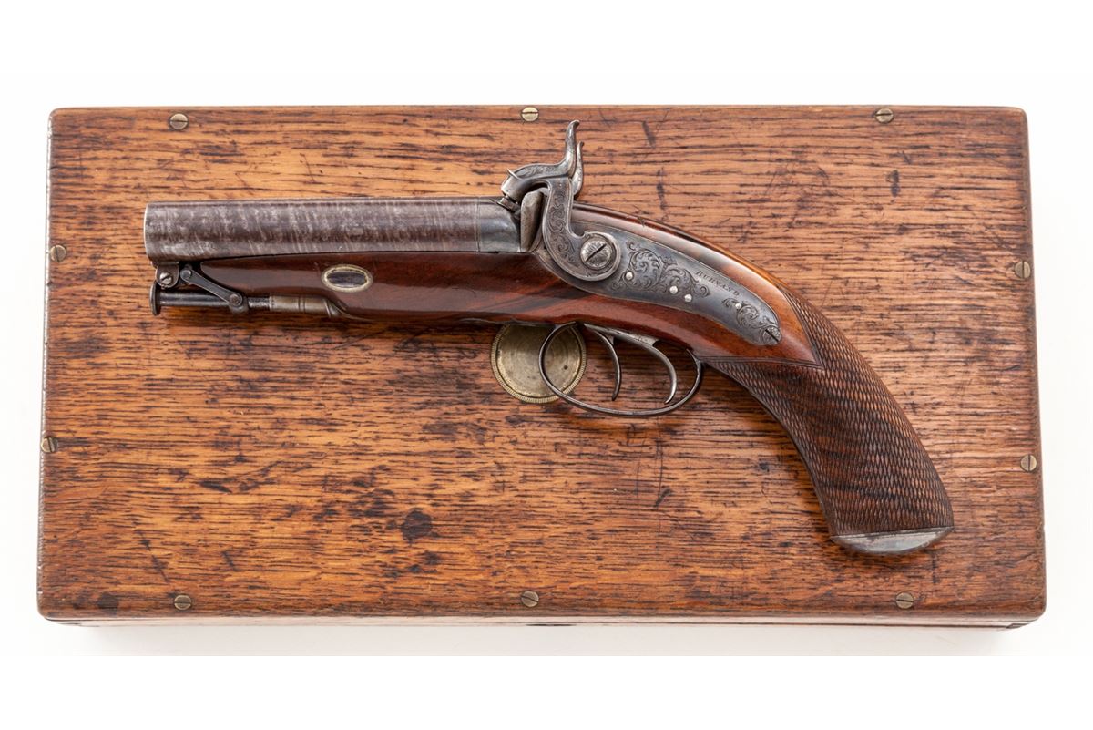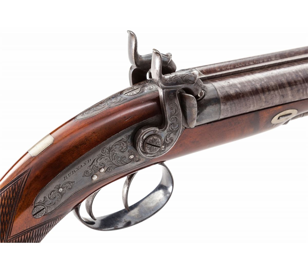 Cased English Large Bore Double Barrel Percussion Traveling Pistol, by Burnand, .54 cal., 5'' twist barrels, lightly engraved case hardened locks, hammers and butt cap; blue triggerguard and ramrod, with fine checkered European walnut stock with rectangular white metal tang escutcheon. In period case with bullet mold and japanned cap tin. Condition is excellent showing little use with only light marks from handling and light knackering near wedge. Good action and fine bores. Period English oak case shows well. Est.: $3,500-$5,000. (Antique)