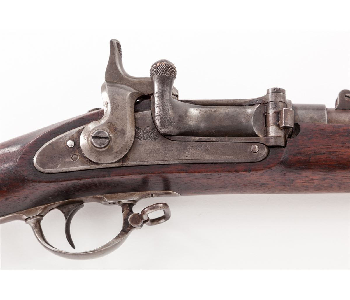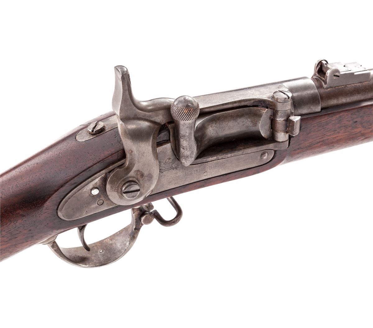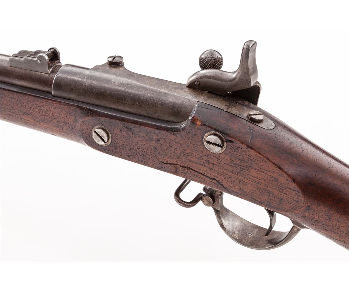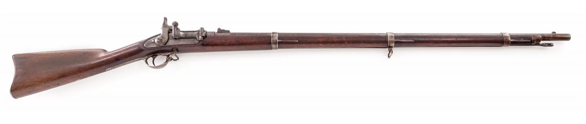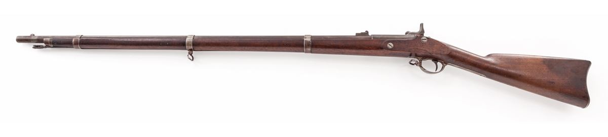 Needham Conversion of a Model 1861 Musket, NVSN, .58 cal., 37'' browned barrel, full-length walnut stock with three iron bands. As originally converted from a U.S. 1861 musket by Bridesburg, and in the post-Civil War were distributed to Fenian groups who crossed the Canadian border at Niagara, NY, June 1866, and defeated a column Canadian volunteers at Ridgeway. Arrested by U.S. authorities, their weapons were confiscated. Condition is near fine with light general overall toning. Scuffs and scratches to stock with very minor oil darkening. Ramrod is present. Good action, fine bore. Est.: $1,200-$1,800. (Antique)