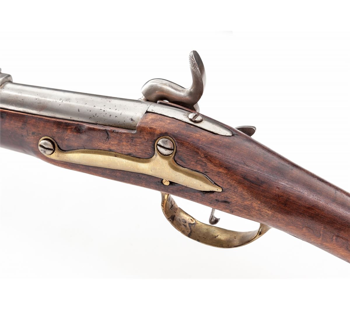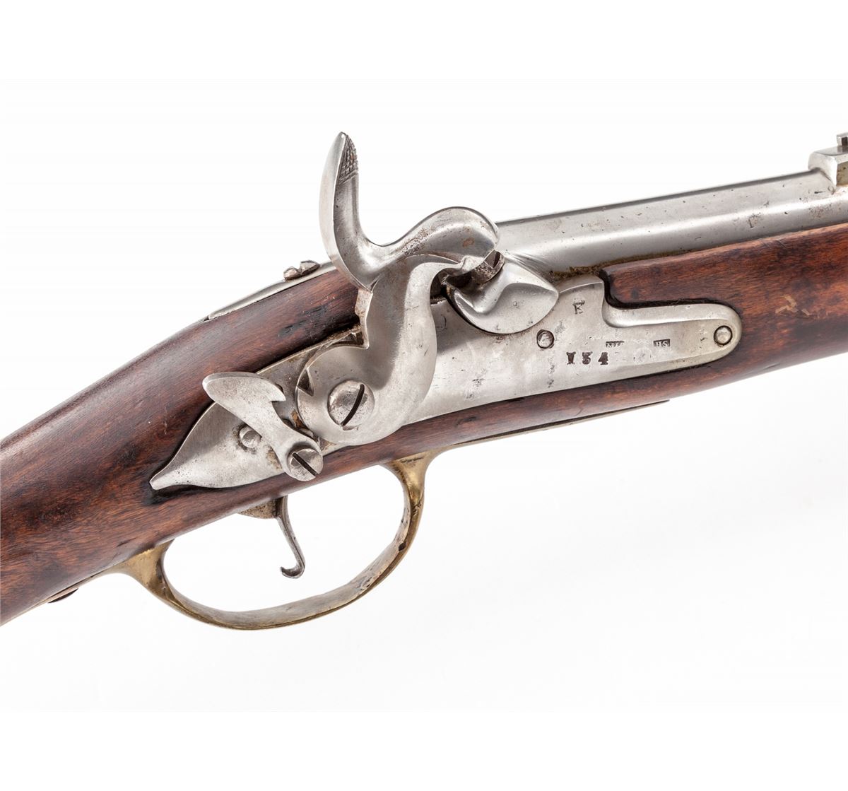 Continental Doglock Percussion Conversion Musket, #2931, .75 cal., 39'' barrel, bright finish, European walnut stock, with brass buttplate, triggerguard, sidelock, forend and cleaning rod ferrules. Lock marked ''134'' with ''(crown)/K'' proofmark. Condition is excellent. Smoothbore musket with bright even barrel showing light pitting near percussion nipple. Stock shows light sanding, oil darkening, and minor fractures near reinforcing nails. Rear triggerguard tang shows repair near forwardmost screw. Crisp action, bright bore. Est.: $500-$750. (Antique)