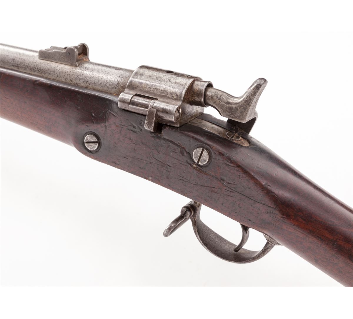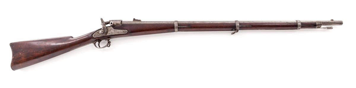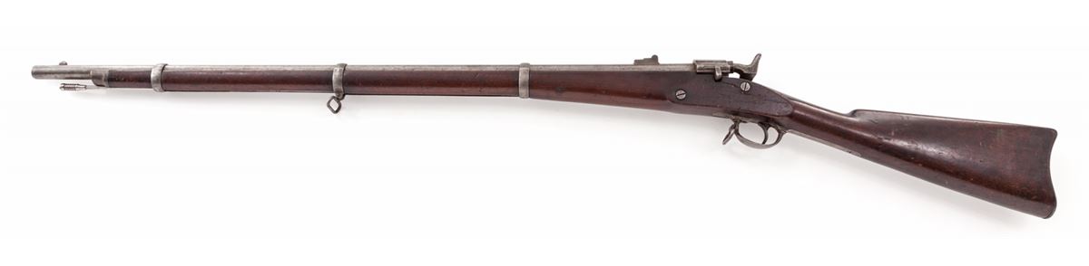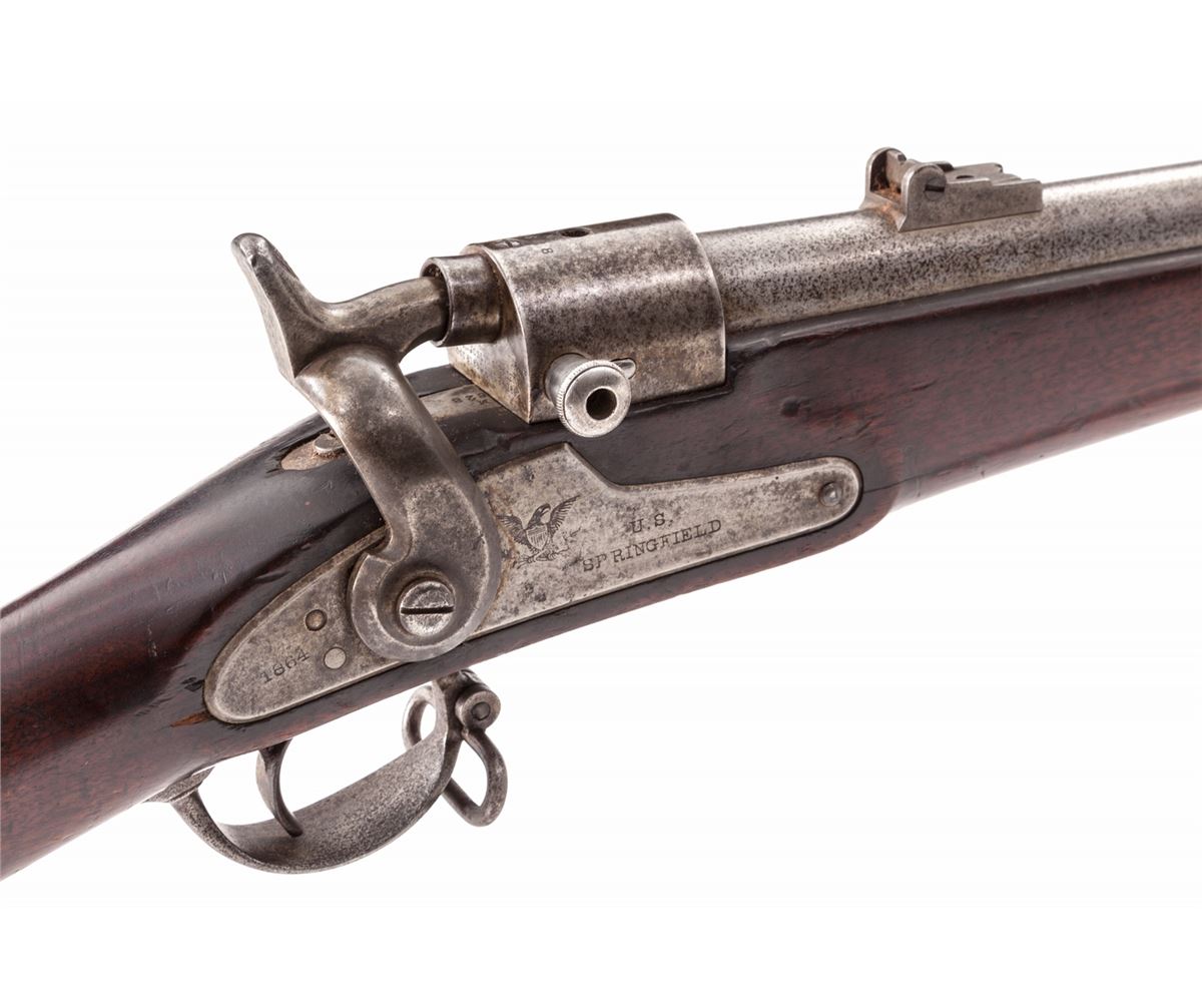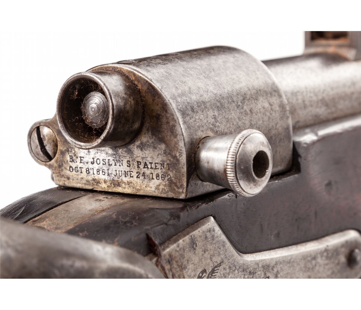 Joslyn Breechloading Conversion of an 1863 Springfield Musket, marked ''1628'' below breechblock, .50 cal., 35-1/2'' barrel, finished in the white, full-length walnut stock with three barrel bands and cleaning rod. Lockplate marked ''U.S. Springfield 1864'', with standard musket sights. Considered to be the first true breechloading cartridge weapon made in substantial quantity by a national armory, with 3007 mfg'd. Condition is about fine with light general carbon spotting to bright surfaces. Stock with minor scuffs and scratches, more pronounced to flat area near lockplate screws. Crisp action, fine bore. Est.: $1,800-$2,400. (Antique)