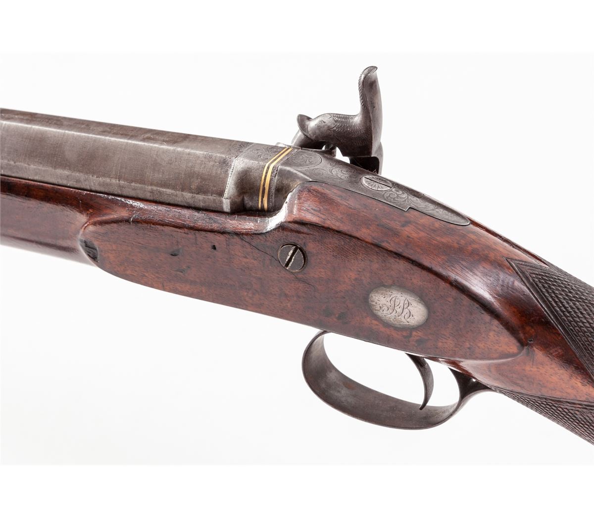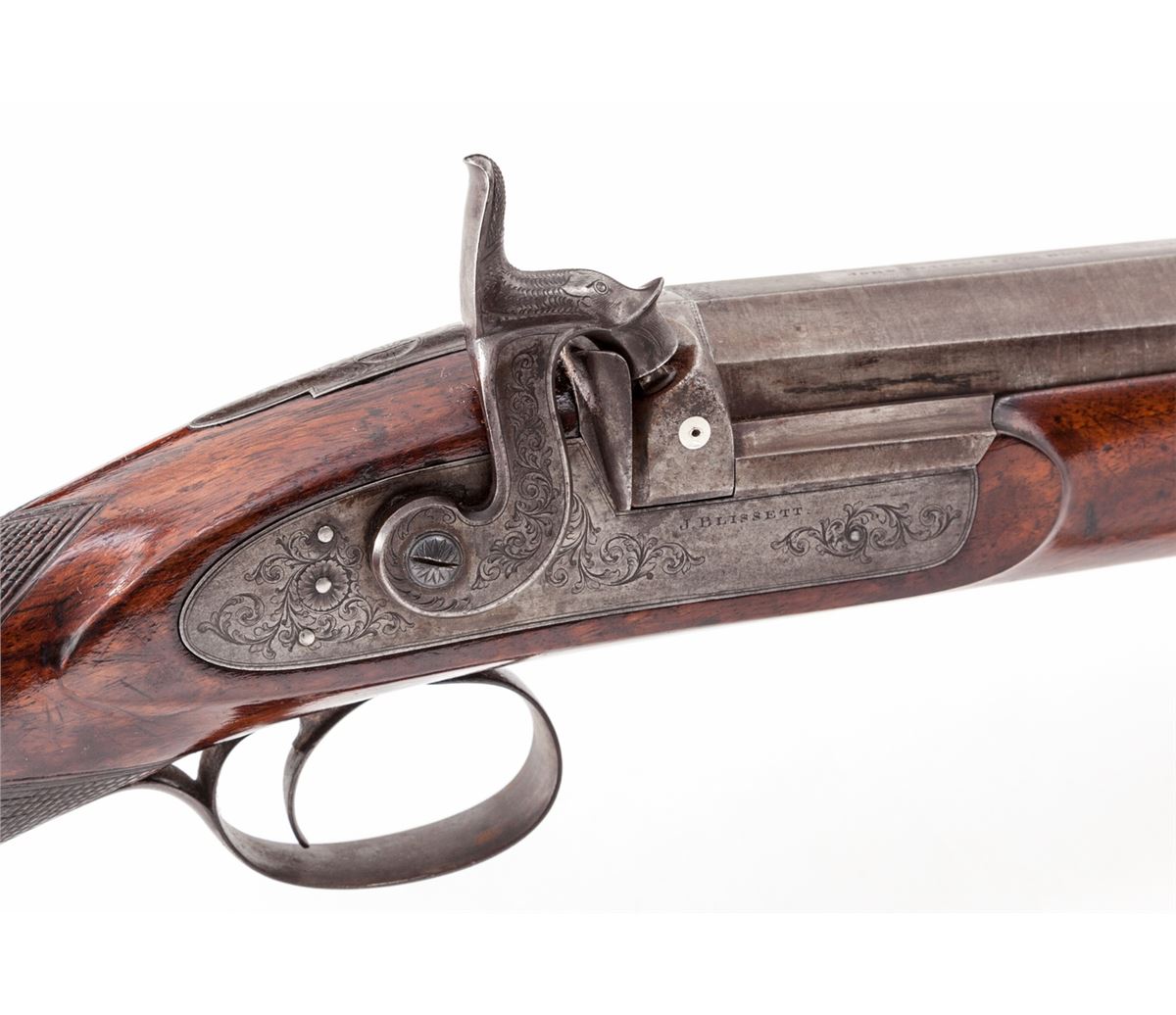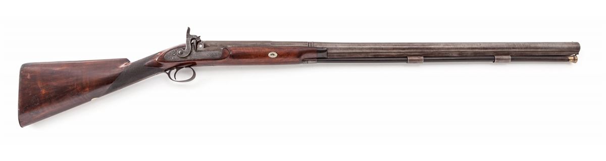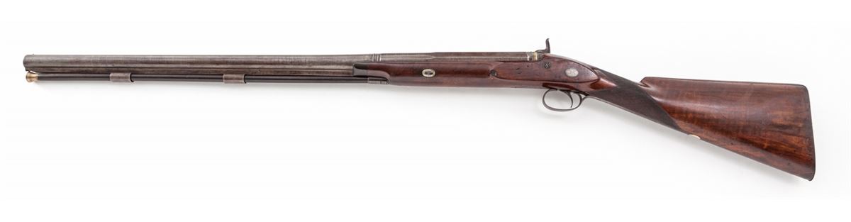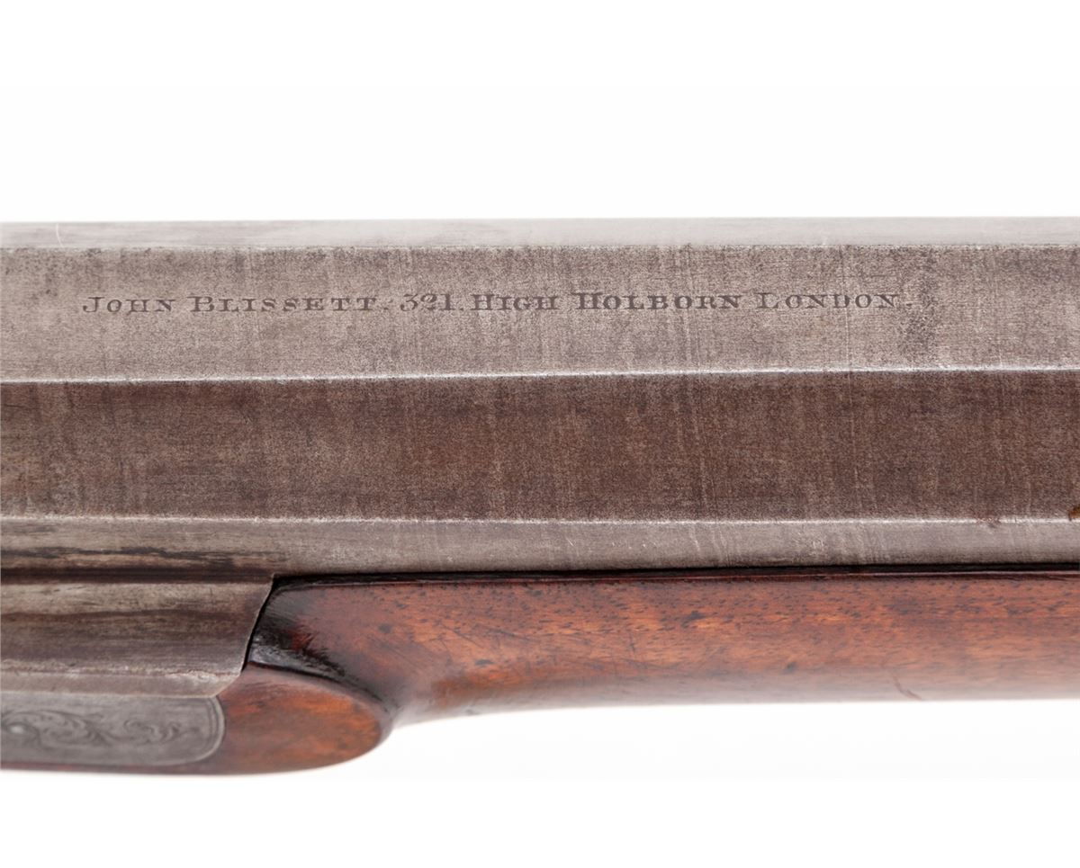 English Single Shot Fowler, by John Blisset, #2521, 8 bore, 34'' part-round banded browned barrel, scroll engraved lockplate, hammer and triggerguard; checkered English walnut stock with silver escutcheon to left side marked ''JB''. Ebony ramrod is retained. Breech plug features two gold bands. Top of barrel marked ''John Blisset, 321 Holborn, London''. Condition is fine. Finish to barrels has thinned back to 40% of original; sideplate has toned a silvery gray. Stock with dings and minor losses; checkering may have been re-traced at one point. Good action and bore. Est.: $1,800-$2,400. (Antique)