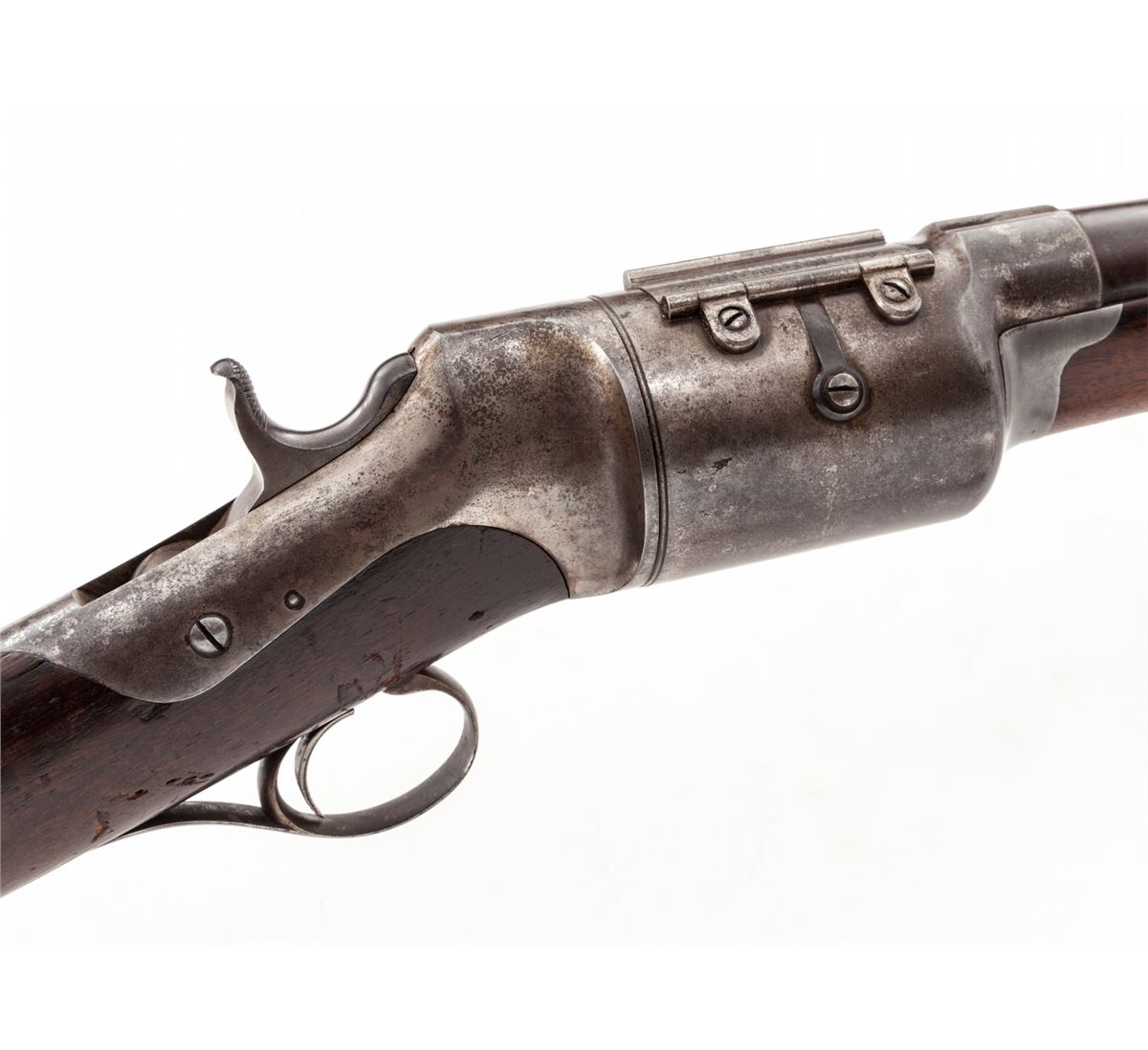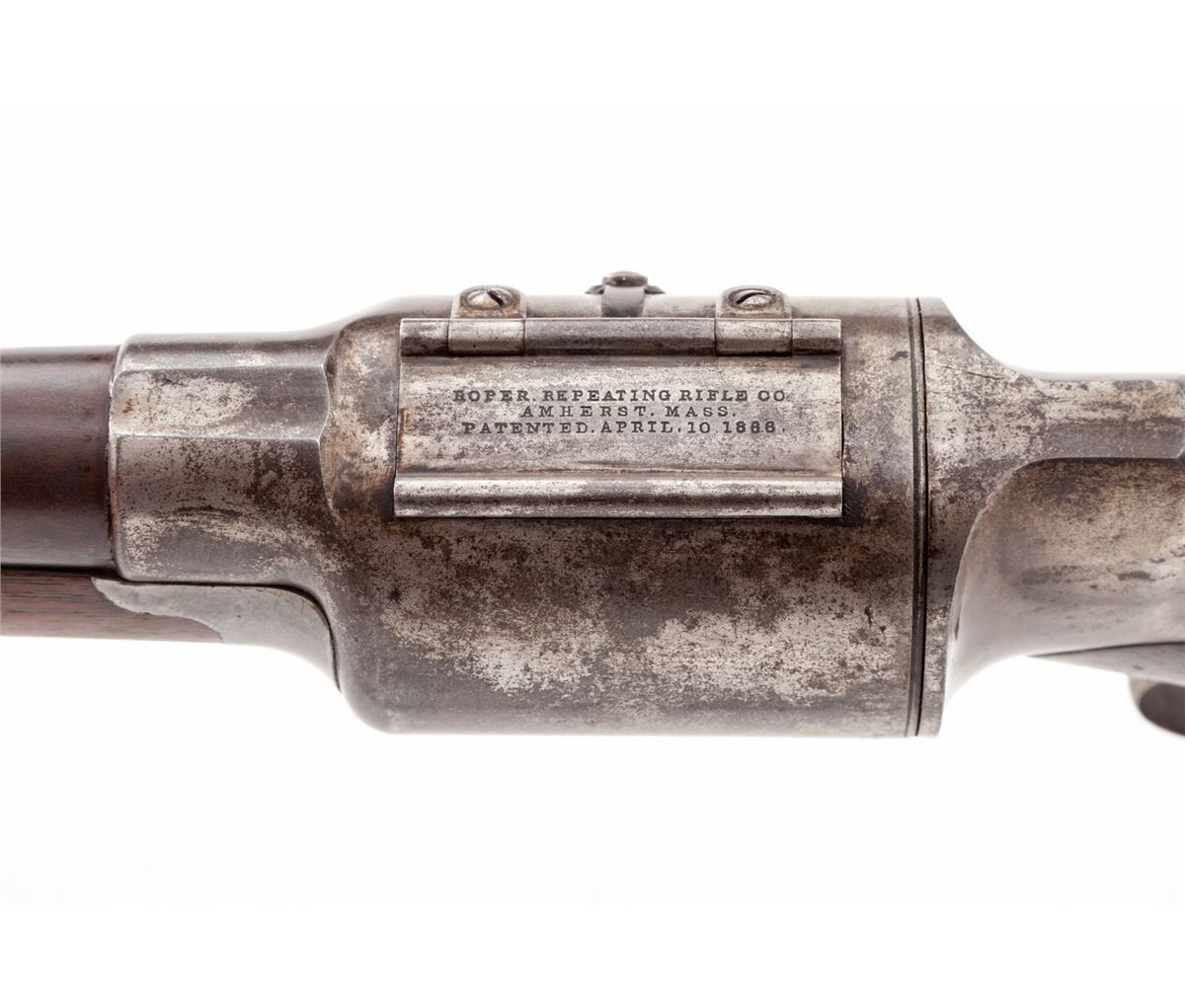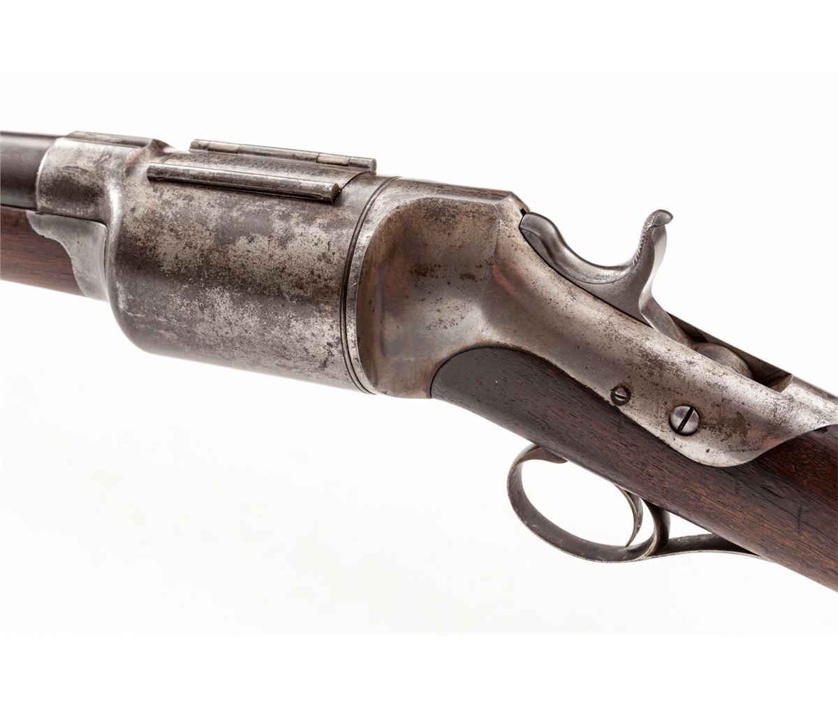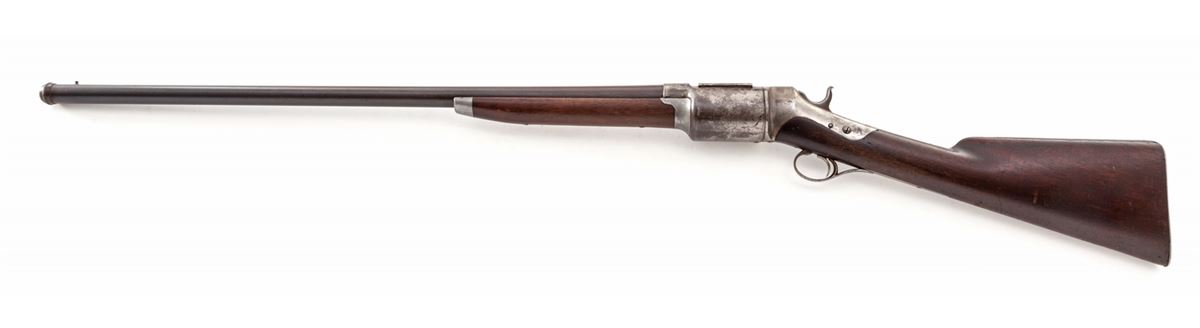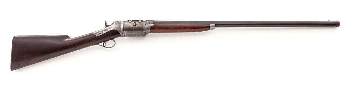 Roper Revolving Shotgun, #177, 12 ga., 28-1/4'' blue barrel, case hardened frame, walnut stock and forend, with steel buttplate. Mfg'd 1868-1876. Condition is very good to near fine. Barrel retains approx. 70% lightly toning blue. Good case colors in protected areas with the balance having gone silver. Stock with scuffs from handling and field use, and three hairline fissures at wrist beginning at rear frame screw. Tight good functioning action, with fine bore. Est.: $2,500-$4,000. (Antique)