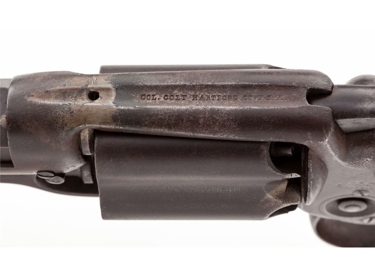 Colt Model 1855 Root Revolving Shotgun, #954, 10 ga., 27'' barrel, blue finish, checkered walnut stock and smooth forend. Scarce with approx. 1100 mfg'd between 1860-1863. Shotgun additionally features the large scroll triggerguard and smooth iron buttplate. Condition is very good to near fine with moderate general wear to all blue surfaces. Topstrap shows repair to forward portion directly above forcing cone. Stock with moderate flattening and oil darkening to wood. Good functioning action. Est.: $2,750-$4,500. (Antique)