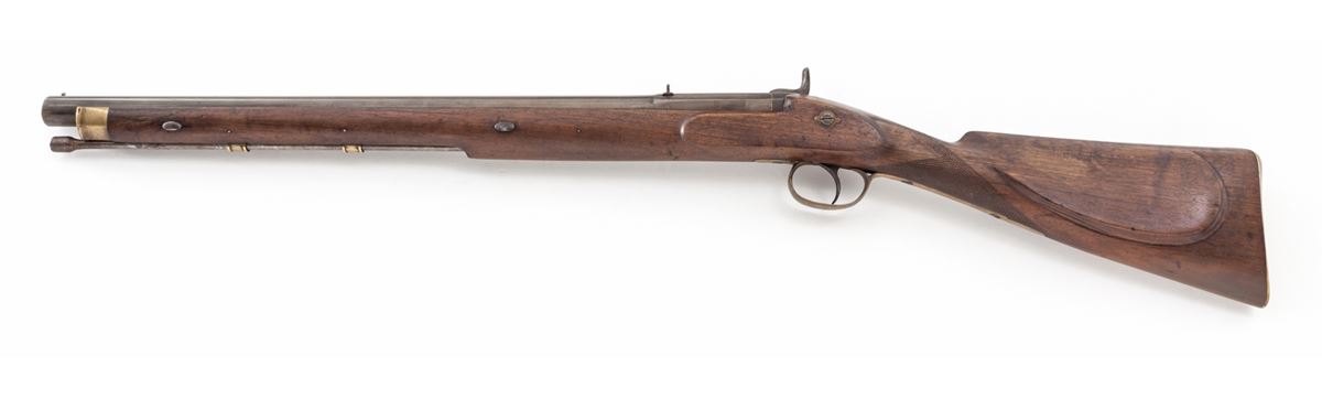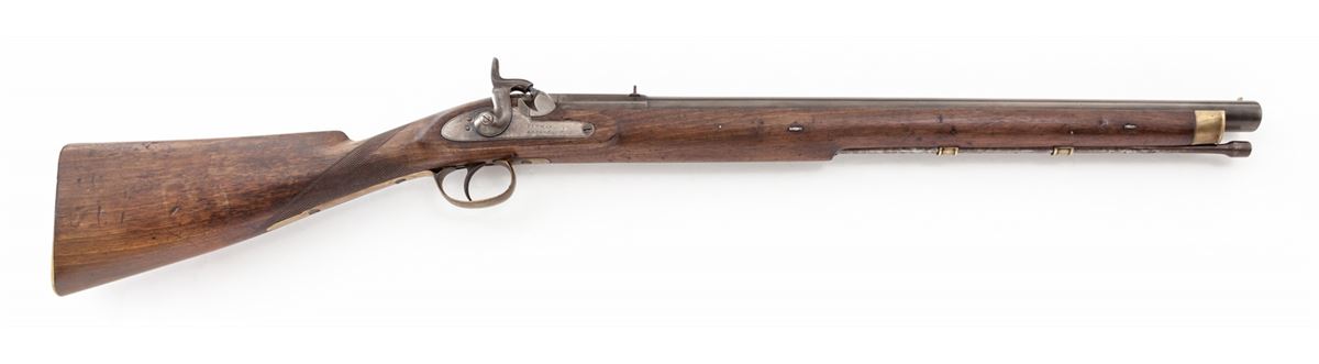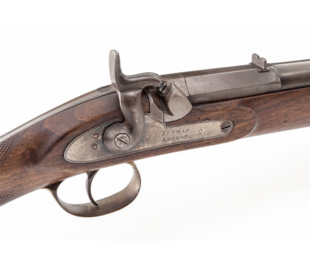 Large Bore Percussion Short Rifle, by Redman/London, 8 bore (.835), 26-1/2'' round barrel with octagonal breech area, case hardened lock and hammer with border stripe engraving marked ''Redman/London'', brass hardware, with coarsely checkered perchbelly full walnut stock. Iron ramrod is present. Condition is fine. Originally blued barrel has thinned back with only light original finish remaining in protected areas. Case hardened components retain 40% thinning tones. Triggerguard screws show moderate corrosion. Stock with light scuffs and flattening to checks. Good functioning action and bore. Est.: $2,000-$3,000. (Antique)