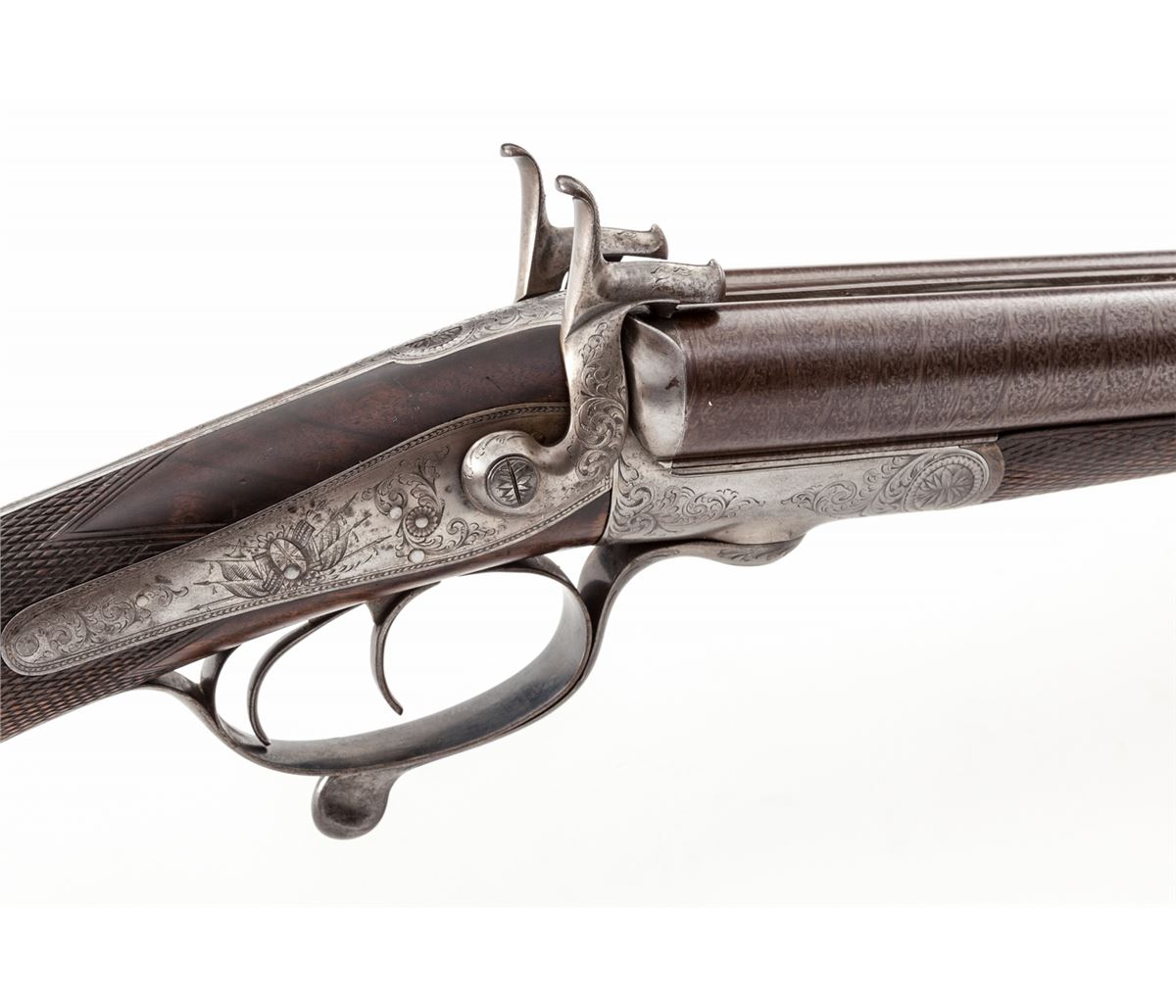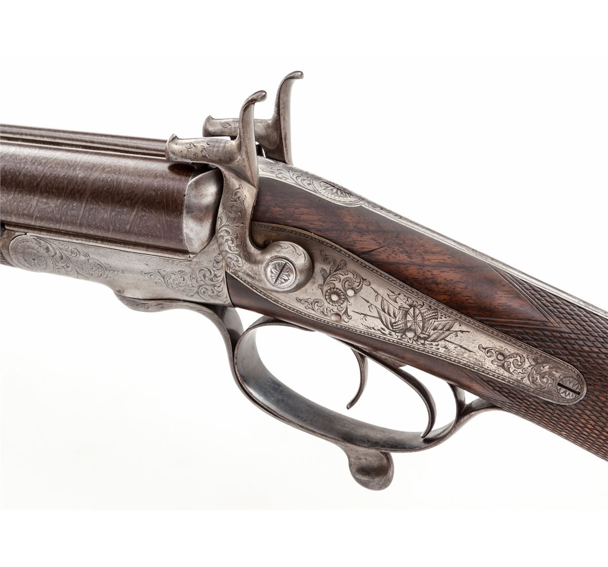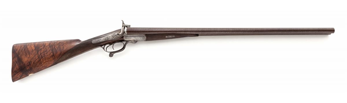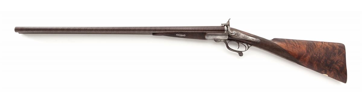 Antique English Pinfire Side-by-Side Fowler, by Tarratt, 12 ga. PF, 28'' smooth ribbed Damascus brown barrels, English banknote engraved frame, Stand of Arms and additional scrollwork to backlock panels, checkered straight grip fancy walnut stock and splinter forend, with engraved two-piece steel buttplate and gold ovoid escutcheon to bottom edge of stock. Condition is fine to near excellent. Barrels retain excellent damascus pattern with areas of light pitting just to left of center at rear portion of rib. Engraving detail is crisp with case colors only remaining in protected areas. Minor flattening to checks and nice general oil staining to stock. Left hammer has 1/8" lateral play. Beginning hairline fracture on right watertable. Chamber length about 2-3/4"; bores .726"/.726". Wall thickness approx. .032" and thinning at muzzle. Length of pull: 13-1/2". Action is tight; underlever is slightly loose. Bores and chambers are polished. Est.: $1,000-$1,500. (Antique)