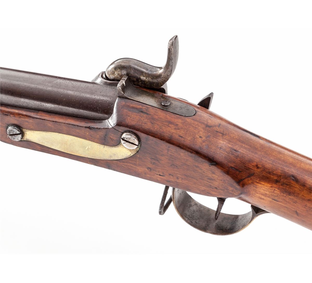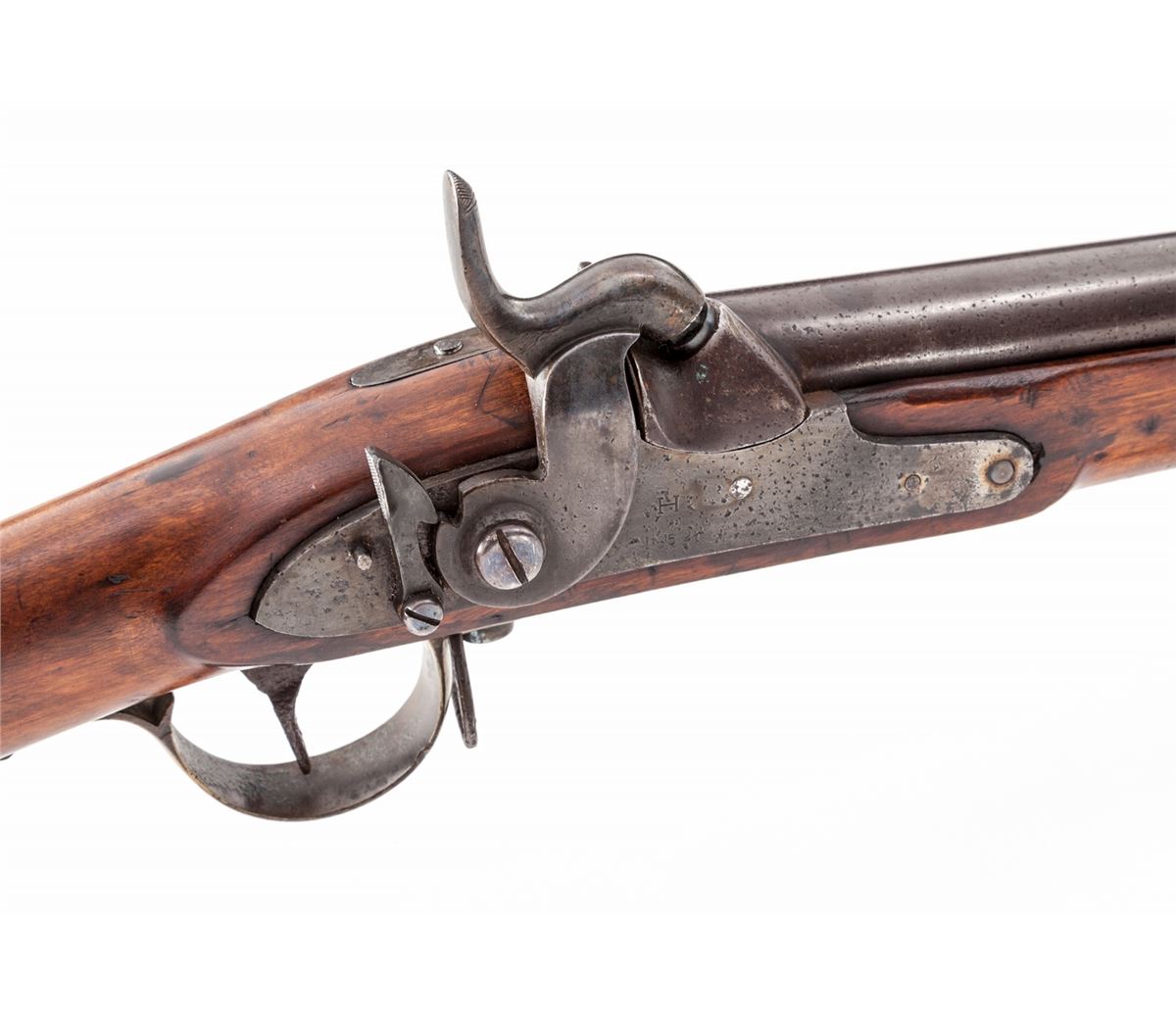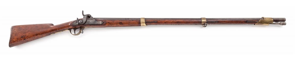 Scandinavian Doglock Percussion Conversion Rifled Musket, NVSN, lock marked ''H/1852'', .75 cal., 41'' steel barrel, brass bands, beech stock, brass buttplate, triggerguard, sideplate and barrel bands; large tulip-head ramrod. Condition is fine. Barrel retains approx. 70% of a later brown with very light speckling to center portion. Evidence of an upper handguard or pre-conversion barrel band. Stock with light scuffs and oil darkening. Good functioning action, very good bore. Est.: $600-$800. (Antique)