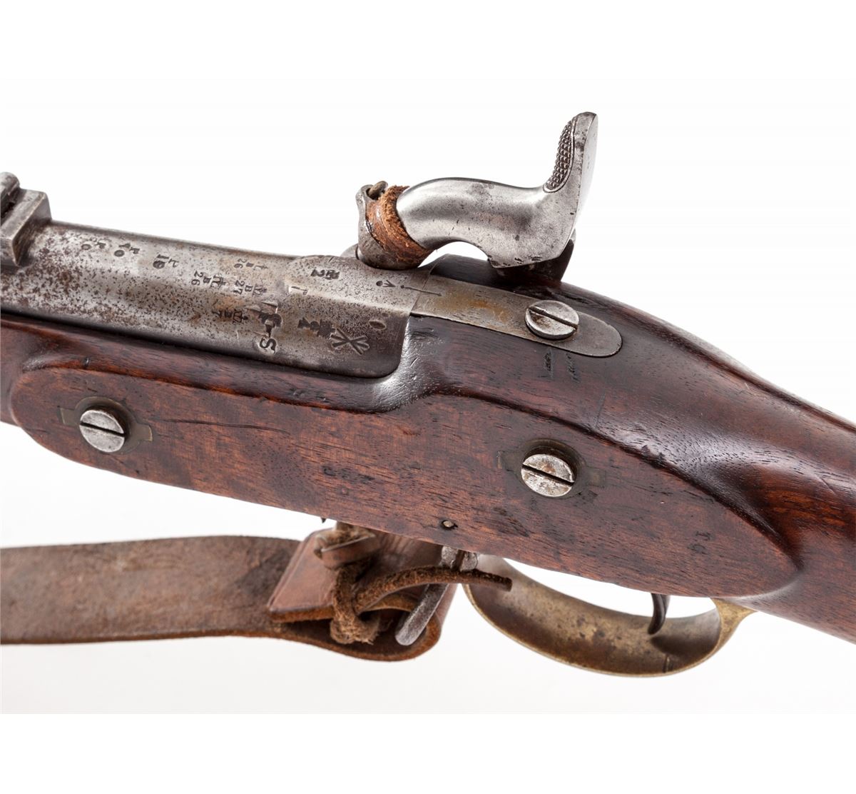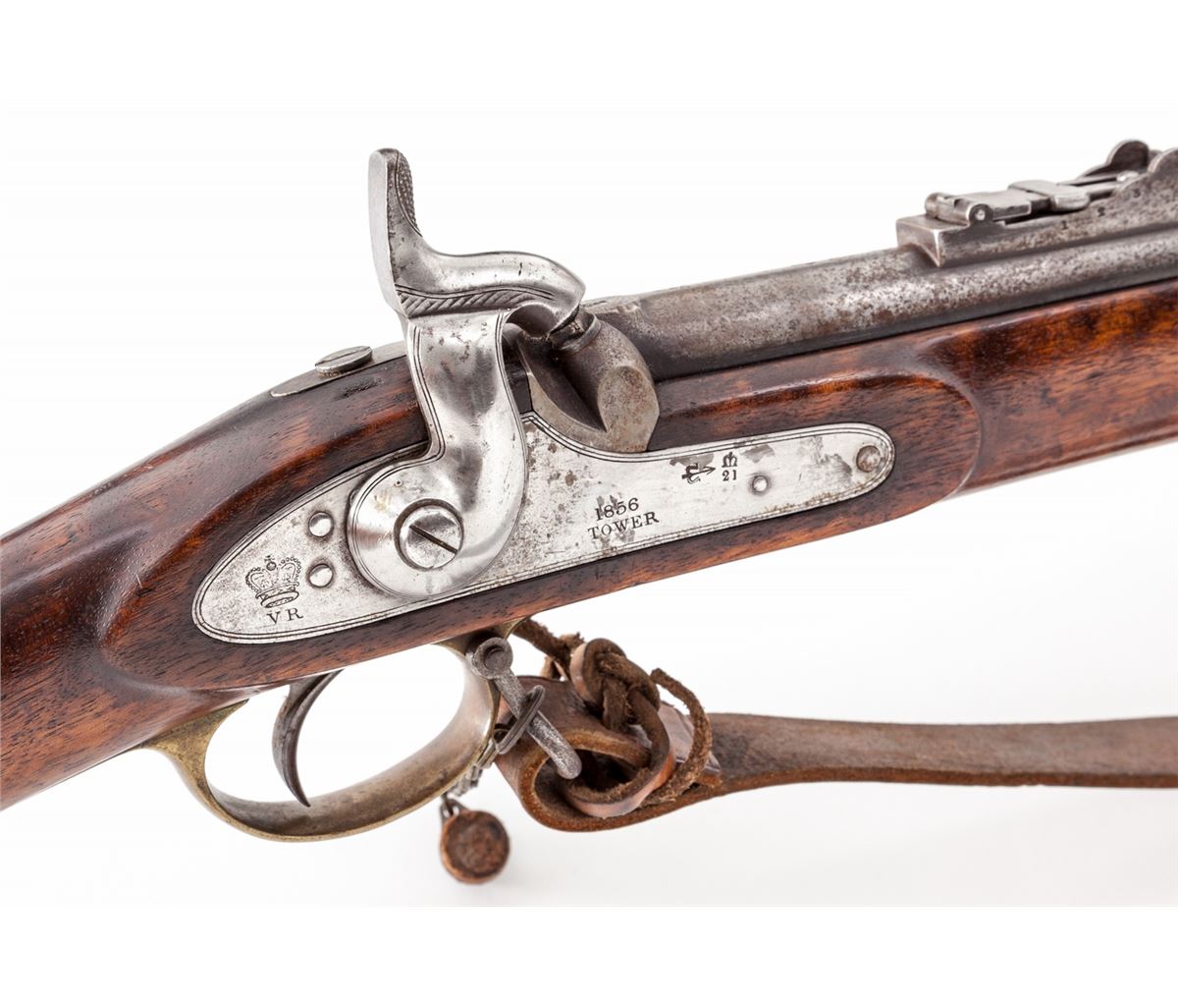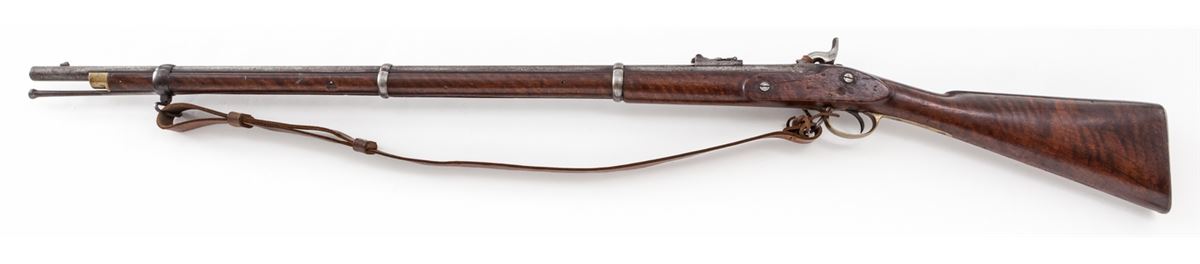 2nd Pattern 1853 Enfield Three-Banded Rifled Musket, by Tower (1856), NVSN, .577 cal., 36'' barrel, lion and ''WD'' cartouched walnut stock, brass buttplate, triggerguard and forend cap. Bottom edge of stock is neatly stamped ''J.P. Beadle-J. Borne New ImG7''. James P. Beadle (1863-1947) was an English painter of historical and military scenes. He is famous for battlescapes depicting scenes from the Peninsula War, Franco-Prussian War, Boer War, and WWI. His father was Major Gen. James P. Beadle as well. His most notable work being ''Neuve Chapelle'', 10 March 1915, ''Dawn: Waiting to Go Over, and Breaking the Hindenburg Line''. Ramrod and WWI era leather sling are present, as is leather nipple cover. Condition is very good to fine with light to moderate general frosting to barrel assembly. Stock with just light marks from handling. Action is crisp, bore is fair. Est.: $2,000-$3,000. (Antique)