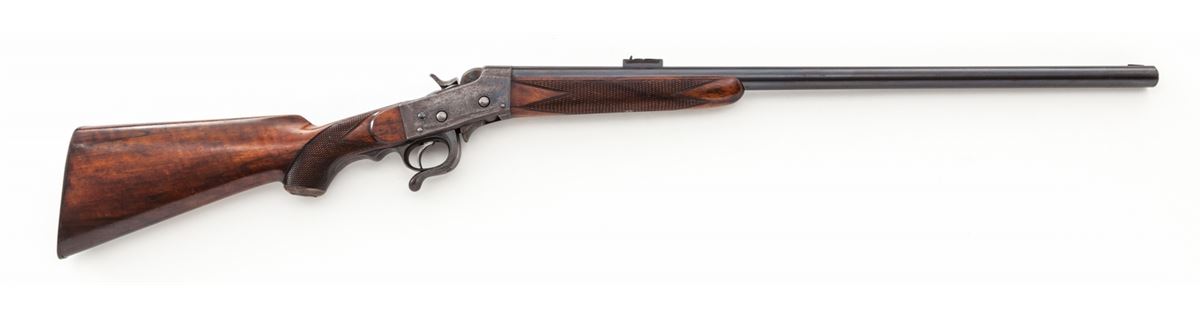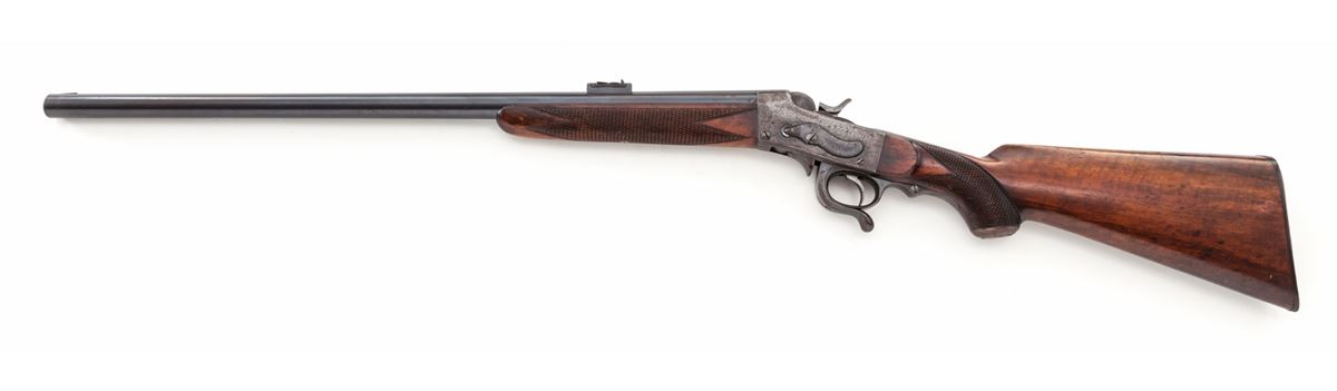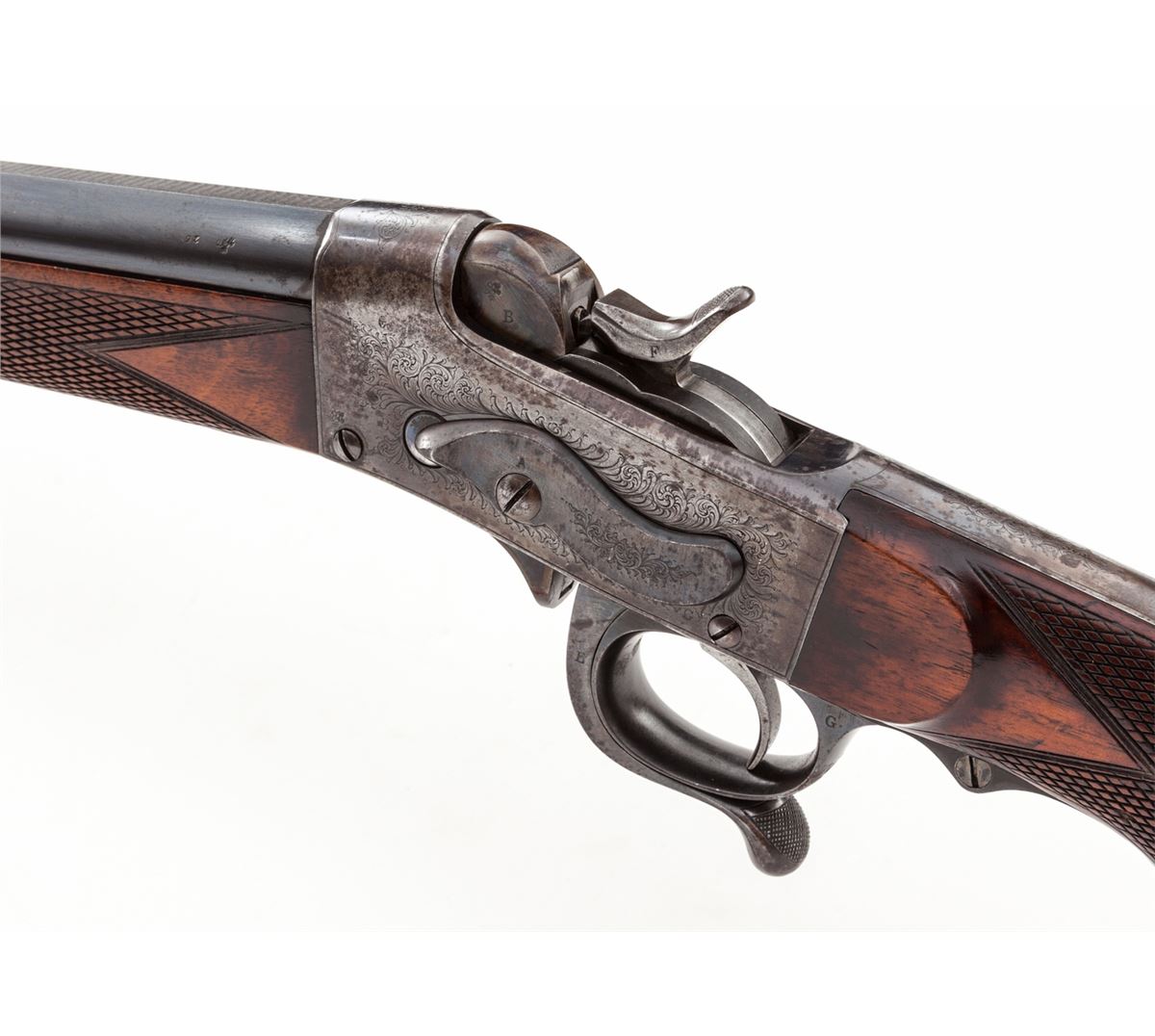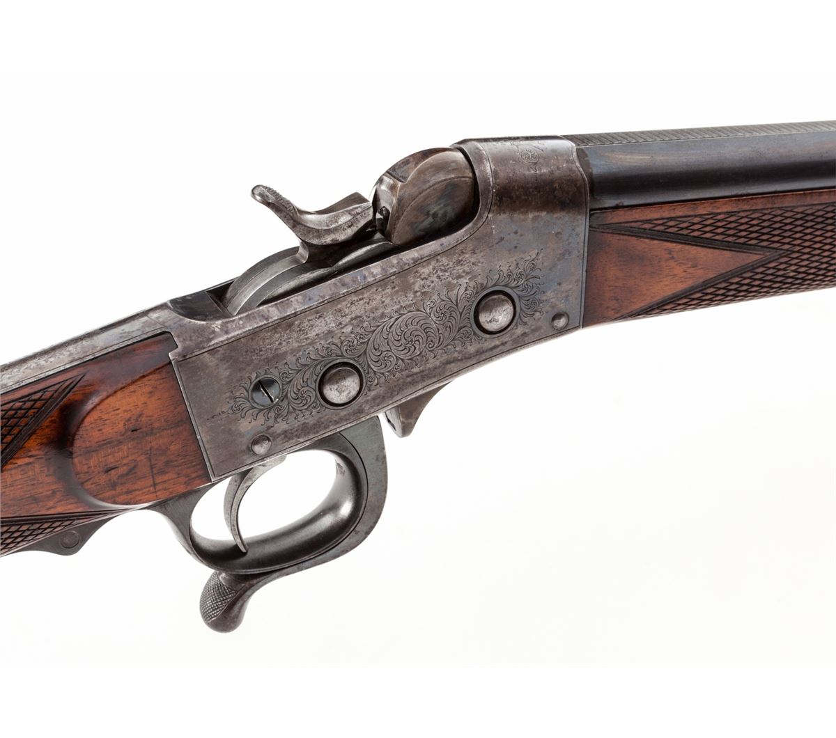 Unmarked English made Pieper Rolling Block Single Shot Rifle, #4655, .58 CF cal., 27'' blue barrel, banknote scroll engraved case hardened frame, checkered walnut pistol-grip stock and forend, with checkered horn buttplate, case hardened pistol-grip cap, three-leaf Express rear sight, and platina bead front sight. Condition is near excellent. Barrel retains approx. 92% lightly thinning and toning blue. Case hardened frame has thinned and toned retaining approx. 20% colors. Stock shows even flattening and light bruises. Action is good, bore is mirror bright. A classic 1870s African big game rifle. Est.: $2,500-$4,000. (Antique)