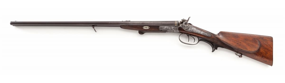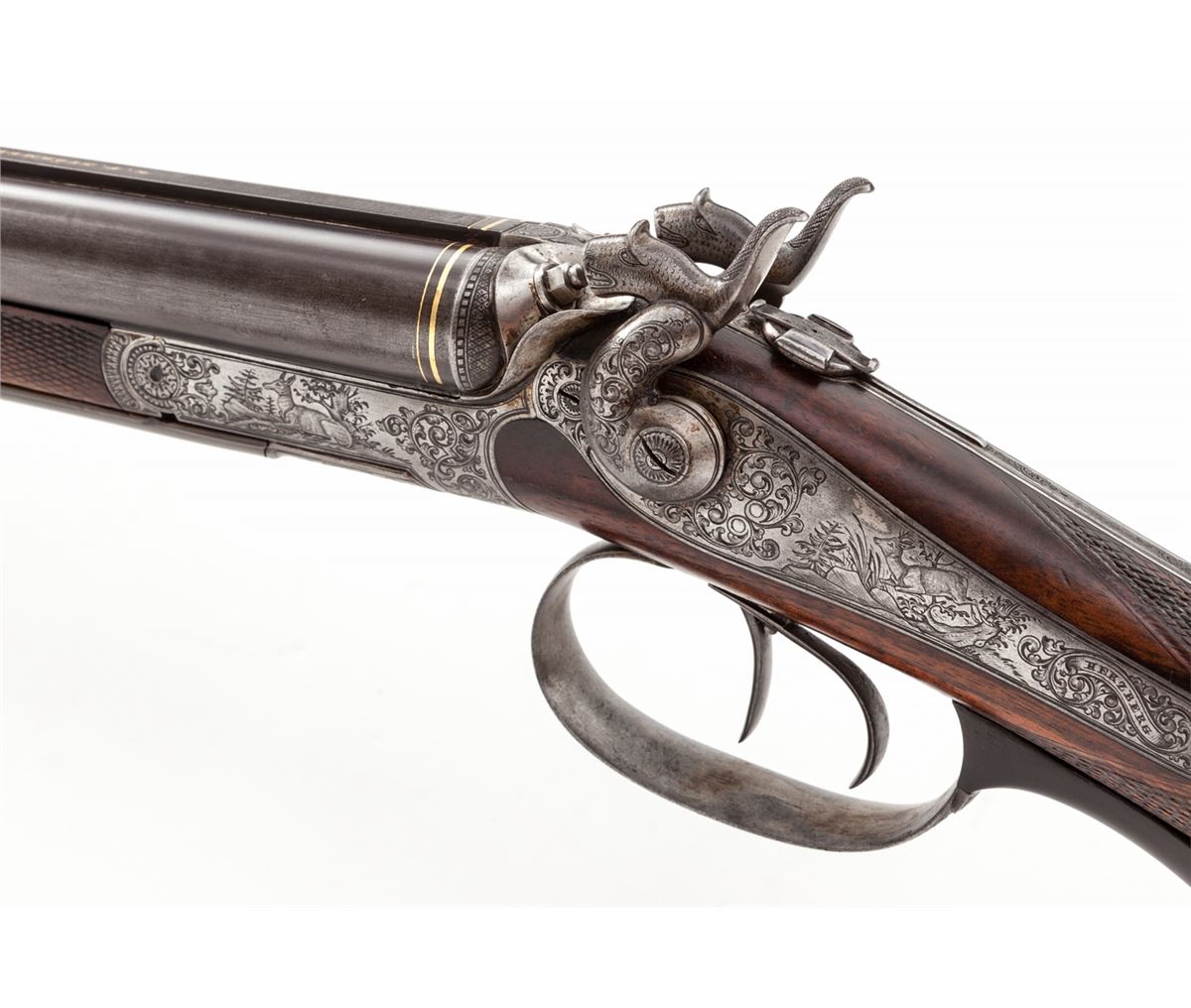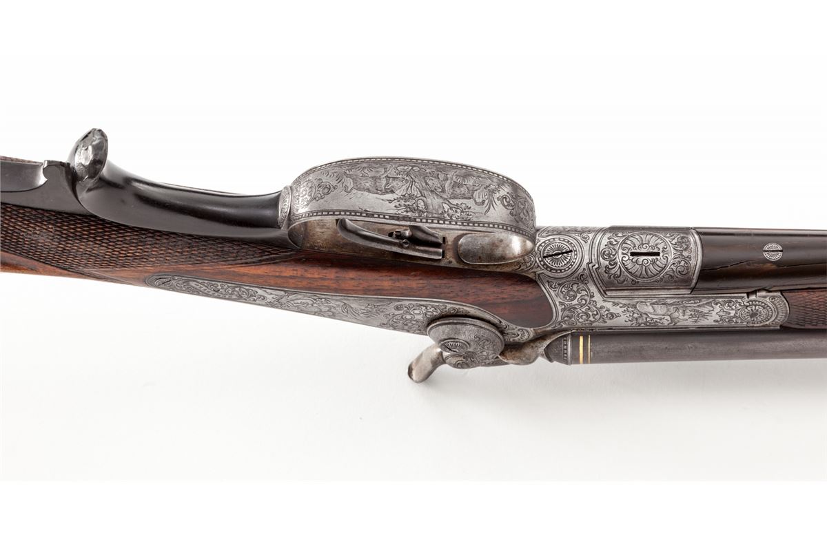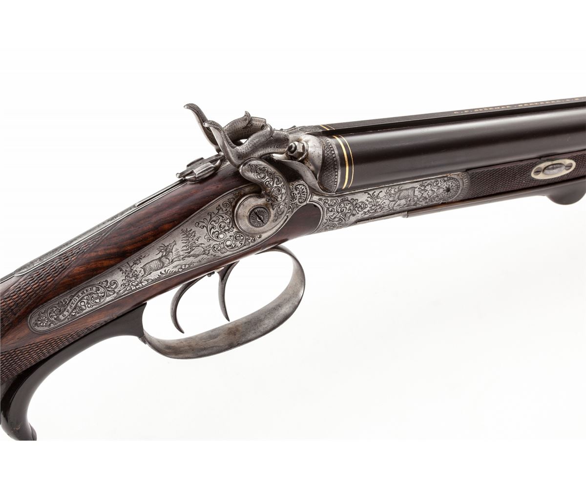 Antique German Underlever Side-by-Side Rifle, by G.F. Stormer, (Herzberg), NVSN, 11mm, 26'' barrels, three-blade Express sight, windage adjustable pin front sight, pop-up tang sight, gold bands at breech, game scene and scroll engraved frame, backlock and hammers; checkered cheekpiece European walnut stock, splinter handguard, horn underlever and triggerguard return and smooth steel buttplate with light ornamentation. Condition is near fine. Barrels retain approx. 85% toning blue. One of the three sight leafs is missing. Tip of splinter forend and horn underlever show repairs. Case hardened frame has mostly turned silver but detail and workmanship of engraving is excellent. Stock with light general overall knackering and flattening to checks, predominantly on forend. Action is good, bores are very good with mild frosting in the grooves. Est.: $1,200-$1,800. (Antique)