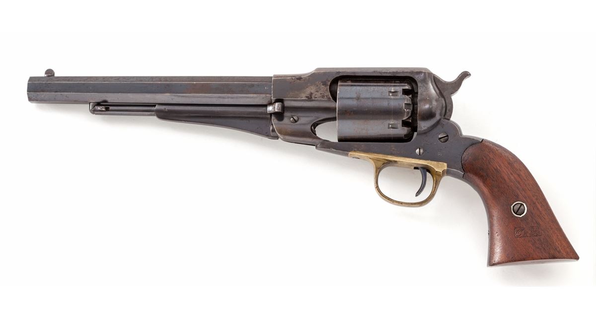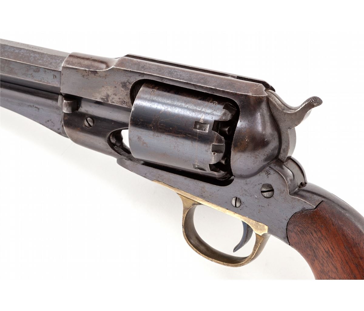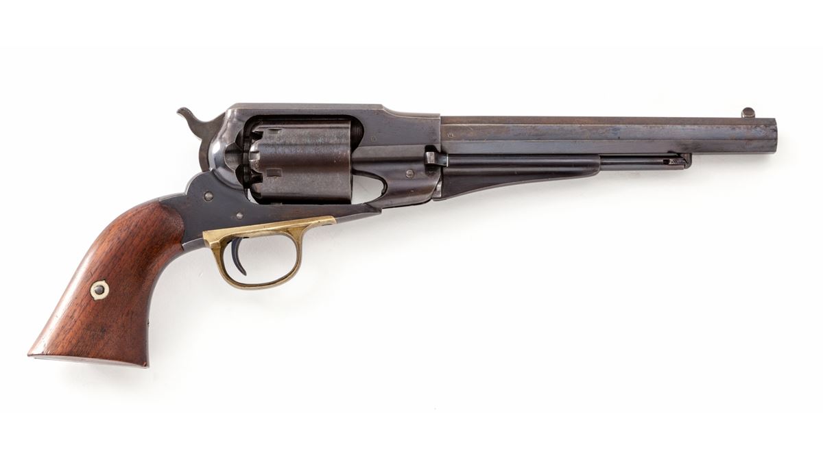 Remington Model 1858 New Model Army Percussion Revolver, #102724, .44 cal., 8'' barrel with two-line barrel address, blue finish, walnut grips with Ainsworth (OWA) cartouche, and brass triggerguard, with original pinched steel front sight. Shows ''DR'' and ''W'' inspector's markings to metal components. Condition is excellent retaining approx. 90%-92% thinning blue. Grips are excellent with only slight impressions. Cartouche is extremely crisp, as is action and bore. Est.: $4,000-$6,000. (Antique)