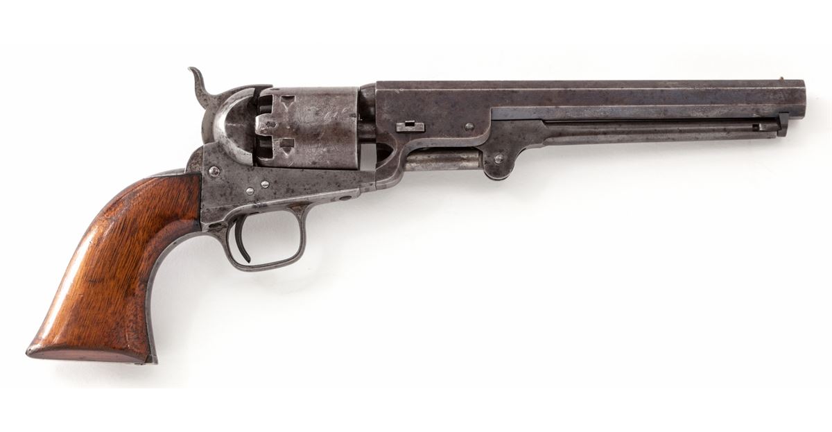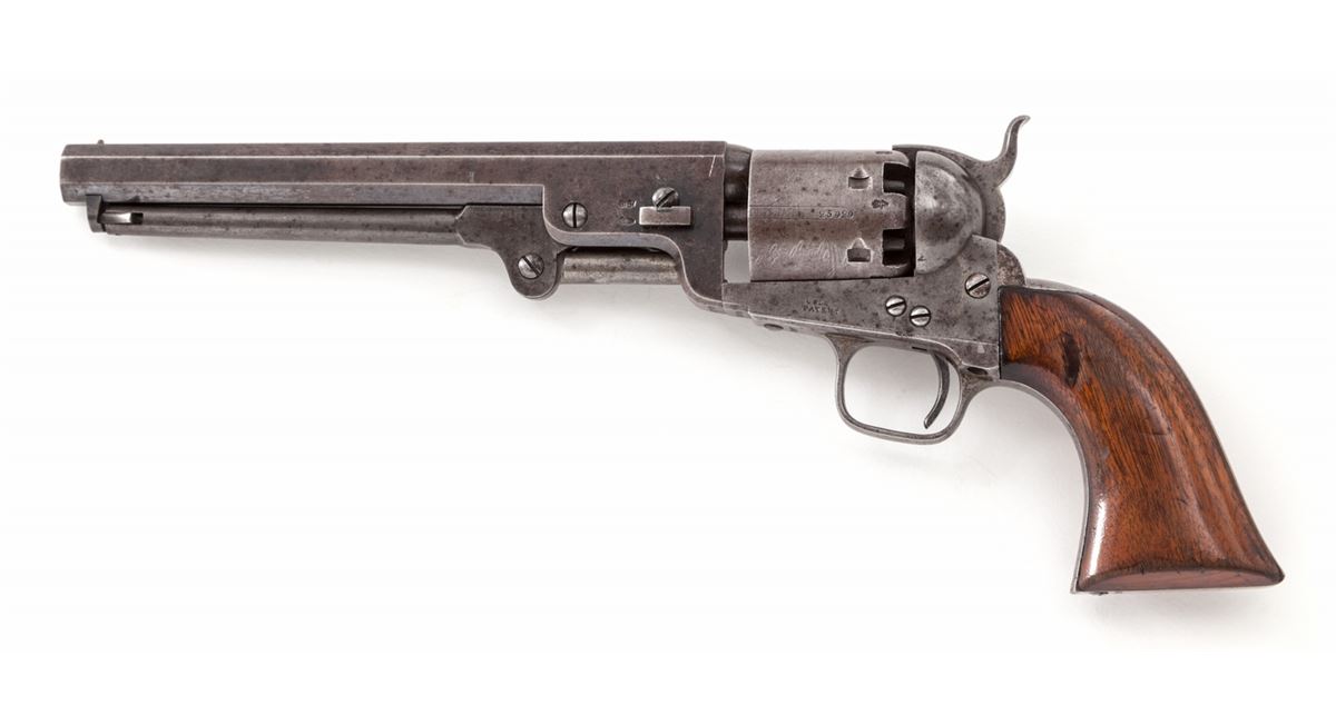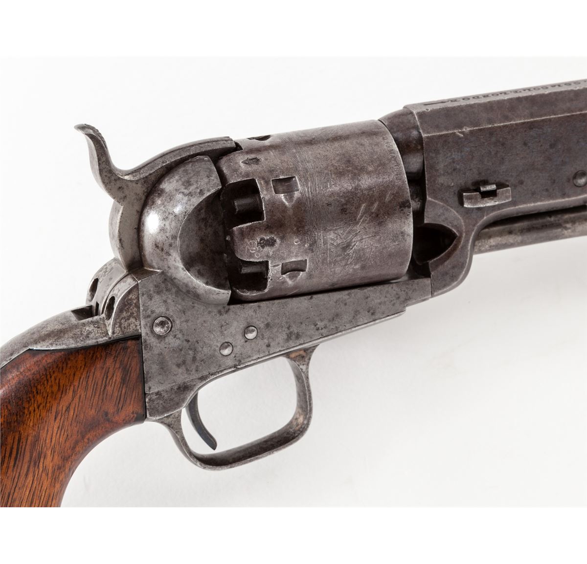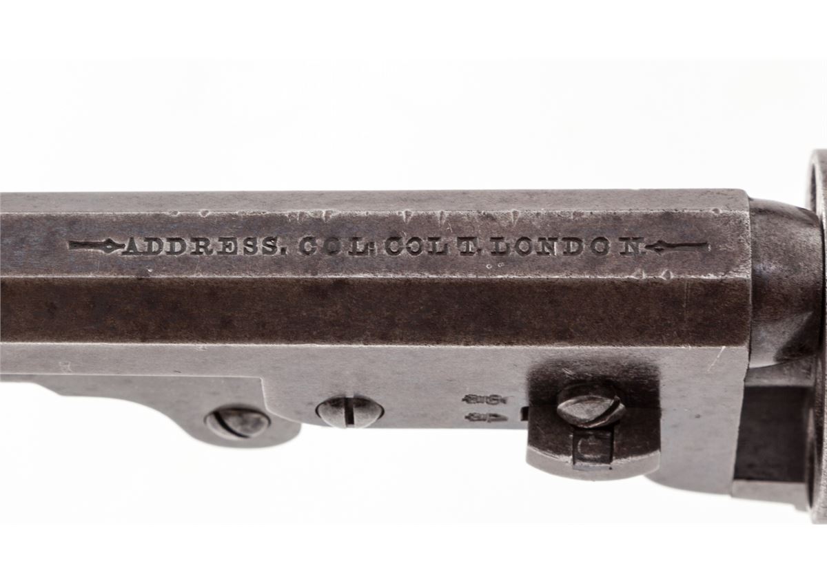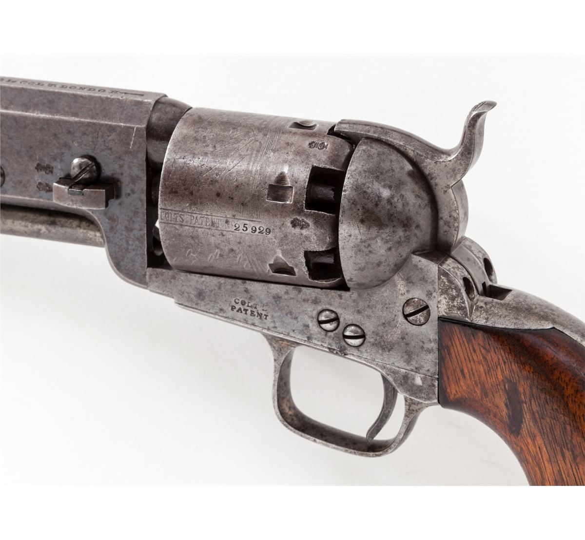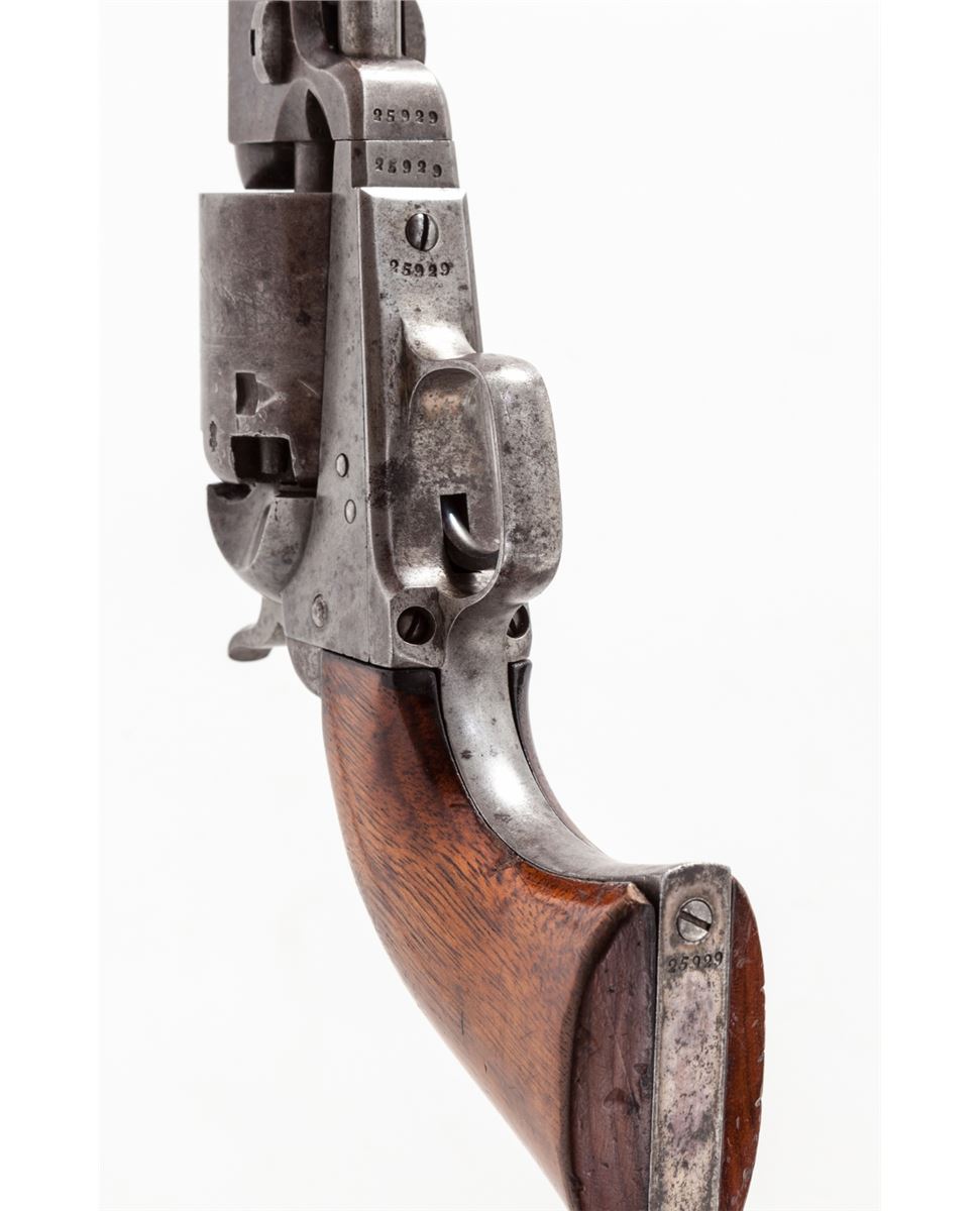 Colt London Navy Percussion Revolver, #25929, .36 cal., 7-1/2'' blue barrel, case hardened frame, iron triggerguard and backstrap, with one-piece walnut grips. ''(Crown)/V'' proofmarks to barrel and cylinder. Top of barrel marked ''Address Col. Colt, London''. Mfg'd 1855. Condition is very good. Barrel assembly retains approx. 30% graying blue. Muted case colors to frame, with correct domed screws with crisp straight slots. Grips retain approx. 90% original varnish. Action is good, bore is fine. Often found in the possession of officers during the Crimean War. Est.: $2,500-$4,000. (Antique)