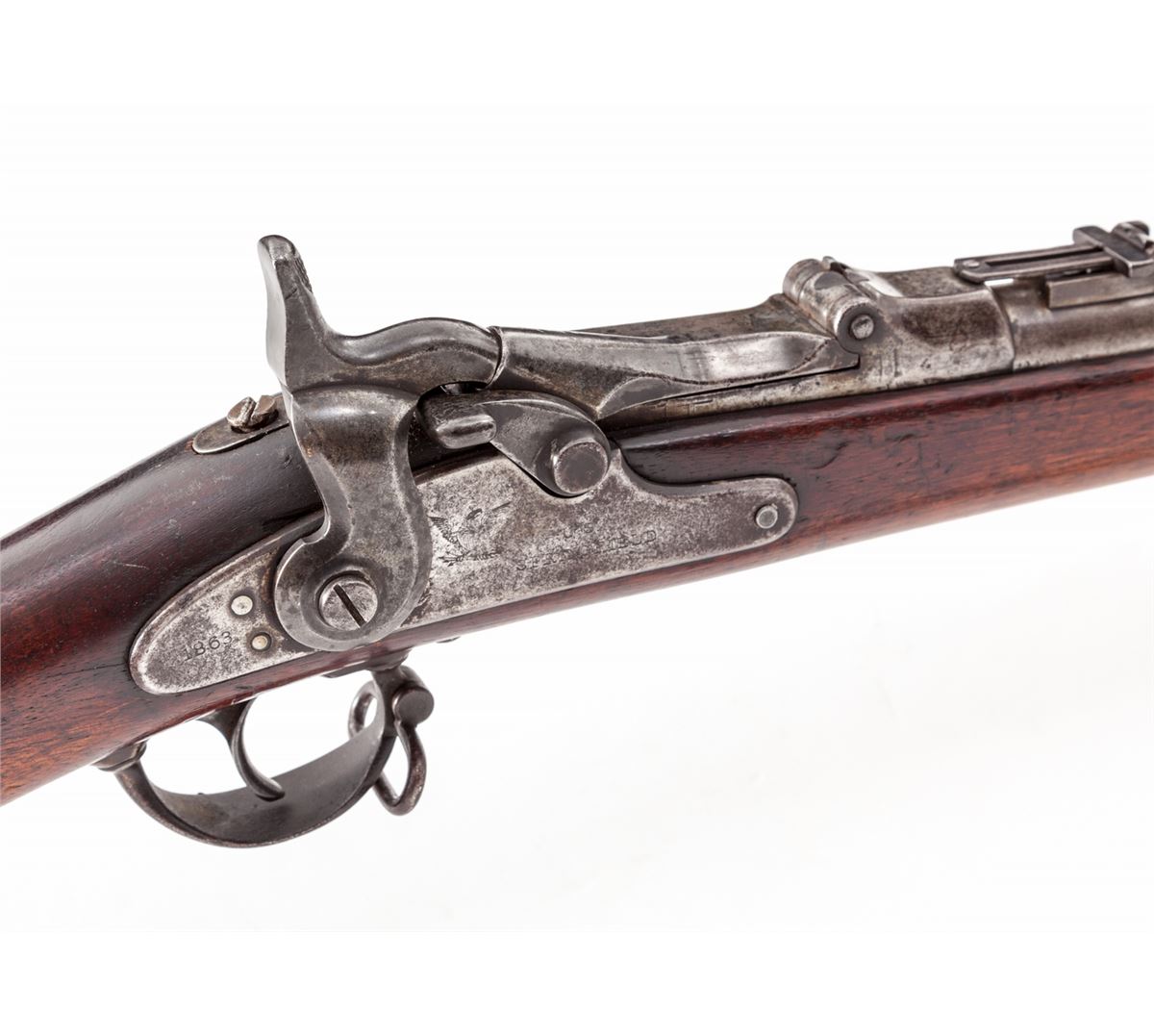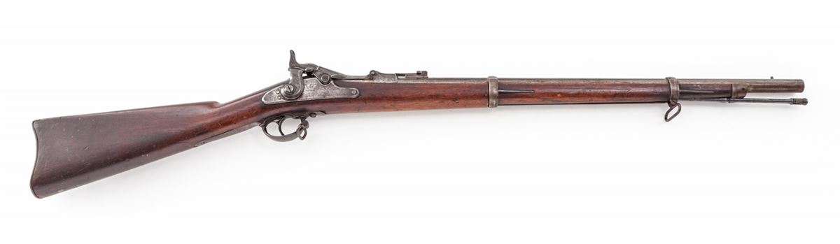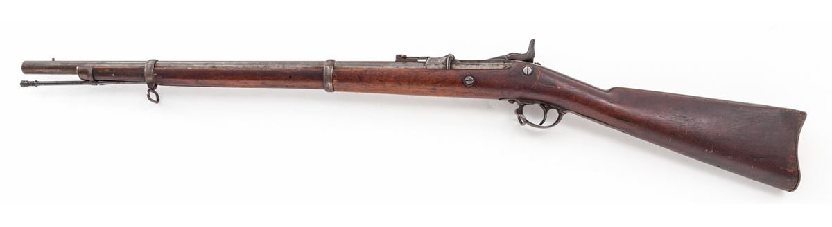 U.S. Model 1868 Trapdoor Rifle, by Springfield, #234, .50-70 cal., 24'' barrel, bright finish, cartouched walnut stock, with ramrod. Breechblock dated 1870; sideplate dated 1863. Stock tapers nicely with no indication of shortening. Condition is about fine. Barrel and sideplate with moderate carbon spotting. Stock with light dings and impressions. Good action, very good bore. Est.: $800-$1,200. (Antique)