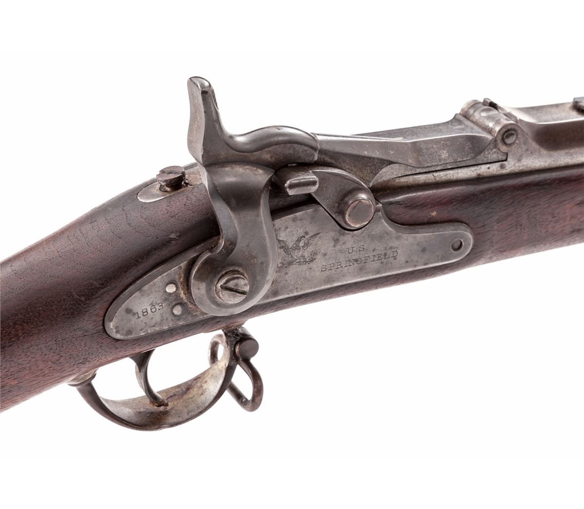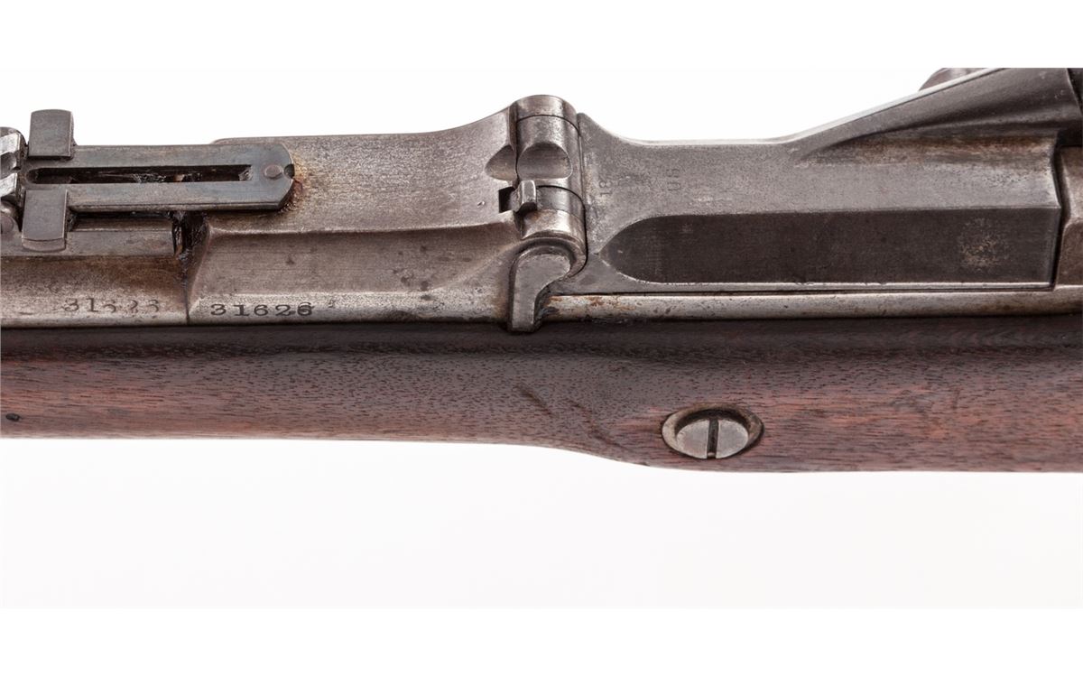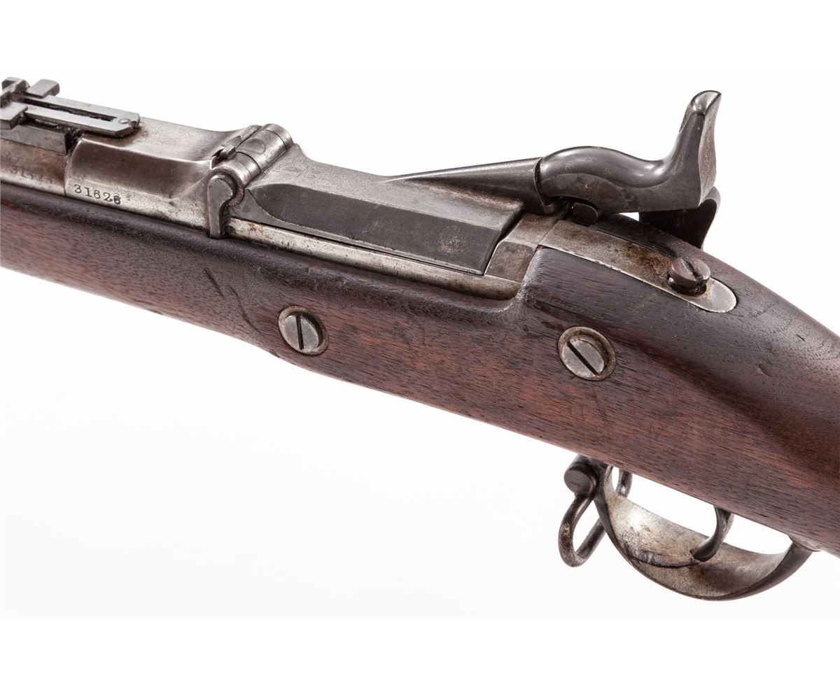 U.S. Model 1868 Trapdoor Springfield Rifle, #31626, .50-70 cal., 32-1/2'' bright barrel, 1863 dated lockplate, 1870 dated breechblock, walnut stock, with two barrel bands and adjustable rear sight. Condition is about fine retaining approx. 70% blue to hammer and lockplate. Bright surfaces with dried grease and light carbon spotting. Stock with scuffs and scratches, oil darkening, and one small fissure emanating from apex of lockplate. Ramrod is present. Good action, very good bore. Est.: $750-$1,000. (Antique)