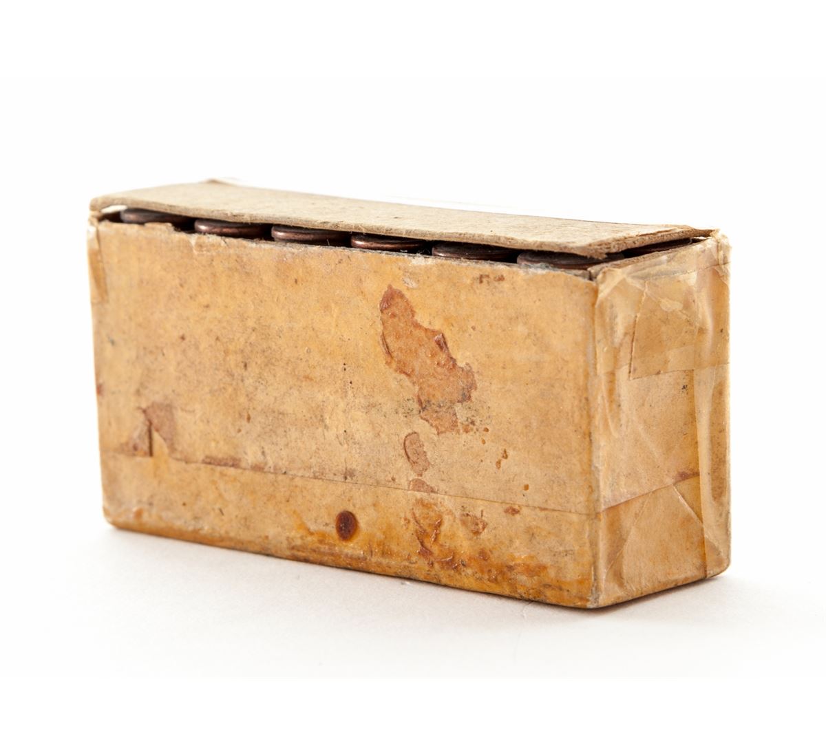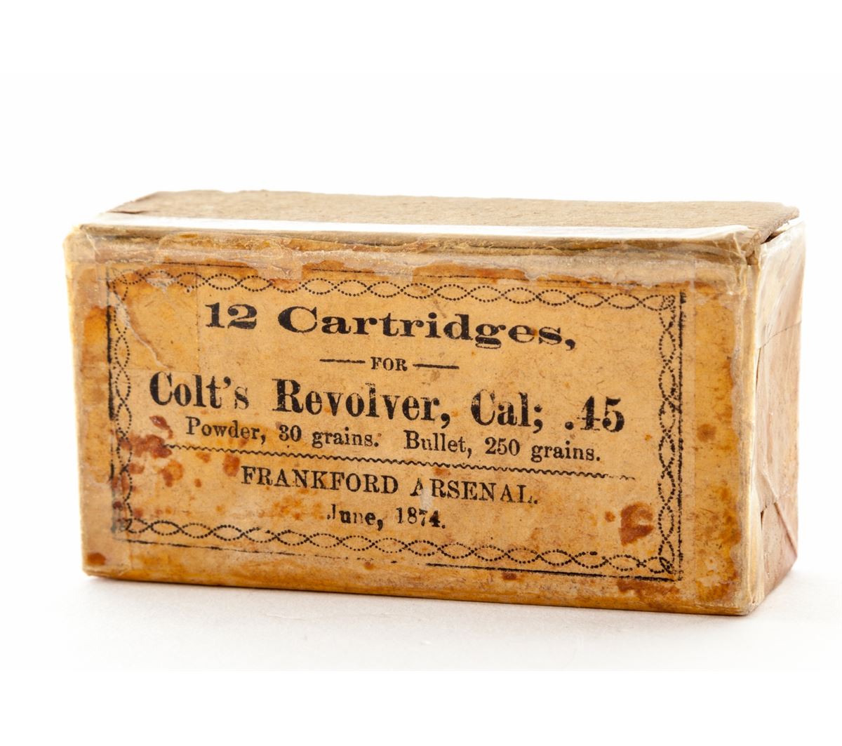 Early Frankford Arsenal Box of 12 Cartridges for Colt .45 Cal. Cavalry Model, dated June 1874. Box is full and sealed. Condition is excellent with minor discoloration to paraffin water protectant. Est.: $300-$500.