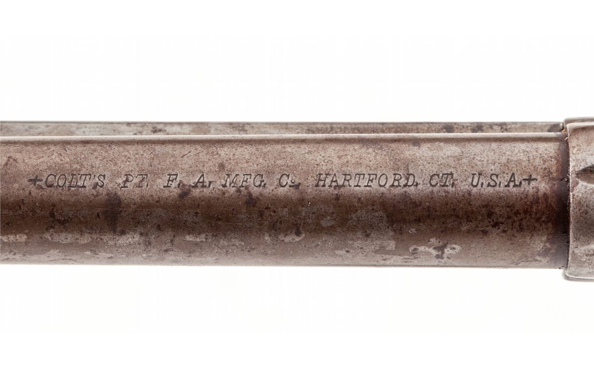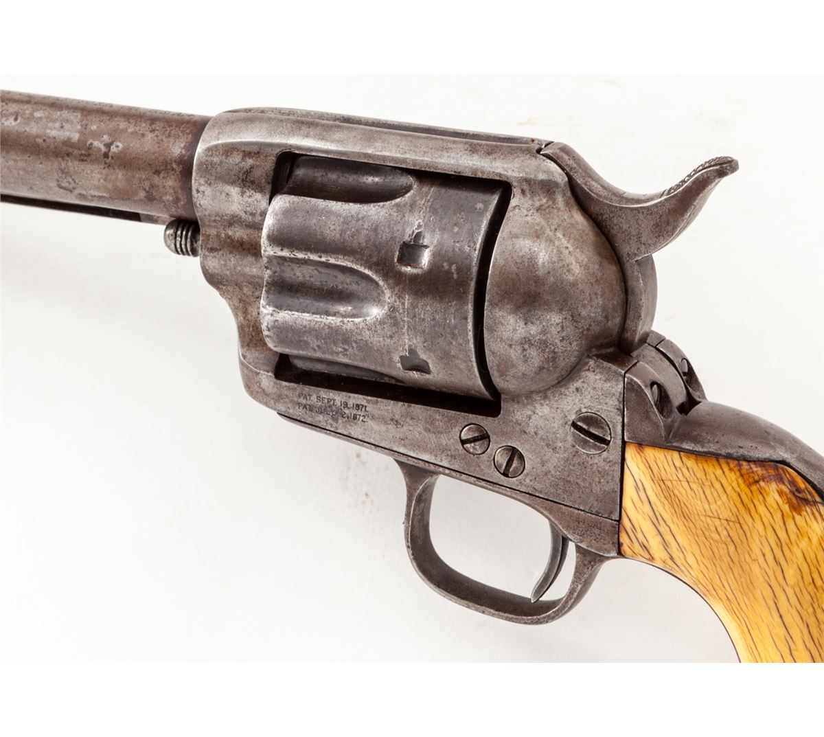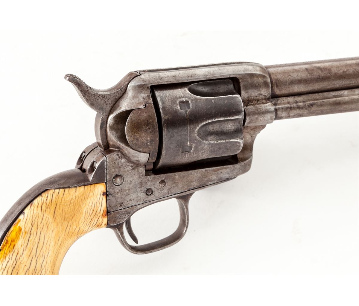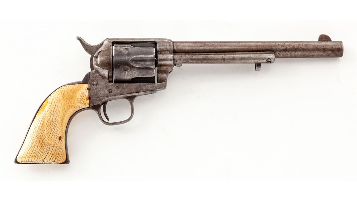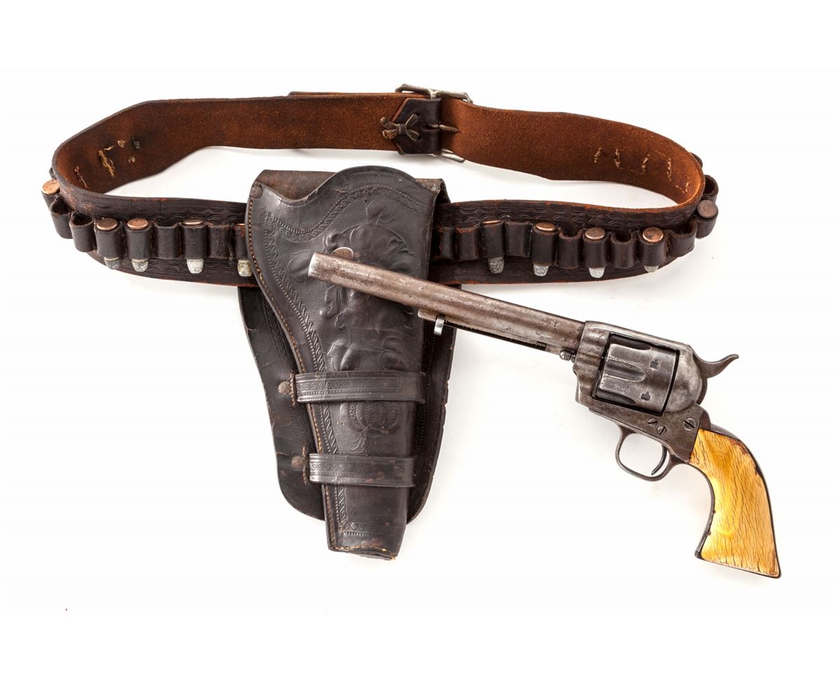 Scarce Colt Rimfire Single Action Revolver, #694, .44 RF (Henry) cal., 7-1/2'' barrel, blue and case hardened finish, with one-piece bone ivory grips. In period tooled leather belt and holster containing fifteen (15) .44 Henry RF cartridges. These revolvers are considered scarce with only approx. 1863 mfg'd, with most mfg'd between 1875-1878. Revolvers in this caliber show hard use due to the fact that because the cartridge was obsolete, many were shipped to foreign countries where hard use and little care was the norm. Many were later converted to .22 LR prior to their shipment. This particular example was shipped June 28, 1876, to Mayer & Geiger, Omaha, NE. Buttstrap later marked ''Douglas Co. SO'' (probably for Sheriff's office). Includes factory letter verifying caliber, barrel length and finish. Condition is about good retaining little original finish and showing possible later coloring to cylinder. Markings remain crisp. Grip panels have toned and show fractional overall shrinkage. Action is good, bore is very good. Period holster shows good detail to impressed design, with crazing and repairs to belt loops. Est.: $8,000-$12,000. (Antique)