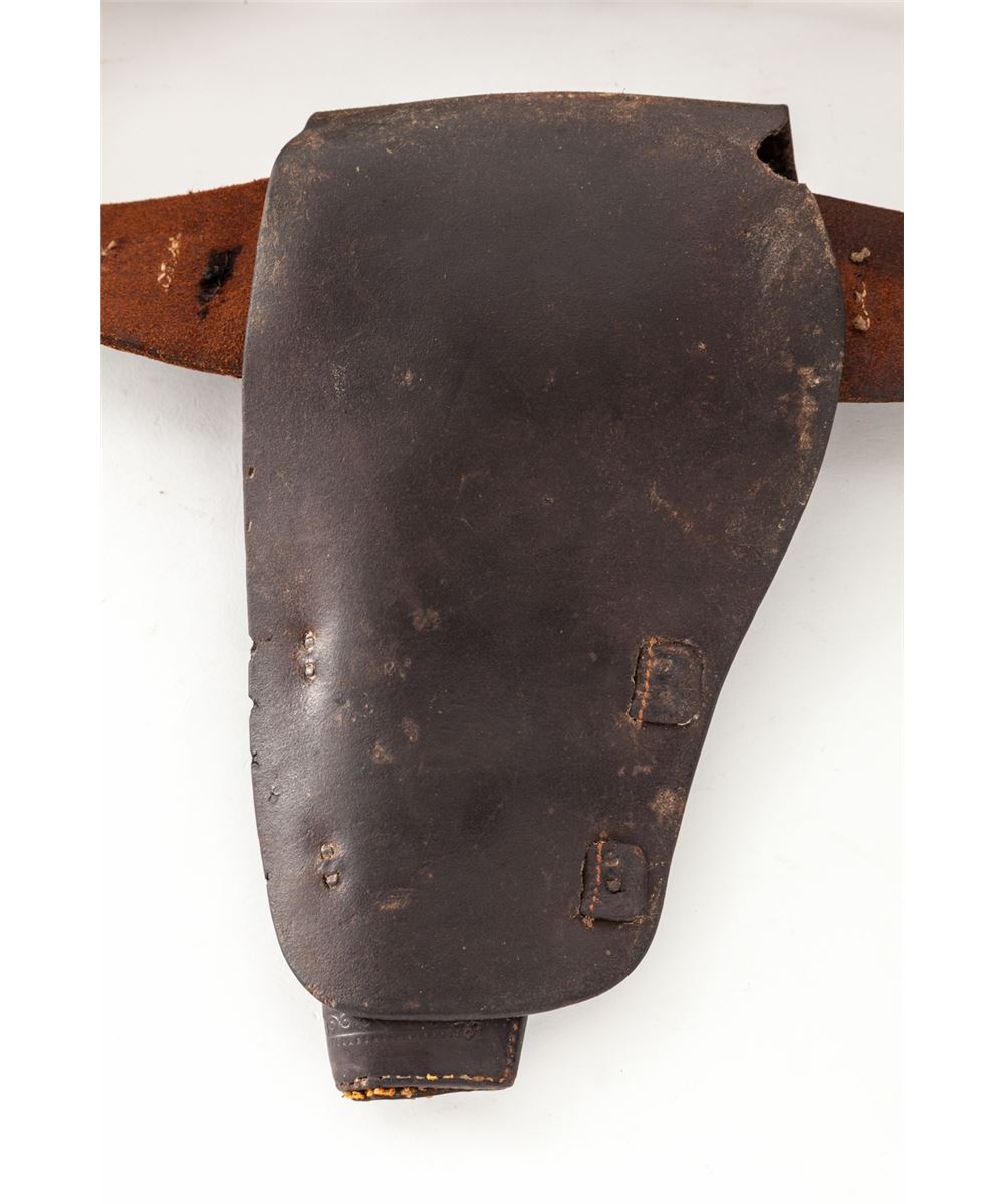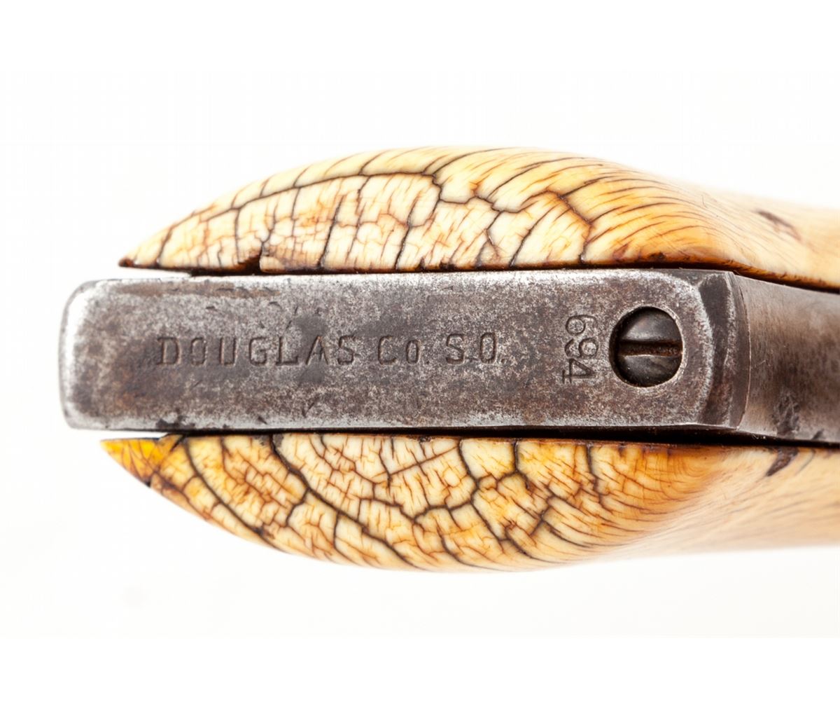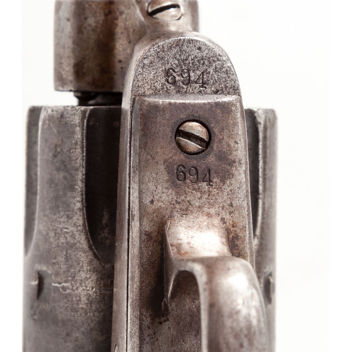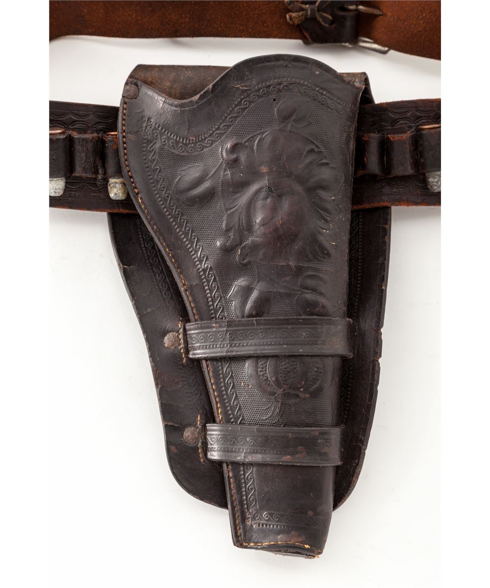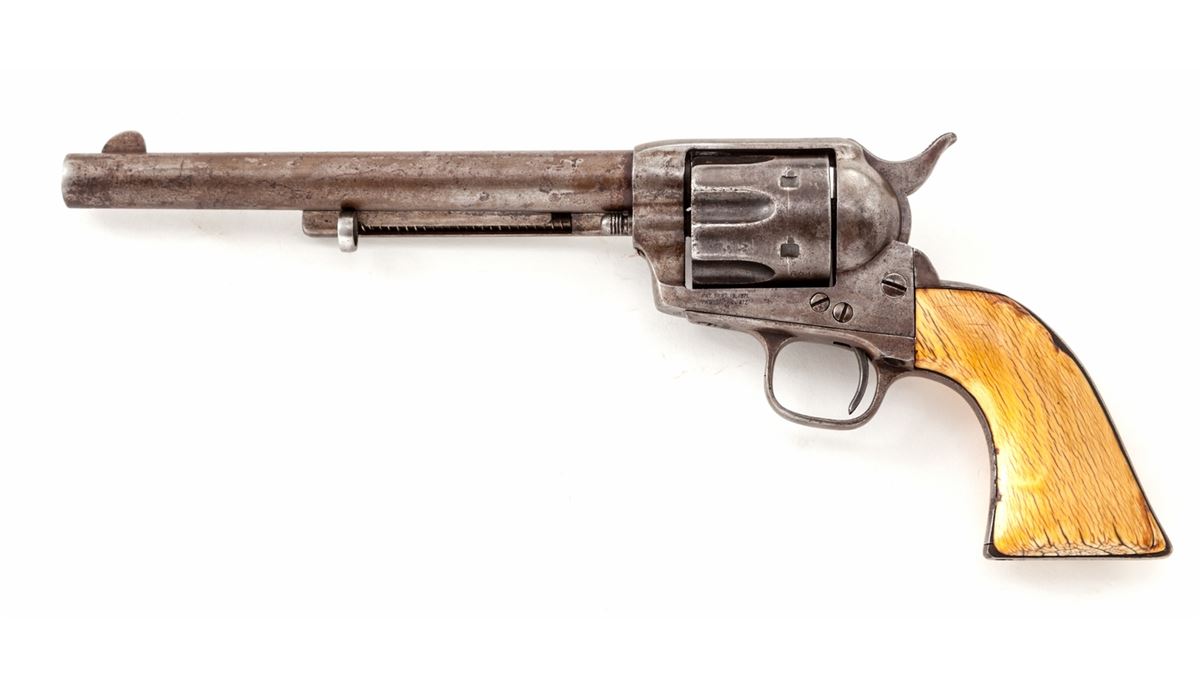 Scarce Colt Rimfire Single Action Revolver, #694, .44 RF (Henry) cal., 7-1/2'' barrel, blue and case hardened finish, with one-piece bone ivory grips. In period tooled leather belt and holster containing fifteen (15) .44 Henry RF cartridges. These revolvers are considered scarce with only approx. 1863 mfg'd, with most mfg'd between 1875-1878. Revolvers in this caliber show hard use due to the fact that because the cartridge was obsolete, many were shipped to foreign countries where hard use and little care was the norm. Many were later converted to .22 LR prior to their shipment. This particular example was shipped June 28, 1876, to Mayer & Geiger, Omaha, NE. Buttstrap later marked ''Douglas Co. SO'' (probably for Sheriff's office). Includes factory letter verifying caliber, barrel length and finish. Condition is about good retaining little original finish and showing possible later coloring to cylinder. Markings remain crisp. Grip panels have toned and show fractional overall shrinkage. Action is good, bore is very good. Period holster shows good detail to impressed design, with crazing and repairs to belt loops. Est.: $8,000-$12,000. (Antique)