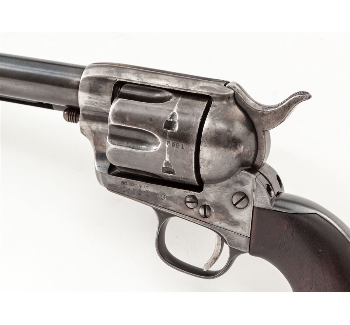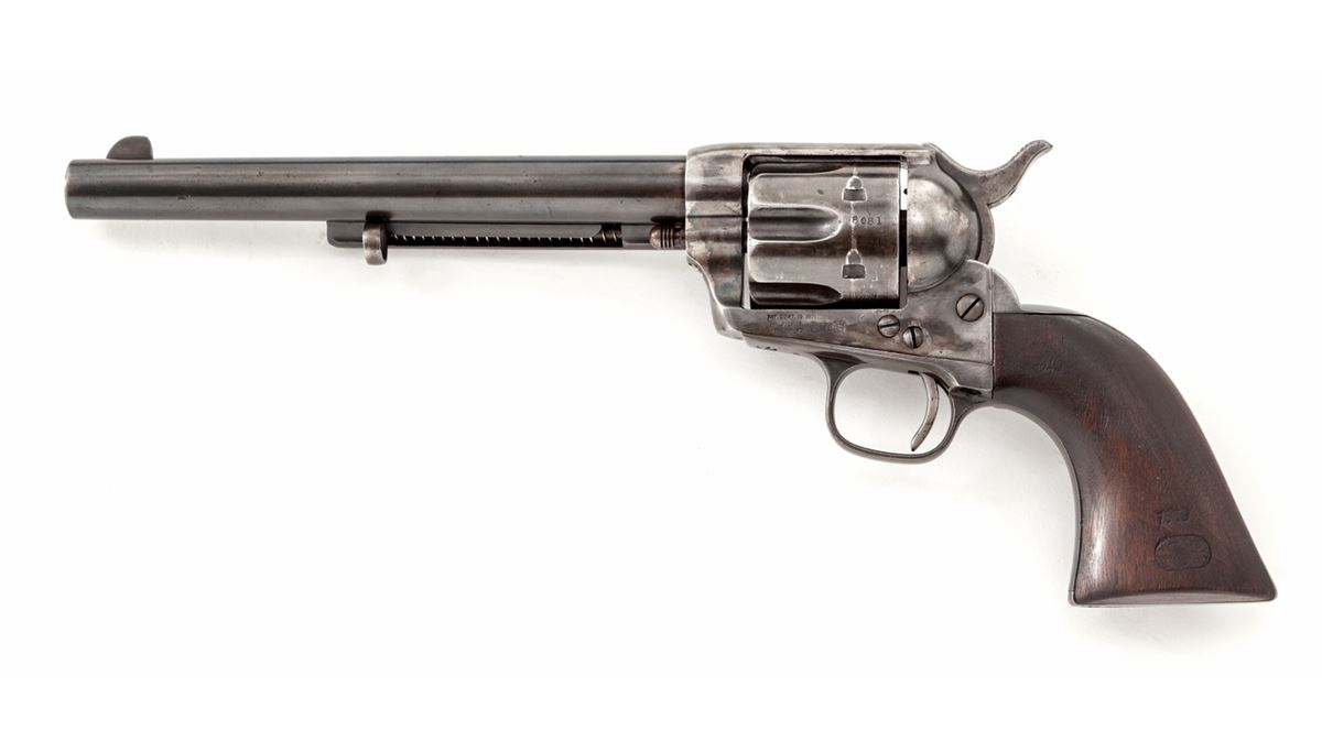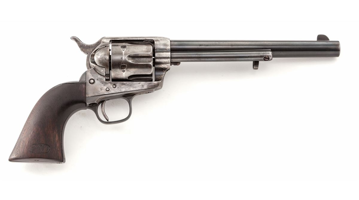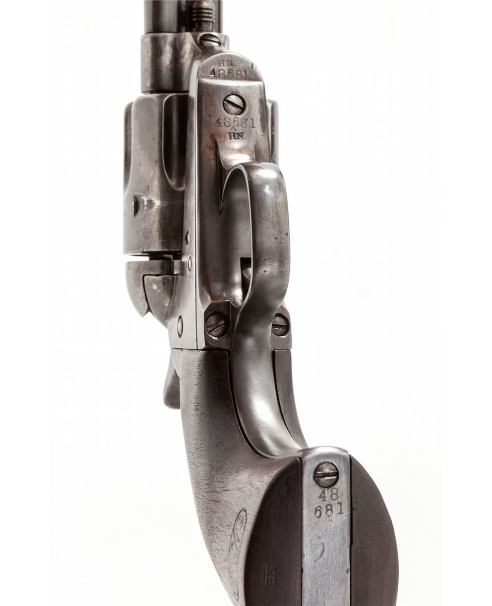 Henry Nettleton Inspected Colt Single Action Army Revolver, #48681, .45 Colt cal., 7-1/2'' barrel, blue and case hardened finish, with matching numbered triggerguard, backstrap, barrel, and replacement cartouched walnut grips. Originally shipped July 25, 1878, to the U.S. Gov't Inspector located at the Colt Plant, with factory letter. Condition is near fine showing some restorative work. Barrel and ejector rod housing have been refinished and show nice even thinning. ''HN'' marked cylinder has been renumbered to match. Bolt stop and forward triggerguard screws appear to be later replacements, and U.S. marking to left side of frame may have been re-cut. Replacement grips show well with crisp and accurate markings. Correct Nettleton marked hammer retains approx. 30% original muted case colors. Action is good, bore is fair. Est.: $4,500-$7,000. (Antique)