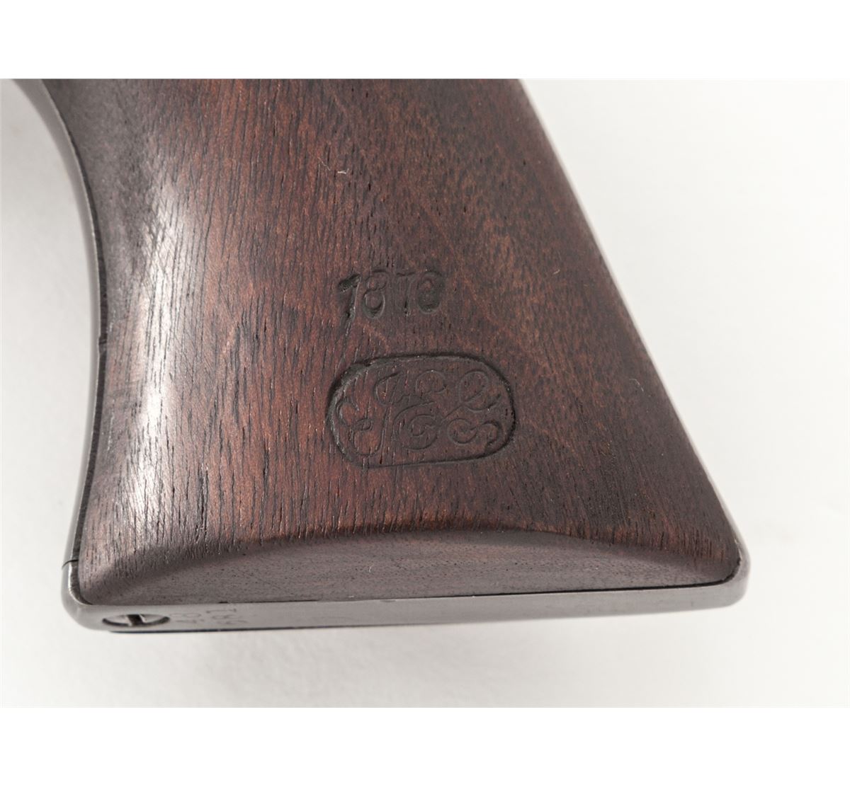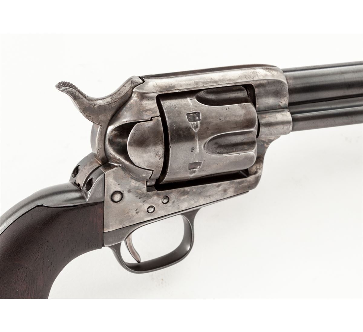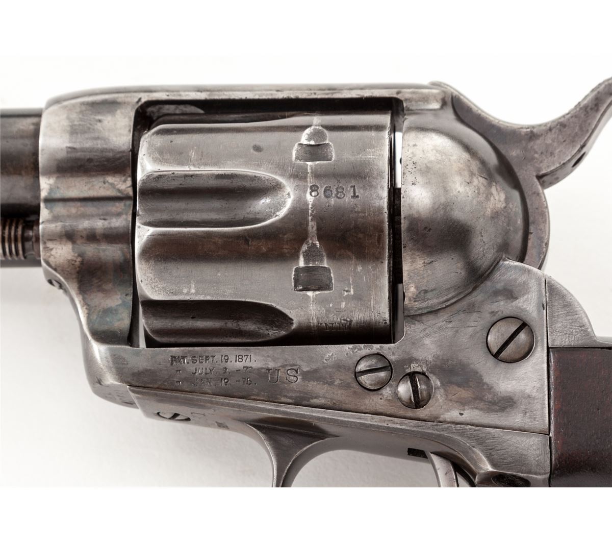 Henry Nettleton Inspected Colt Single Action Army Revolver, #48681, .45 Colt cal., 7-1/2'' barrel, blue and case hardened finish, with matching numbered triggerguard, backstrap, barrel, and replacement cartouched walnut grips. Originally shipped July 25, 1878, to the U.S. Gov't Inspector located at the Colt Plant, with factory letter. Condition is near fine showing some restorative work. Barrel and ejector rod housing have been refinished and show nice even thinning. ''HN'' marked cylinder has been renumbered to match. Bolt stop and forward triggerguard screws appear to be later replacements, and U.S. marking to left side of frame may have been re-cut. Replacement grips show well with crisp and accurate markings. Correct Nettleton marked hammer retains approx. 30% original muted case colors. Action is good, bore is fair. Est.: $4,500-$7,000. (Antique)