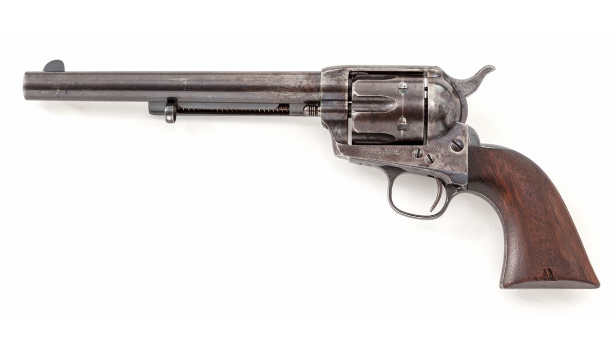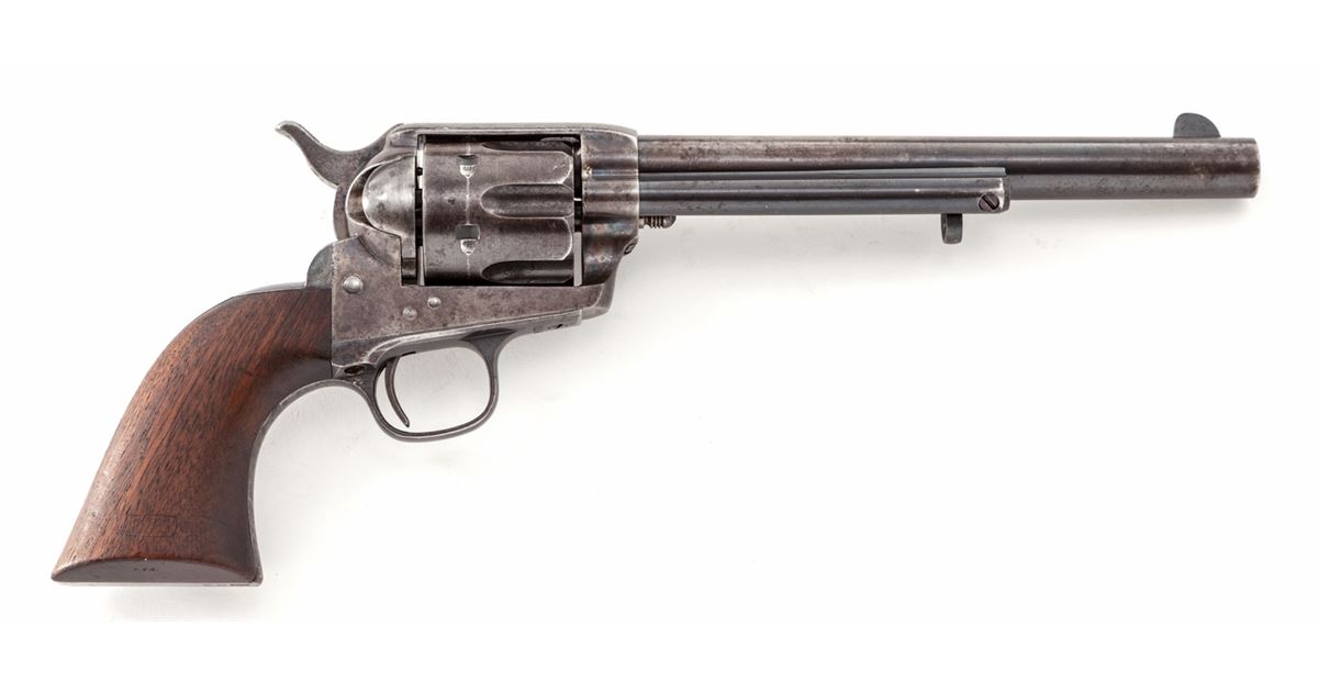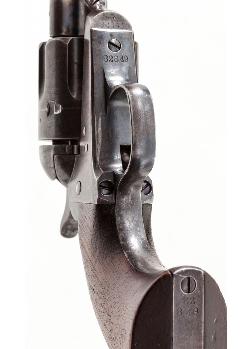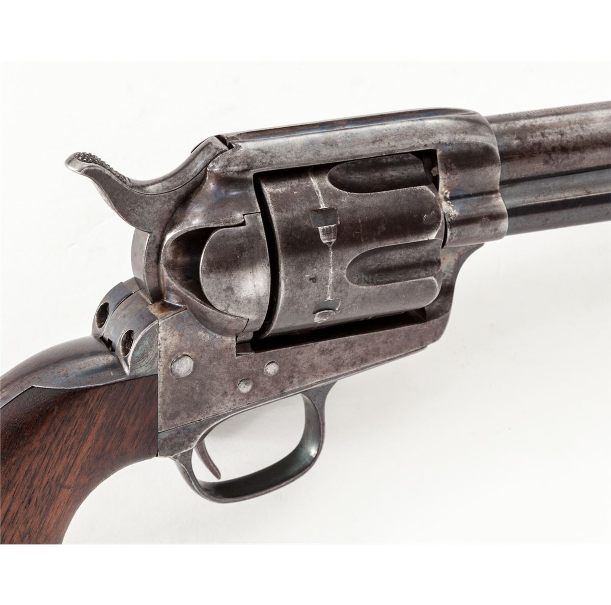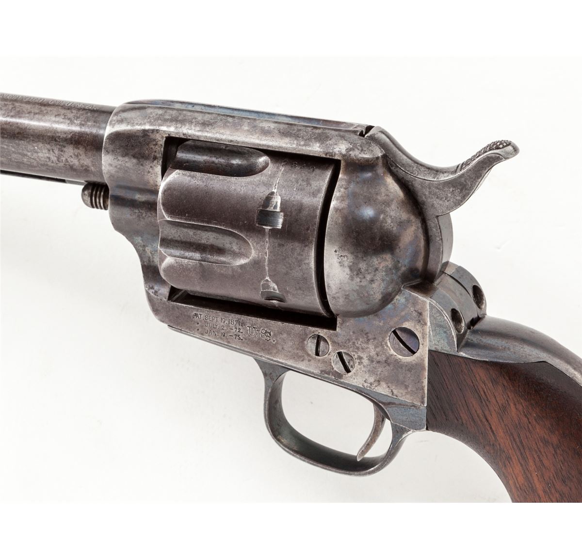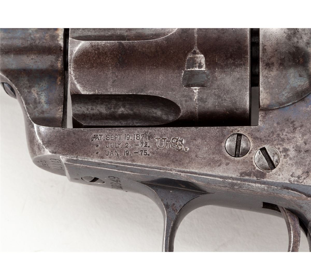 Colt Cavalry Single Action Army Revolver, #82849, .45 Colt cal., 7-1/2'' barrel, blue and case hardened finish, with 1882 dated one-piece walnut grips inspected by John E. Greer. All matching numbered parts including barrel and grips. Frame and barrel with ''DFC'' sub-inspector markings. The original contract for these revolvers was dated August 18, 1882, and was for just 1000 revolvers. A good majority were converted into Artillery models with originally configured 7-1/2'' versions being quite scarce. Condition is about fine. Barrel, cylinder and straps retain 75%-80% original thinning blue. Markings remain crisp. U.S. to left side of frame is double stamped. Grips with clear cartouches with even thinning and small loss at left side near butt. Action is crisp, bore is fine. A fine all-matching example of a difficult-to-find unaltered Cavalry Model. Est.: $12,000-$18,000. (Antique)