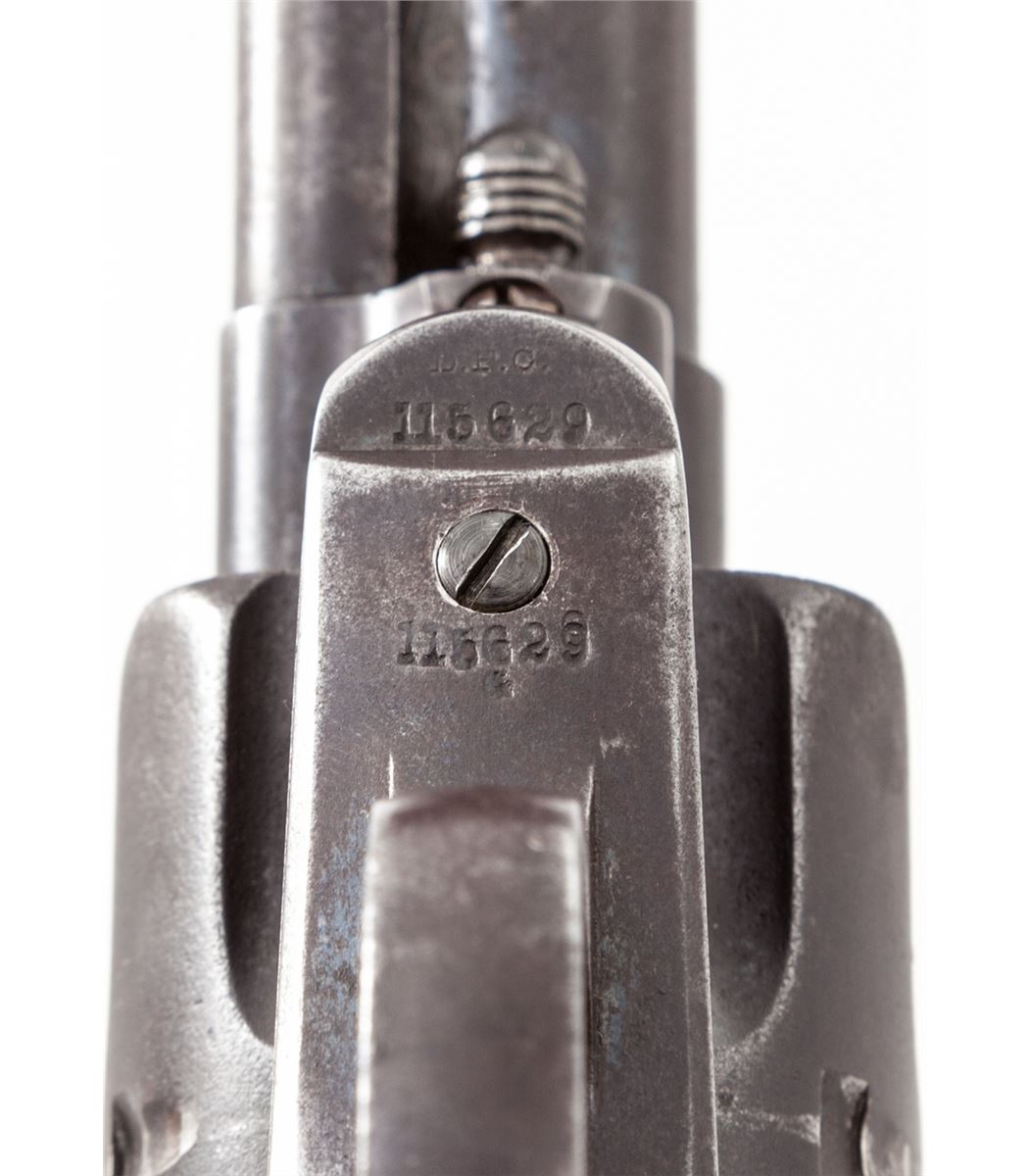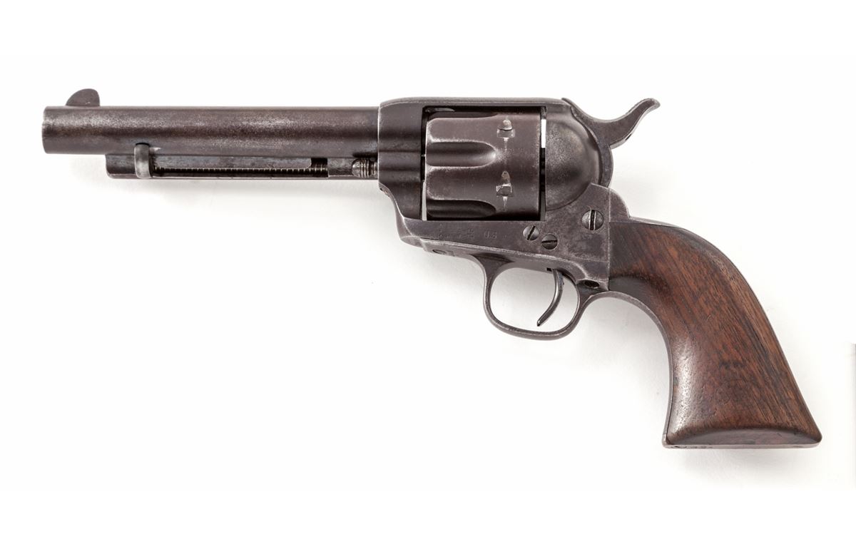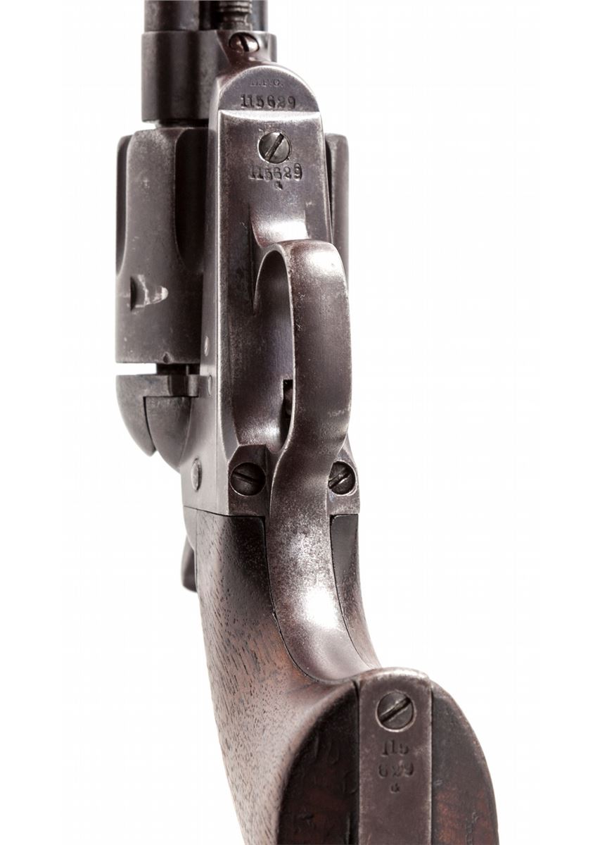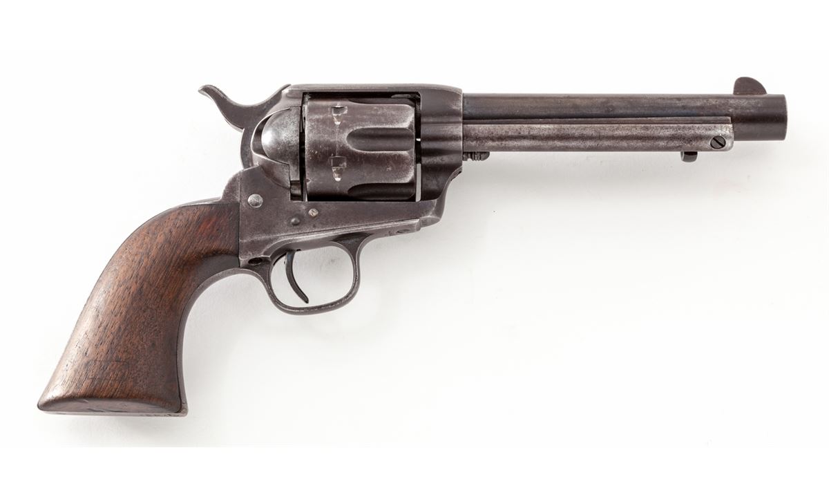 Colt 1st Type Artillery Model Single Action Revolver, #115629, .45 Colt cal. 5-1/2'' barrel, blue and case hardened finish, with one-piece Frank Heath cartouched walnut grips dated 1885. Revolver originally left the factory Oct. 14, 1885, in a 50-gun shipment, and was turned over to the U.S. Gov't Inspector, with 1983 dated factory letter. Revolver was later reconfigured with a 5-1/2'' barrel, but all matching serial numbers and original grips were retained. Barrel marked beneath ejector rod housing ''5629''. Many Artillery revolvers in this serial number range were fielded with the 1st U.S. Volunteer Cavalry (Rough Riders) and were issued in June 1898. This revolver's serial number falls in between known Rough Rider serial numbers 115564 and 115739, both of which were modified by Colt on 1-31-1896. (See page 11 of the book, ''Cavalry & Artillery Revolvers'', by Kopec and Fenn.) Condition is very good with 1898 factory finish toning a gray/brown. Grips with even general thinning but clear date and ''FH'' circled cartouche. Action is crisp, bore is very good. A nice example of one of the scarcest Artillery type revolvers known. Est.: $4,500-$6,000. (Antique)