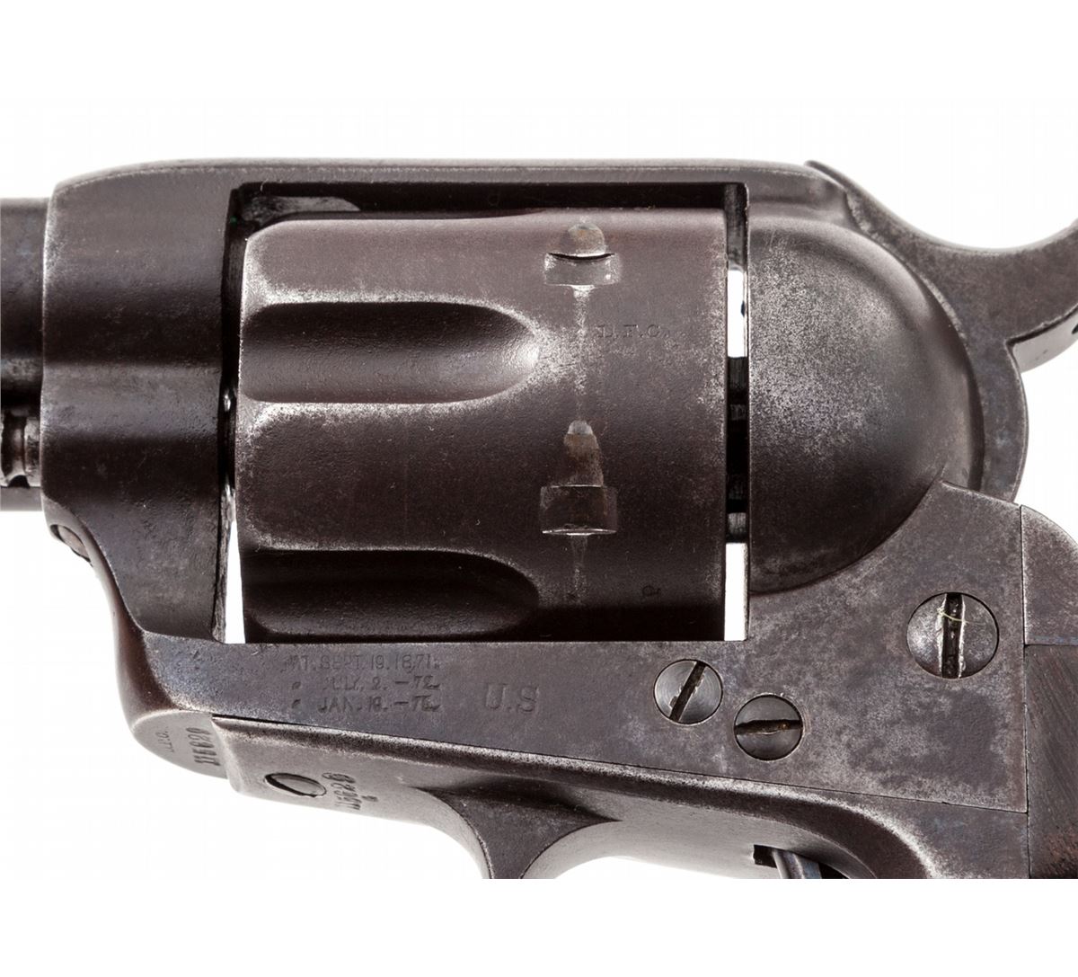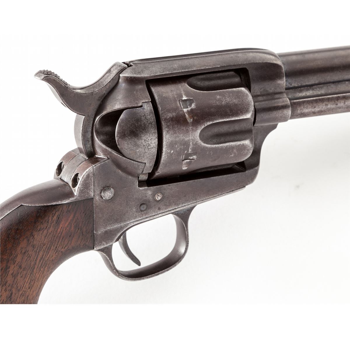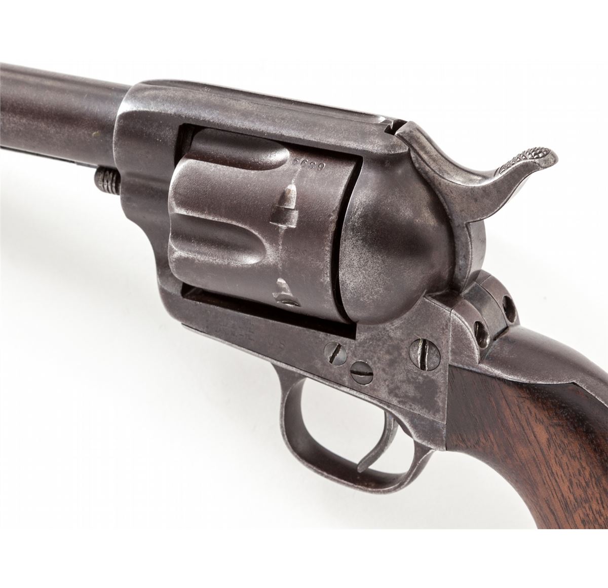 Colt 1st Type Artillery Model Single Action Revolver, #115629, .45 Colt cal. 5-1/2'' barrel, blue and case hardened finish, with one-piece Frank Heath cartouched walnut grips dated 1885. Revolver originally left the factory Oct. 14, 1885, in a 50-gun shipment, and was turned over to the U.S. Gov't Inspector, with 1983 dated factory letter. Revolver was later reconfigured with a 5-1/2'' barrel, but all matching serial numbers and original grips were retained. Barrel marked beneath ejector rod housing ''5629''. Many Artillery revolvers in this serial number range were fielded with the 1st U.S. Volunteer Cavalry (Rough Riders) and were issued in June 1898. This revolver's serial number falls in between known Rough Rider serial numbers 115564 and 115739, both of which were modified by Colt on 1-31-1896. (See page 11 of the book, ''Cavalry & Artillery Revolvers'', by Kopec and Fenn.) Condition is very good with 1898 factory finish toning a gray/brown. Grips with even general thinning but clear date and ''FH'' circled cartouche. Action is crisp, bore is very good. A nice example of one of the scarcest Artillery type revolvers known. Est.: $4,500-$6,000. (Antique)