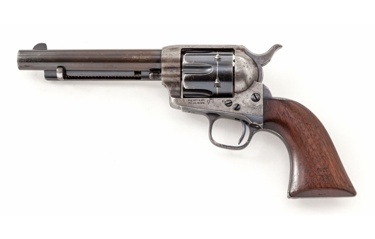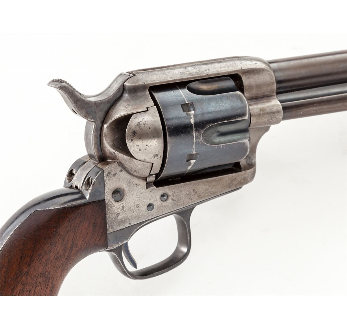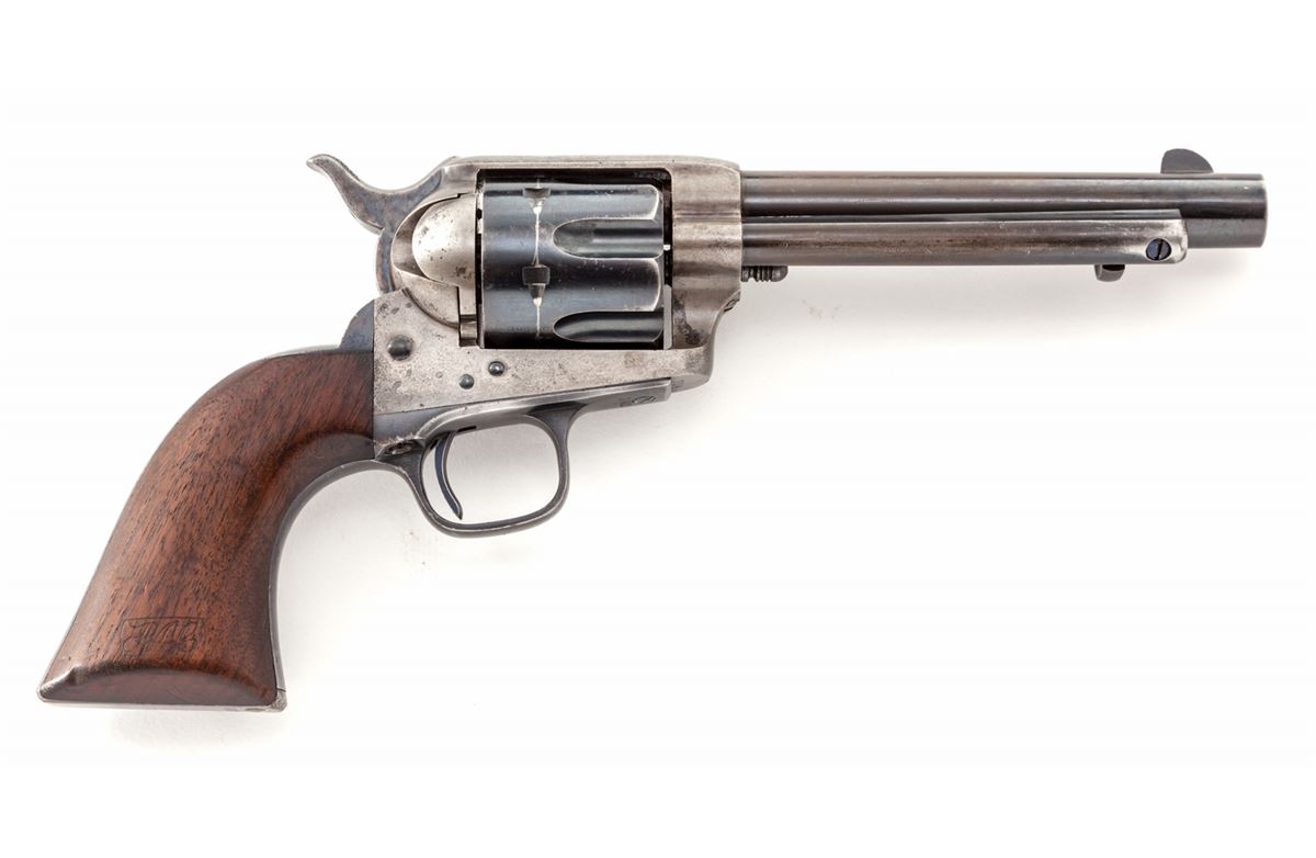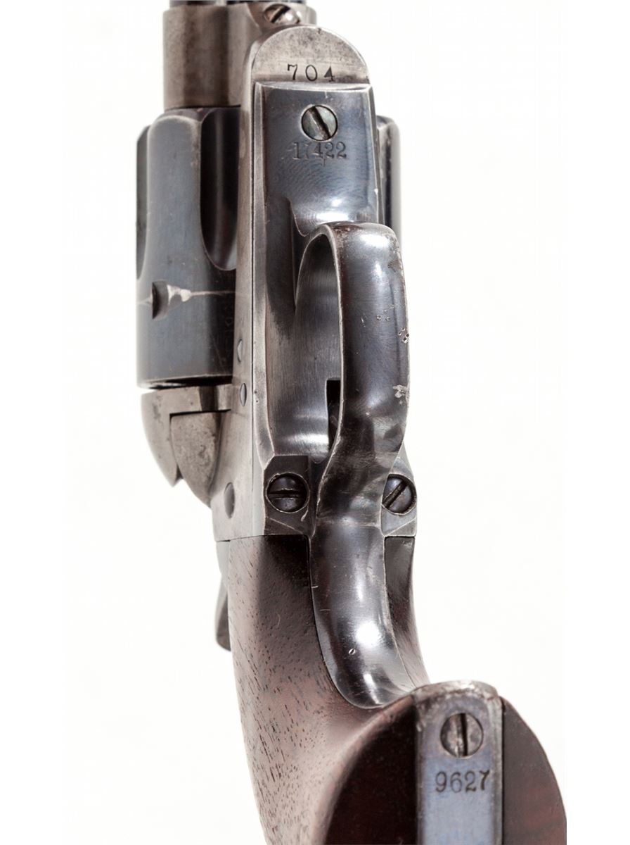 High Condition Mixed Numbered Colt Artillery Single Action Revolver, #704, .45 Colt cal., 5-1/2'' barrel, blue and case hardened finish, one-piece 1901 cartouched walnut grips with ''OCH'' and ''RAC'' inspector's markings. Triggerguard is serialized #17422, backstrap is #9627, cylinder is #50596 with Henry Nettleton inspector's markings. Condition is near excellent. Barrel retains approx. 40% blue; cylinder approx. 85%. Backstrap and triggerguard show mild to just moderate thinning to finish. Case hardened frame has mostly silvered with very light speckling. Case hardened hammer retains approx. 85% vivid hues. Grips with nice cartouches to both sides and only mild oil darkening near frame. Action is crisp, bore is fine. A high condition example from the late Spanish-American War period. Est.: $8,000-$12,000. (Antique)