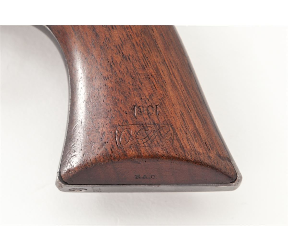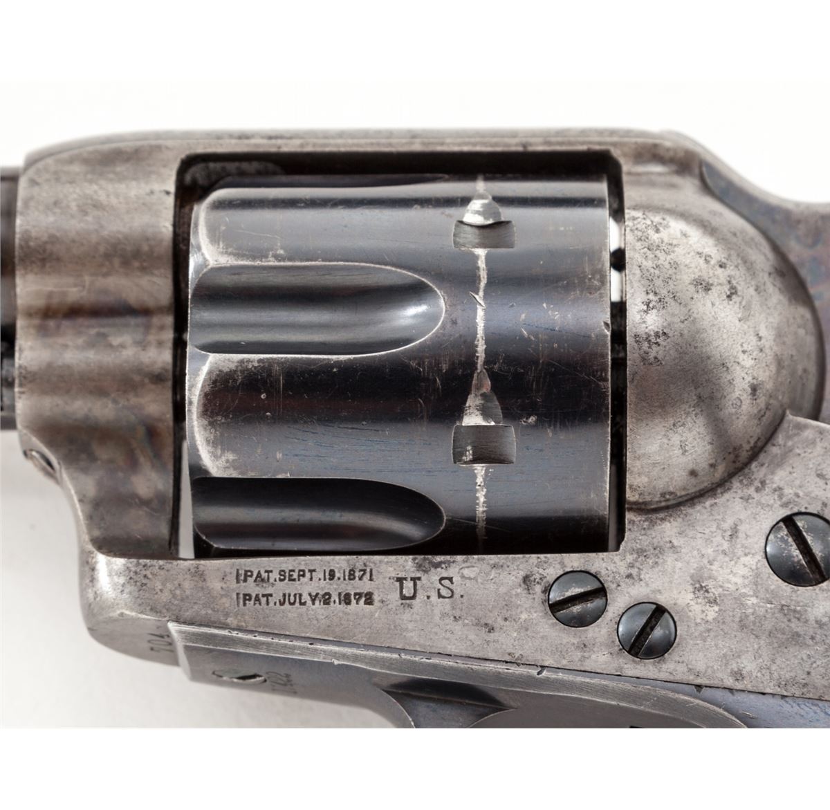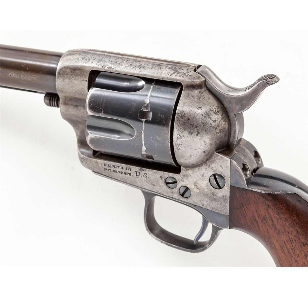 High Condition Mixed Numbered Colt Artillery Single Action Revolver, #704, .45 Colt cal., 5-1/2'' barrel, blue and case hardened finish, one-piece 1901 cartouched walnut grips with ''OCH'' and ''RAC'' inspector's markings. Triggerguard is serialized #17422, backstrap is #9627, cylinder is #50596 with Henry Nettleton inspector's markings. Condition is near excellent. Barrel retains approx. 40% blue; cylinder approx. 85%. Backstrap and triggerguard show mild to just moderate thinning to finish. Case hardened frame has mostly silvered with very light speckling. Case hardened hammer retains approx. 85% vivid hues. Grips with nice cartouches to both sides and only mild oil darkening near frame. Action is crisp, bore is fine. A high condition example from the late Spanish-American War period. Est.: $8,000-$12,000. (Antique)